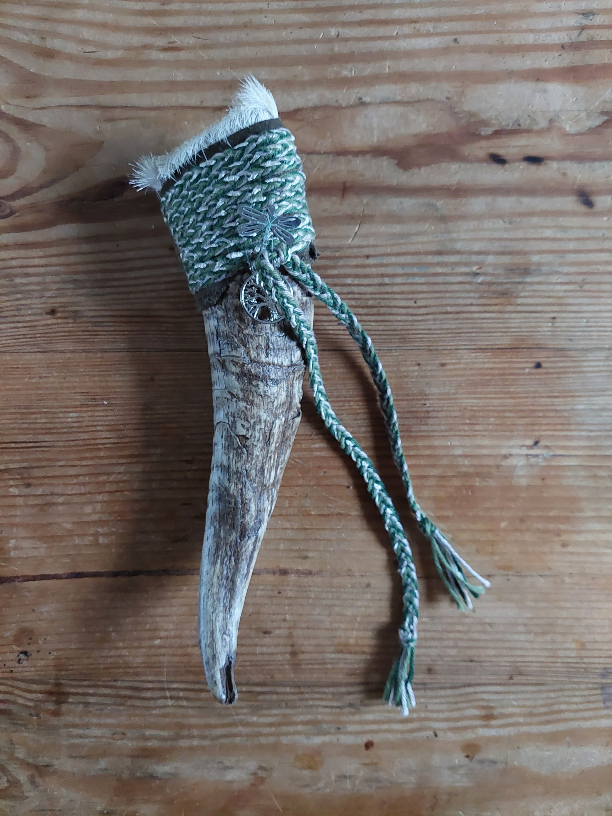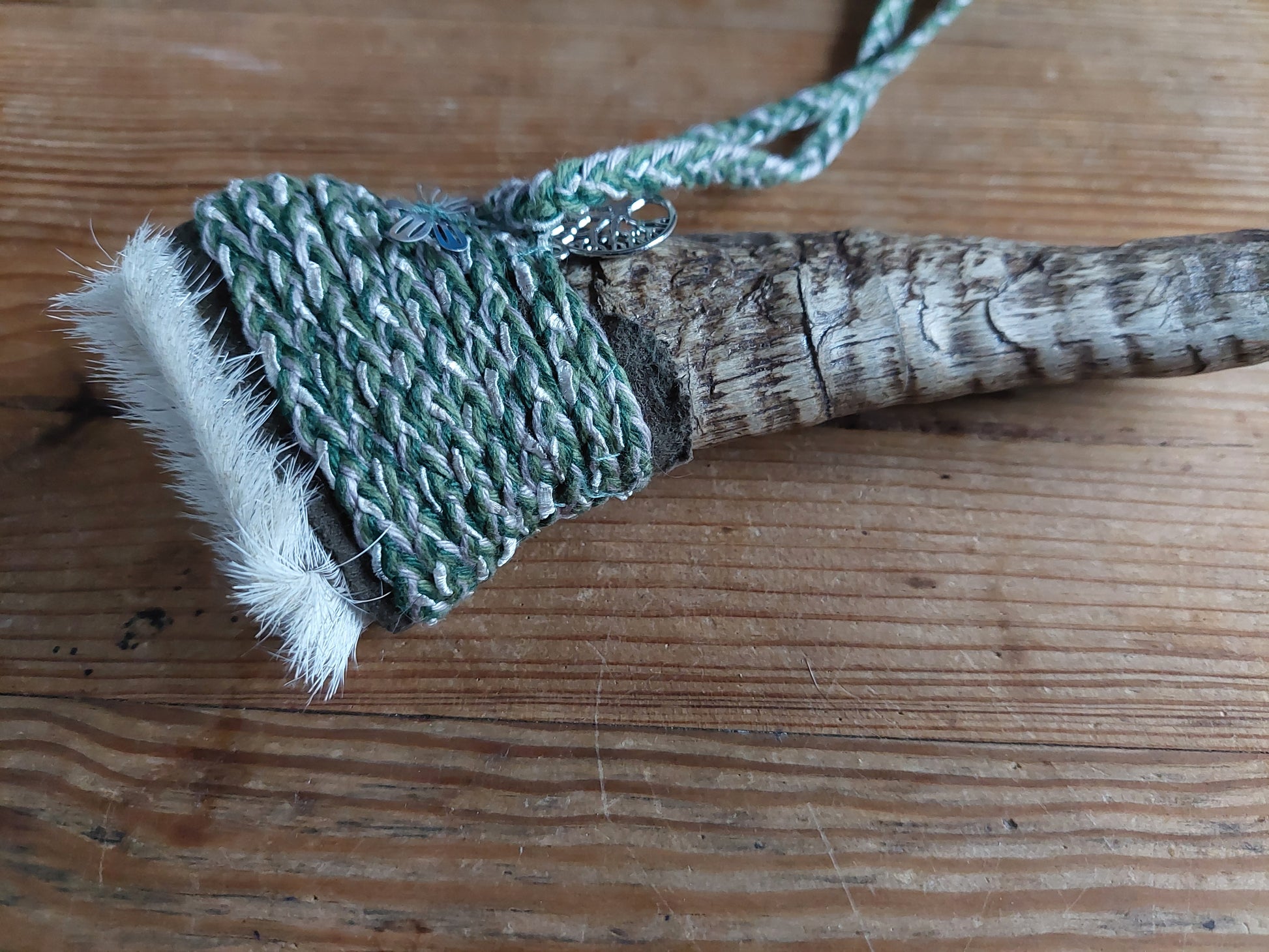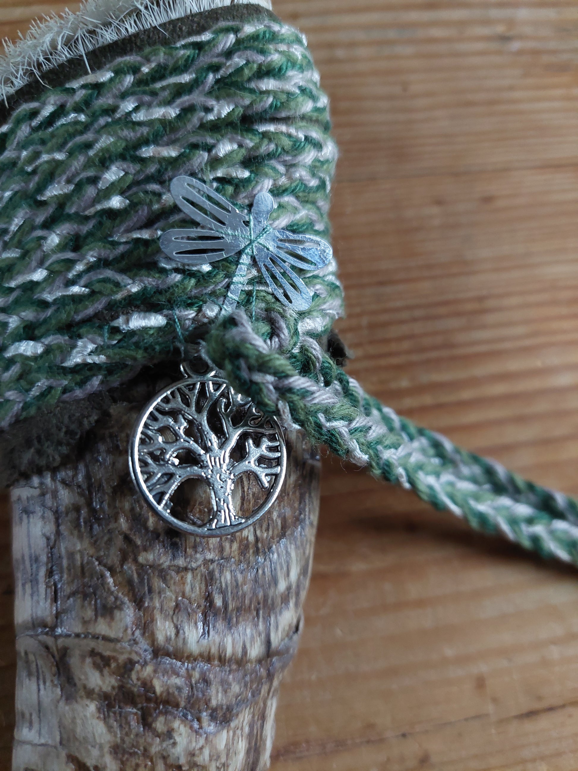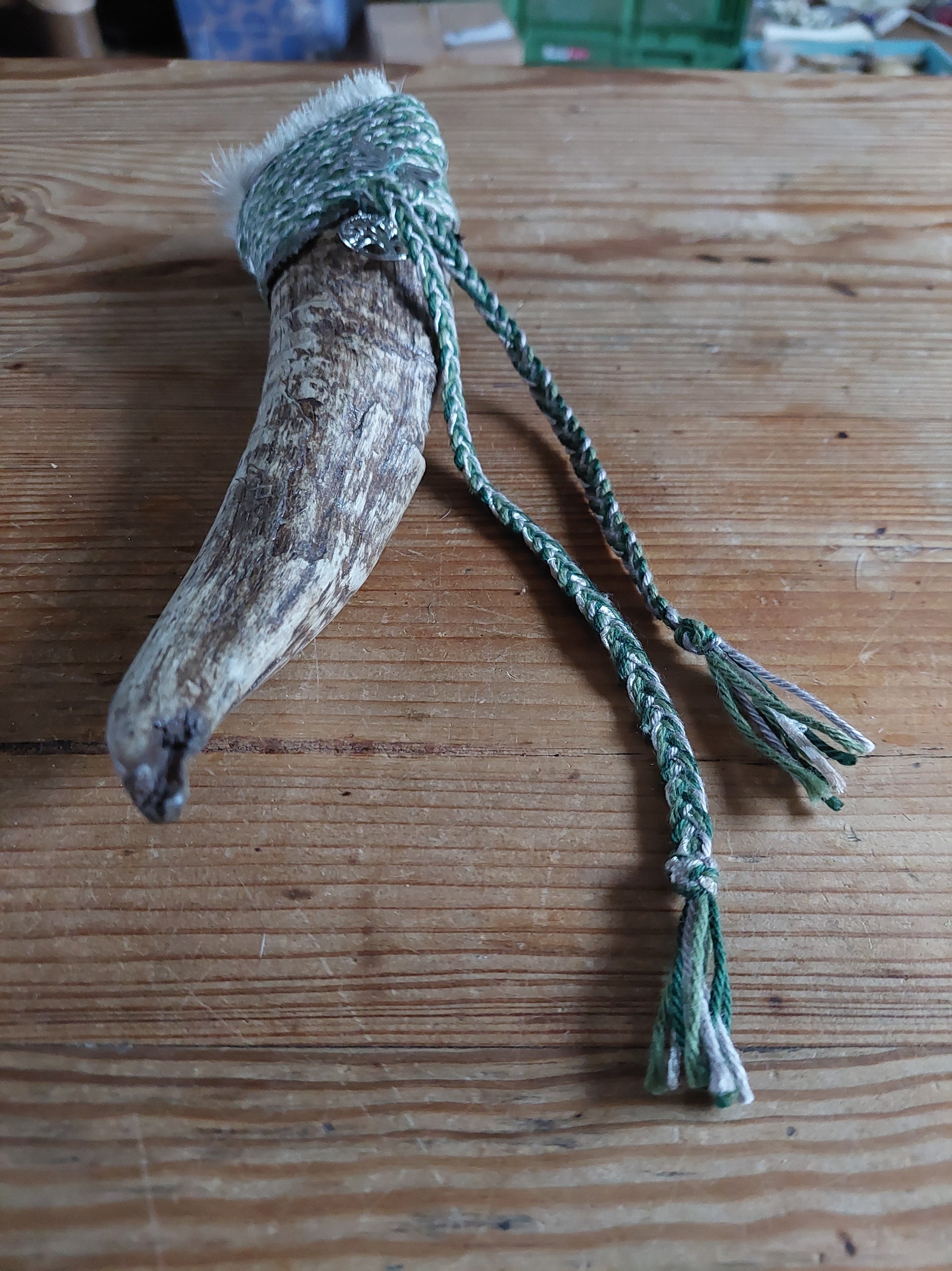 The rattle is decorated with a colorful braid, made from 9 strands of 100% cotton in the colors green, white and grey. During the braiding, only the best of intentions and blessings were put in.