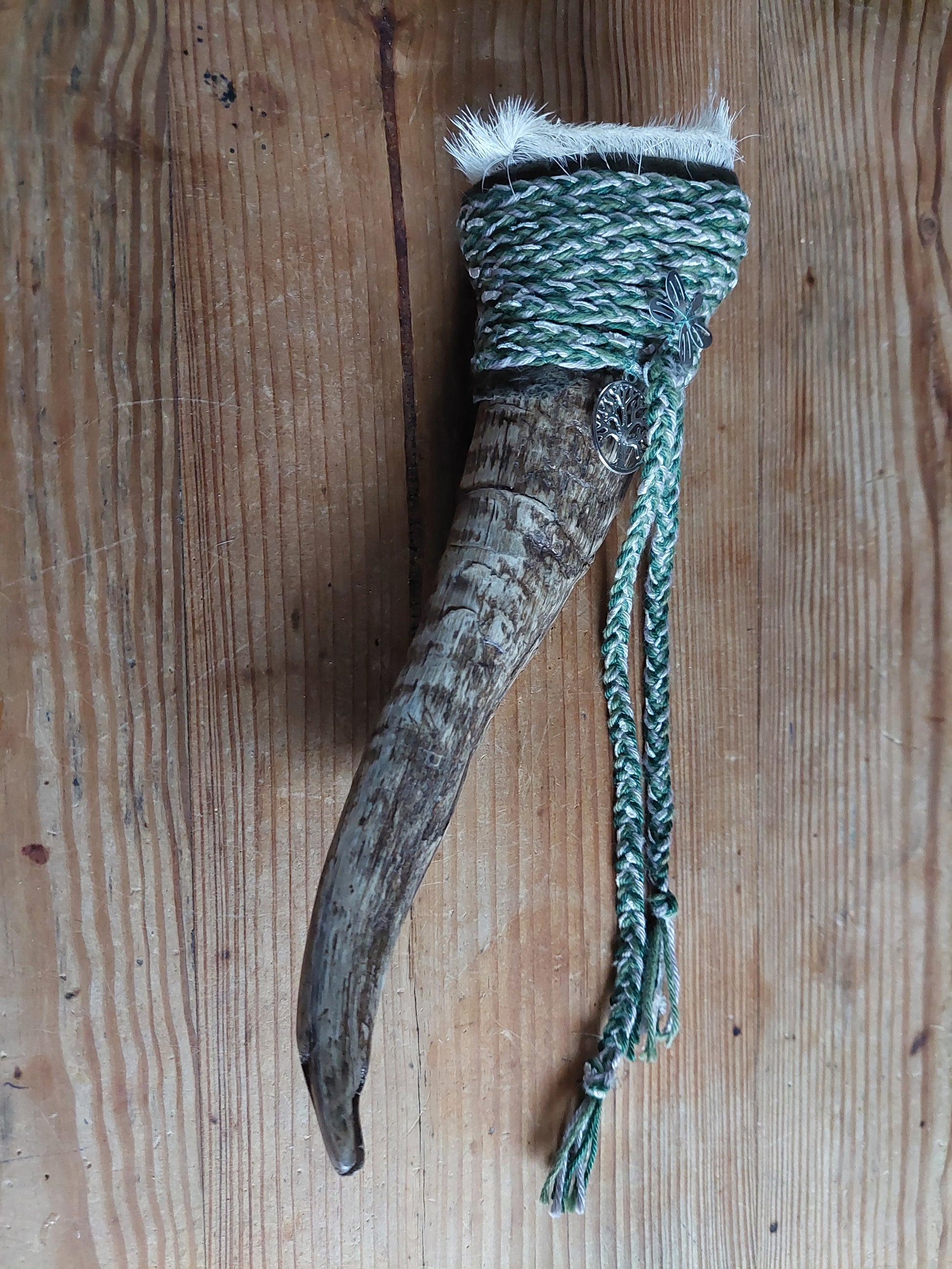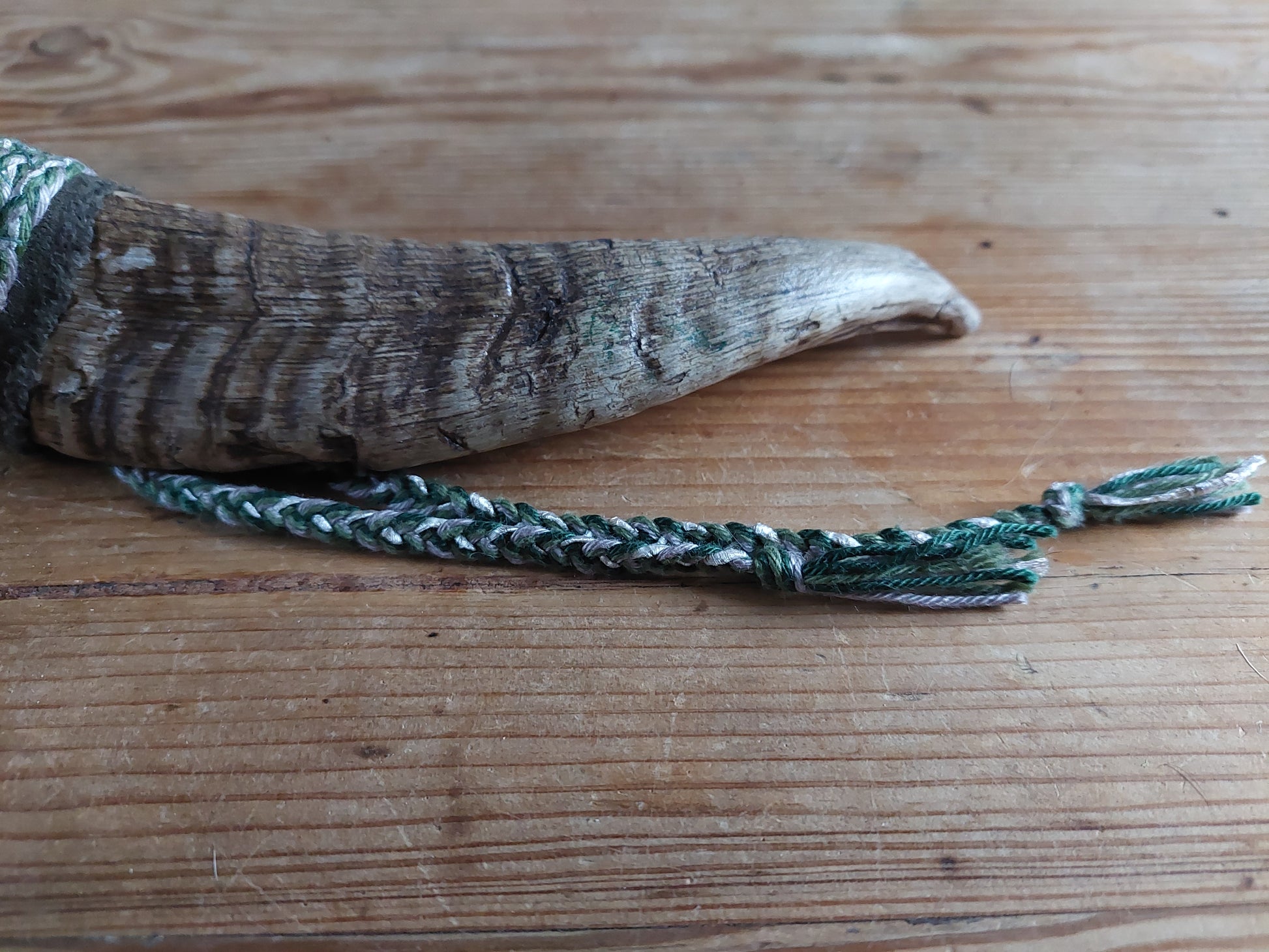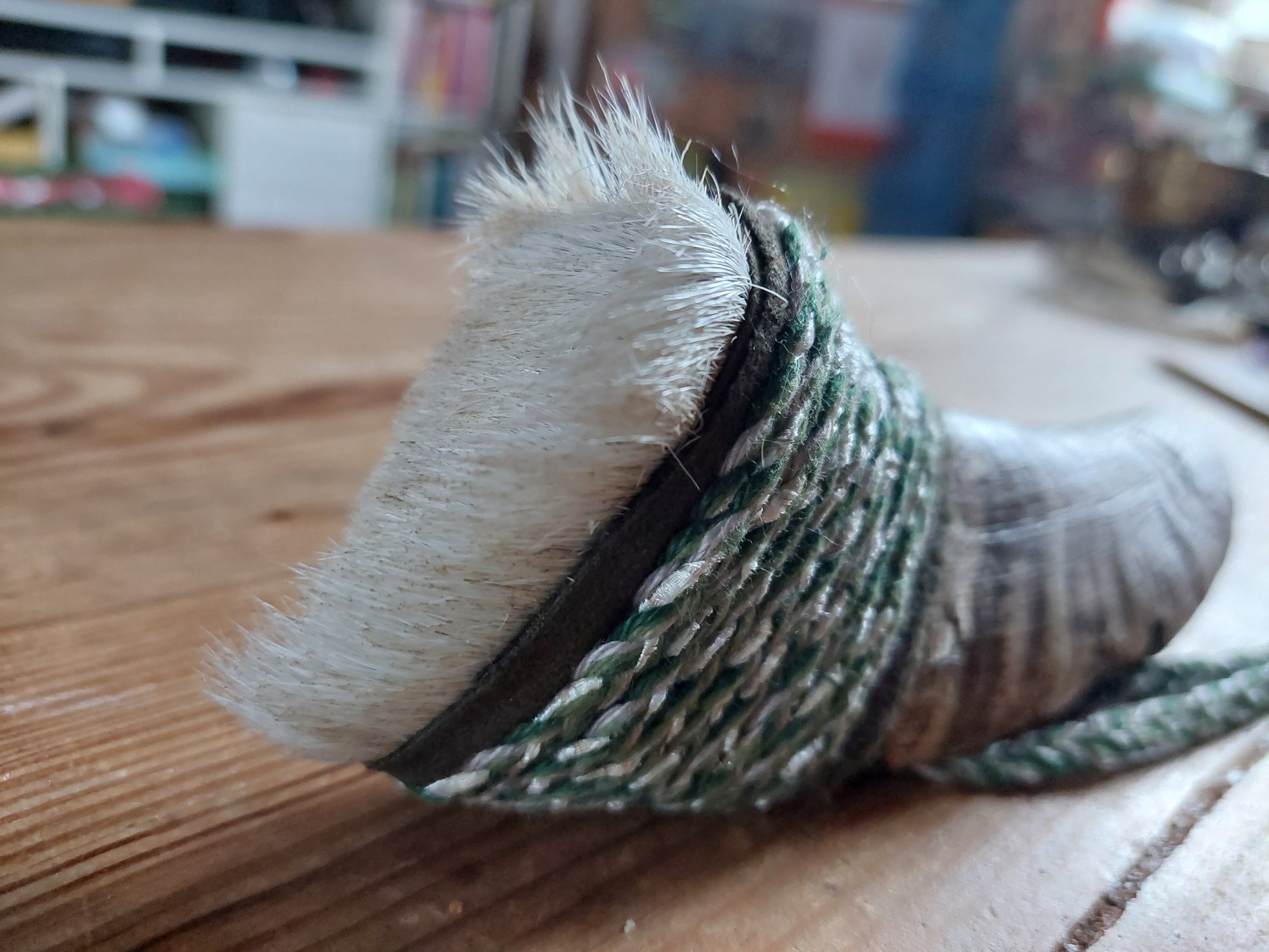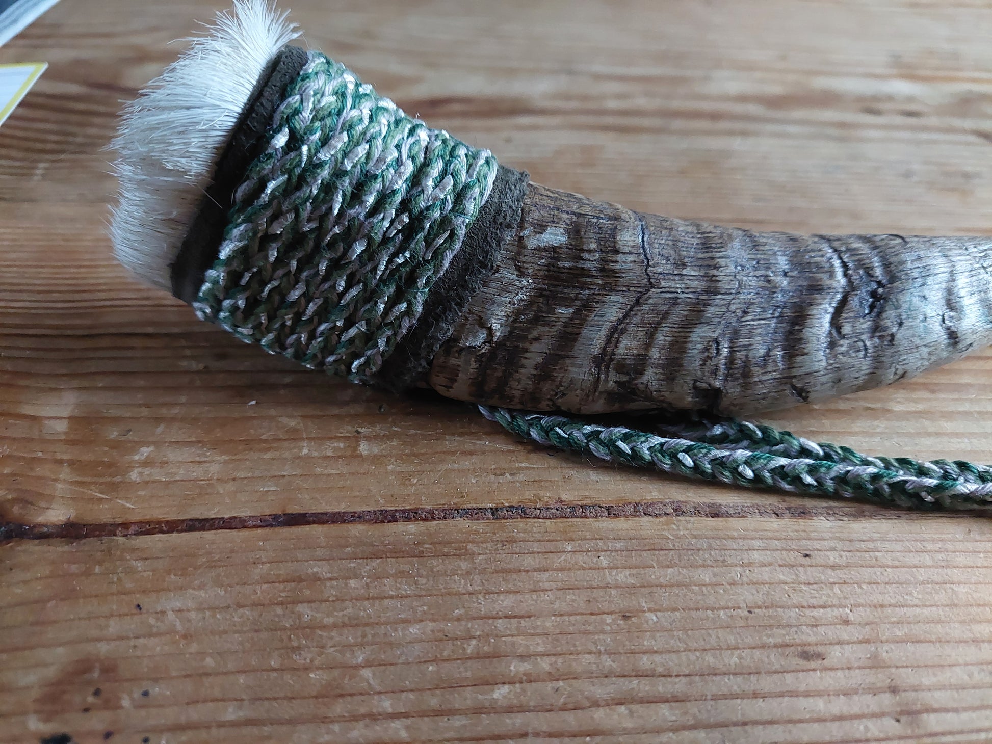 To cover the horn, a piece of hide (with hair) from goat has been used. This hide is acquired as scrap material from an artisan drum maker.
