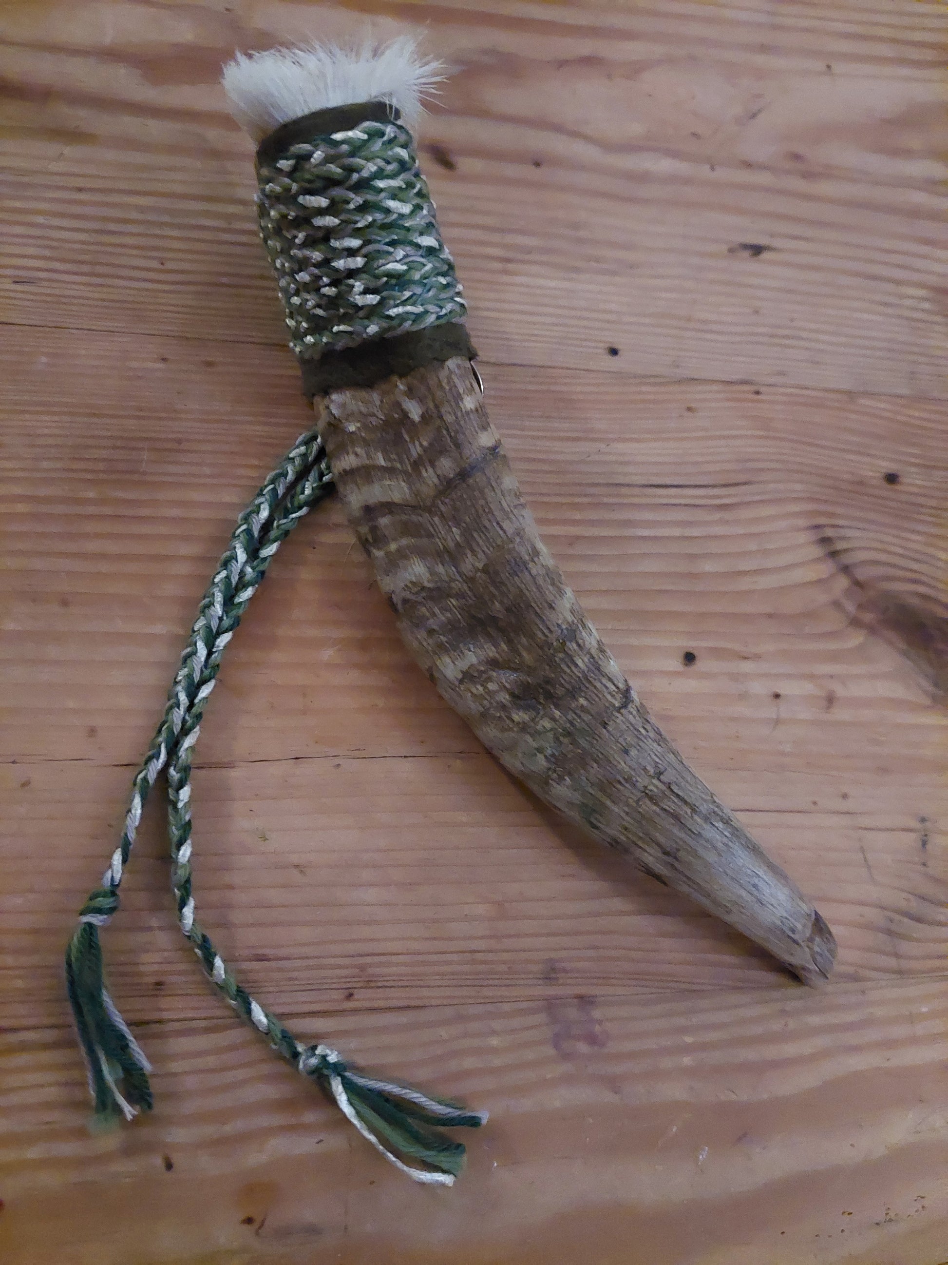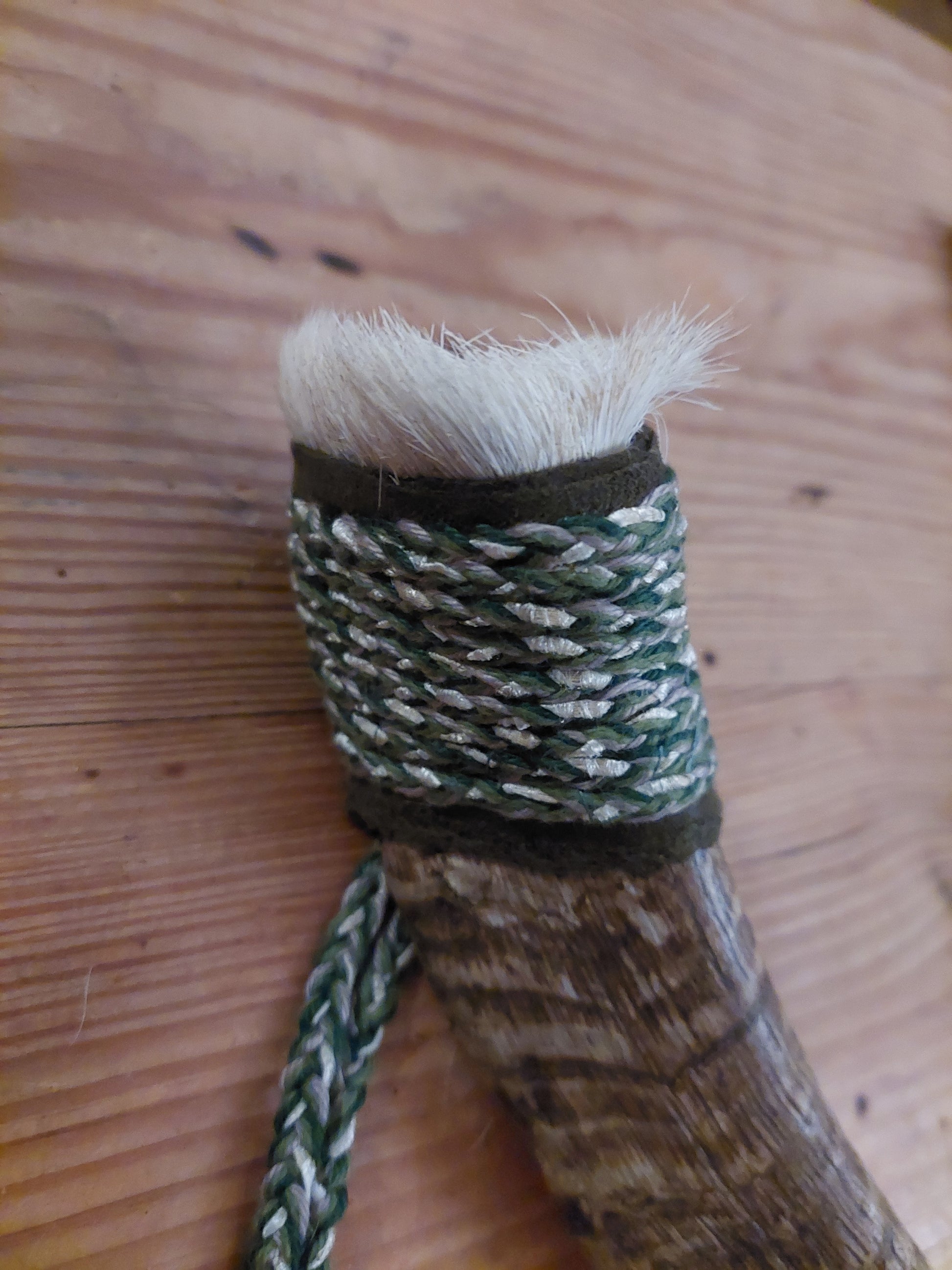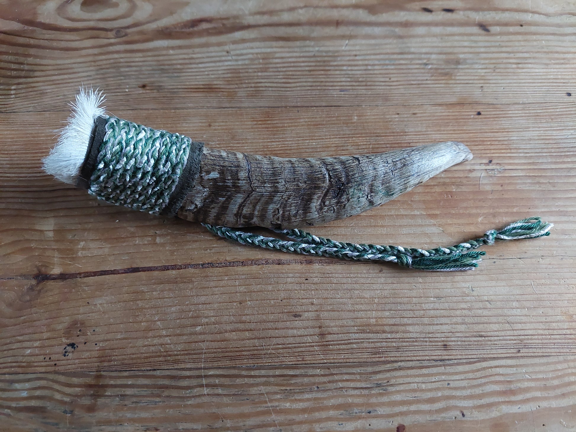 To cover the horn, a piece of hide (with hair) from goat has been used. This hide is acquired as scrap material from an artisan drum maker.
