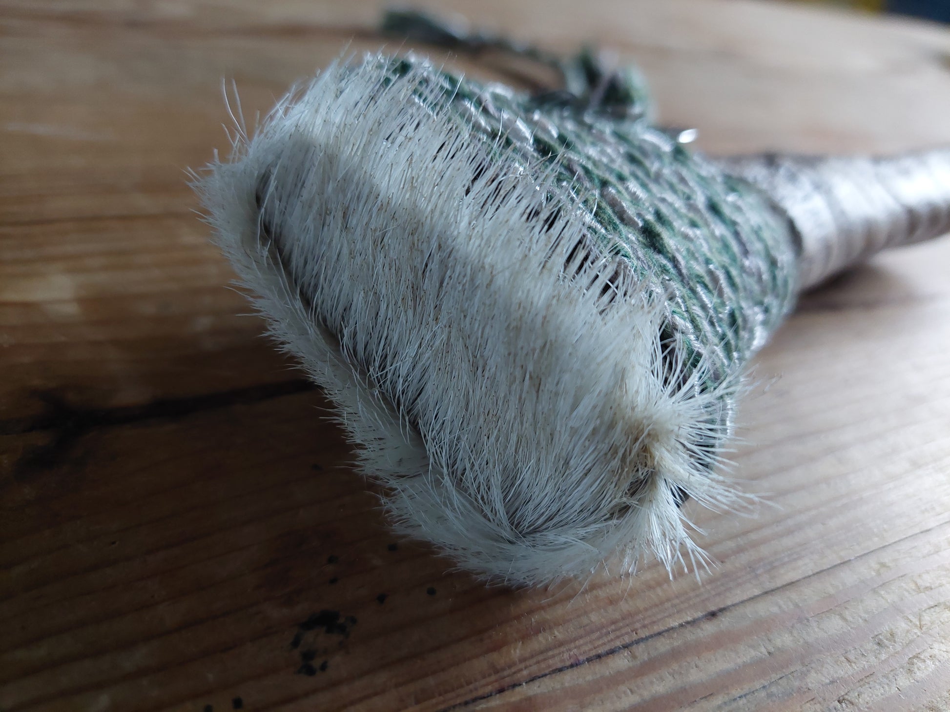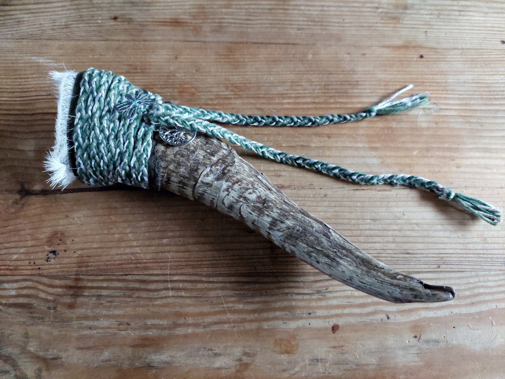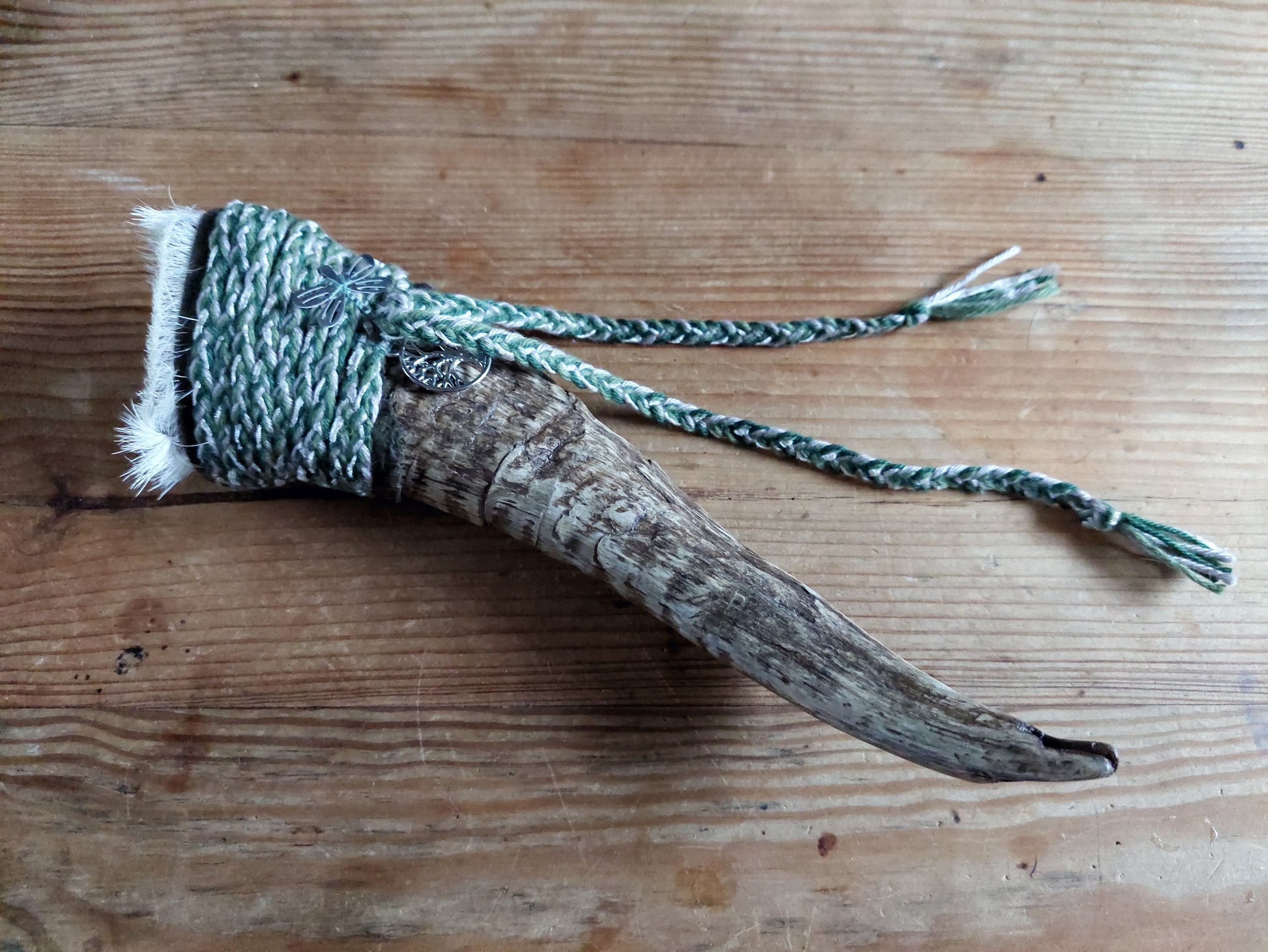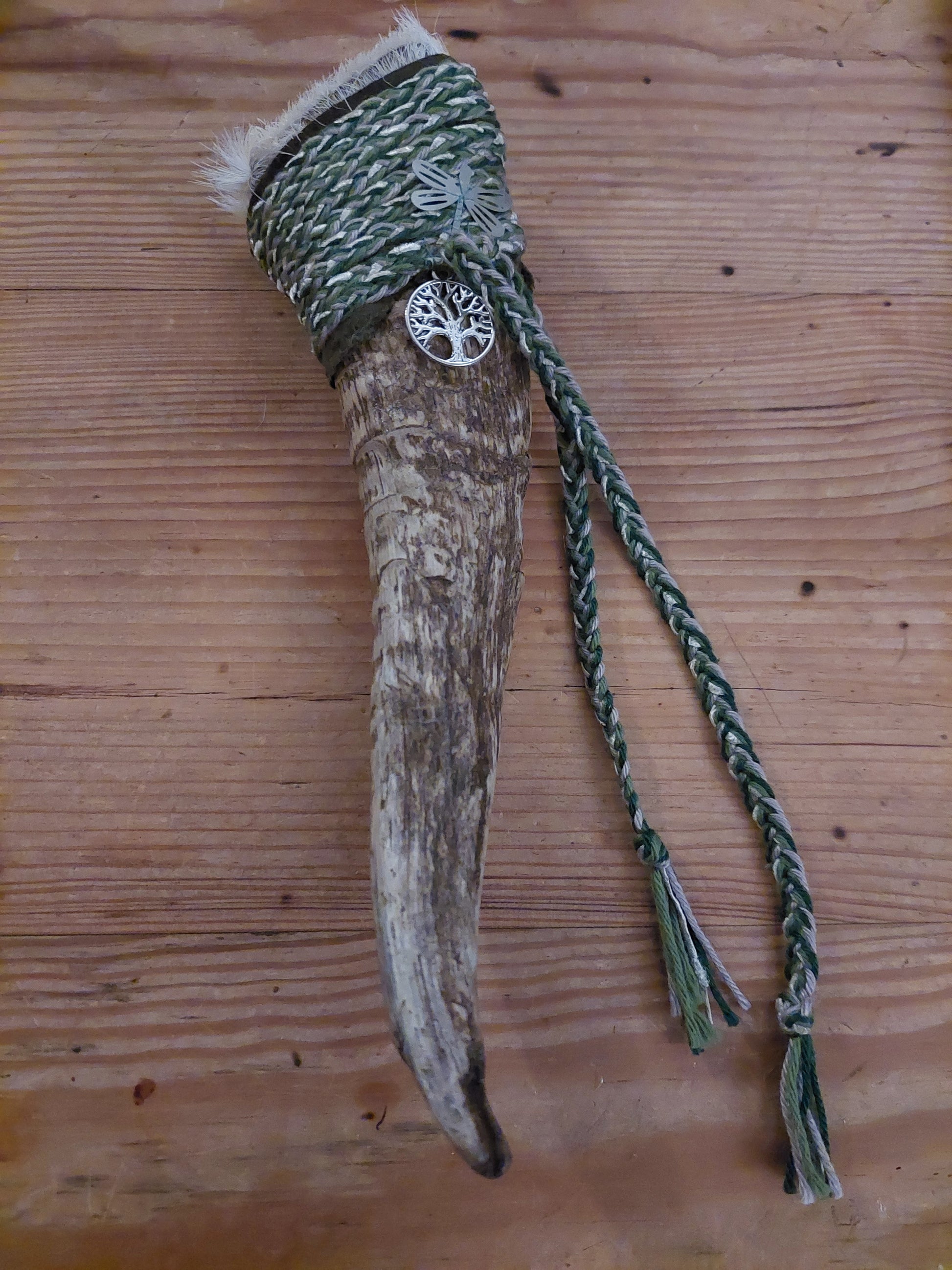 To cover the horn, a piece of hide (with hair) from goat has been used. This hide is acquired as scrap material from an artisan drum maker.