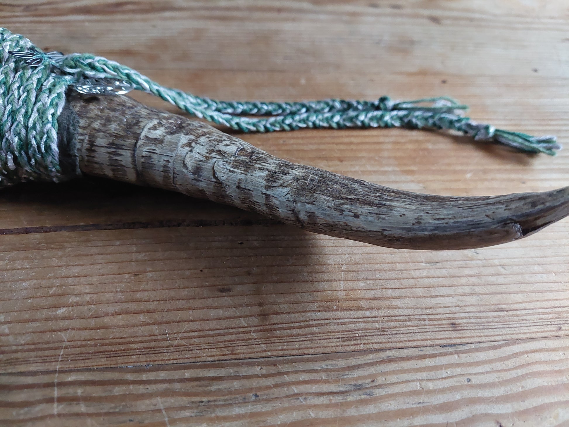 Rattle made with an old horn from a Hungarian racka sheep. This horn is in lovely, 'vintage' condition with some damages due to its age, which we think only makes it more beautiful. To prevent the horn from further ageing, a light layer of transparent coat has been brought on.