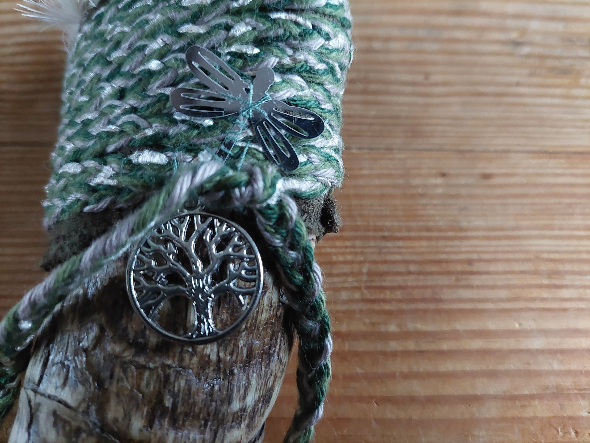 Also used for decoration is a 925 sterling silver pendant with the symbol of the tree of life, and a silver colored dragon fly. These two symbols were combined in this rattle to symbolize connection with your (bloodline and/or local) ancestors.