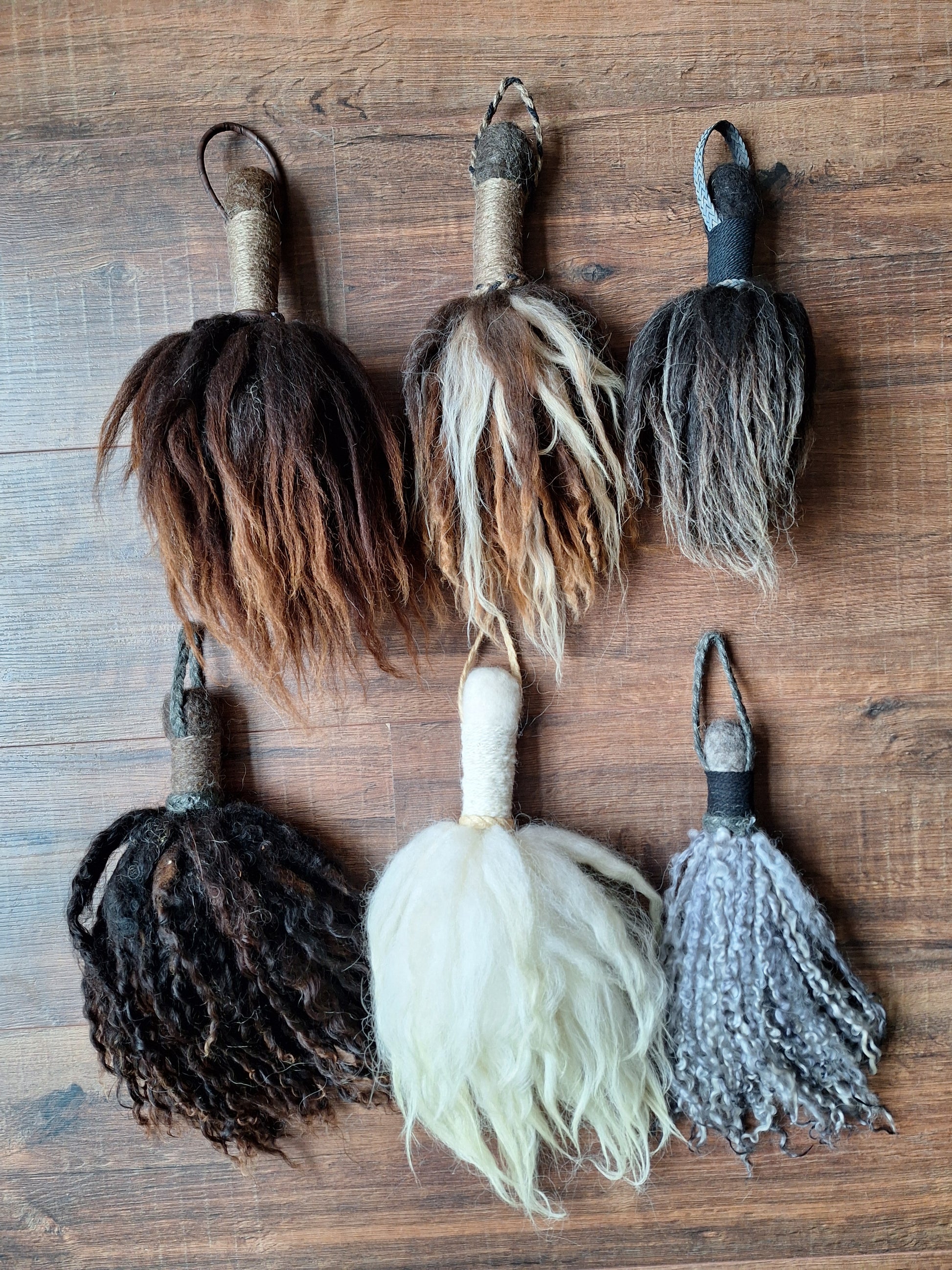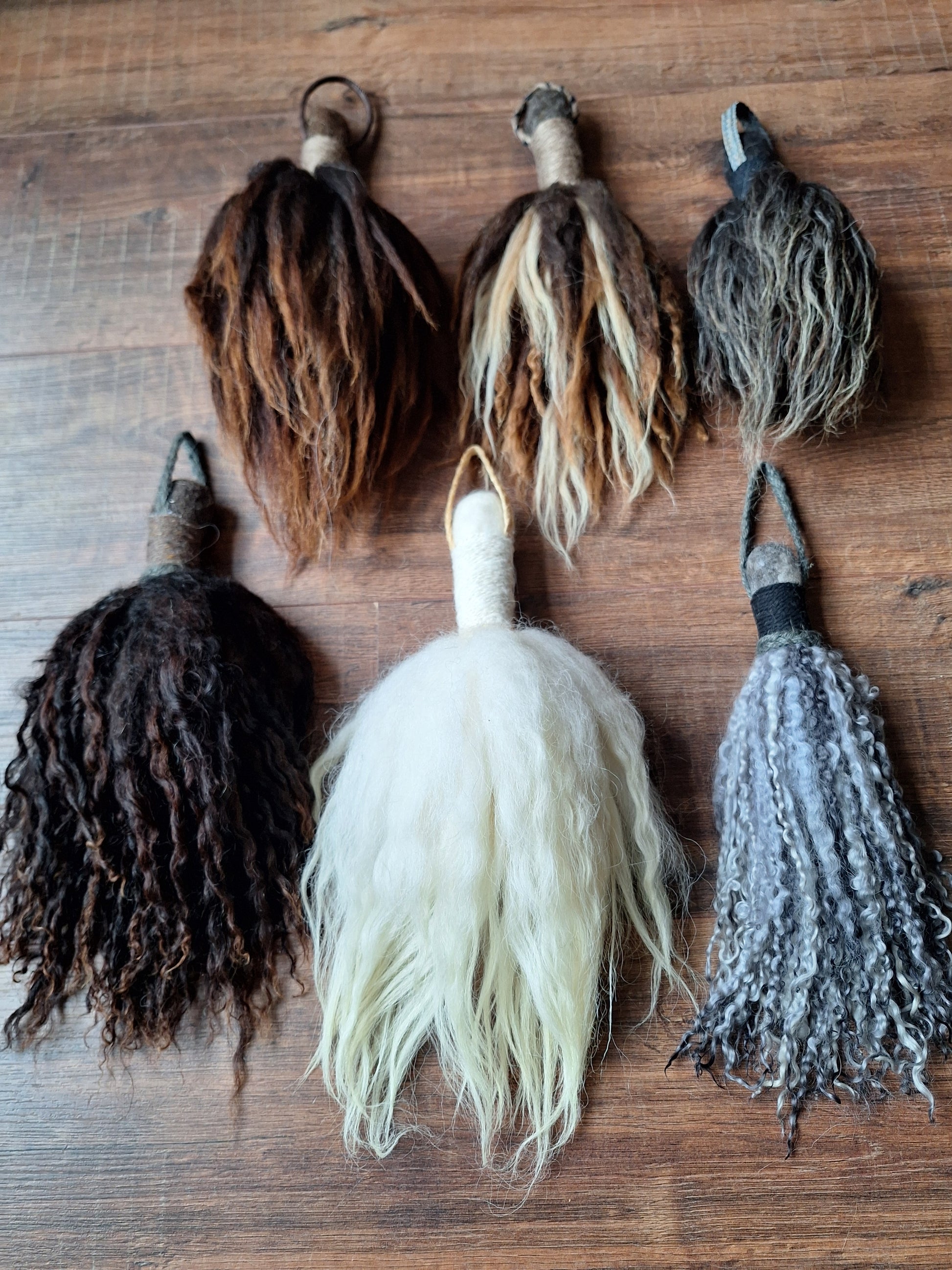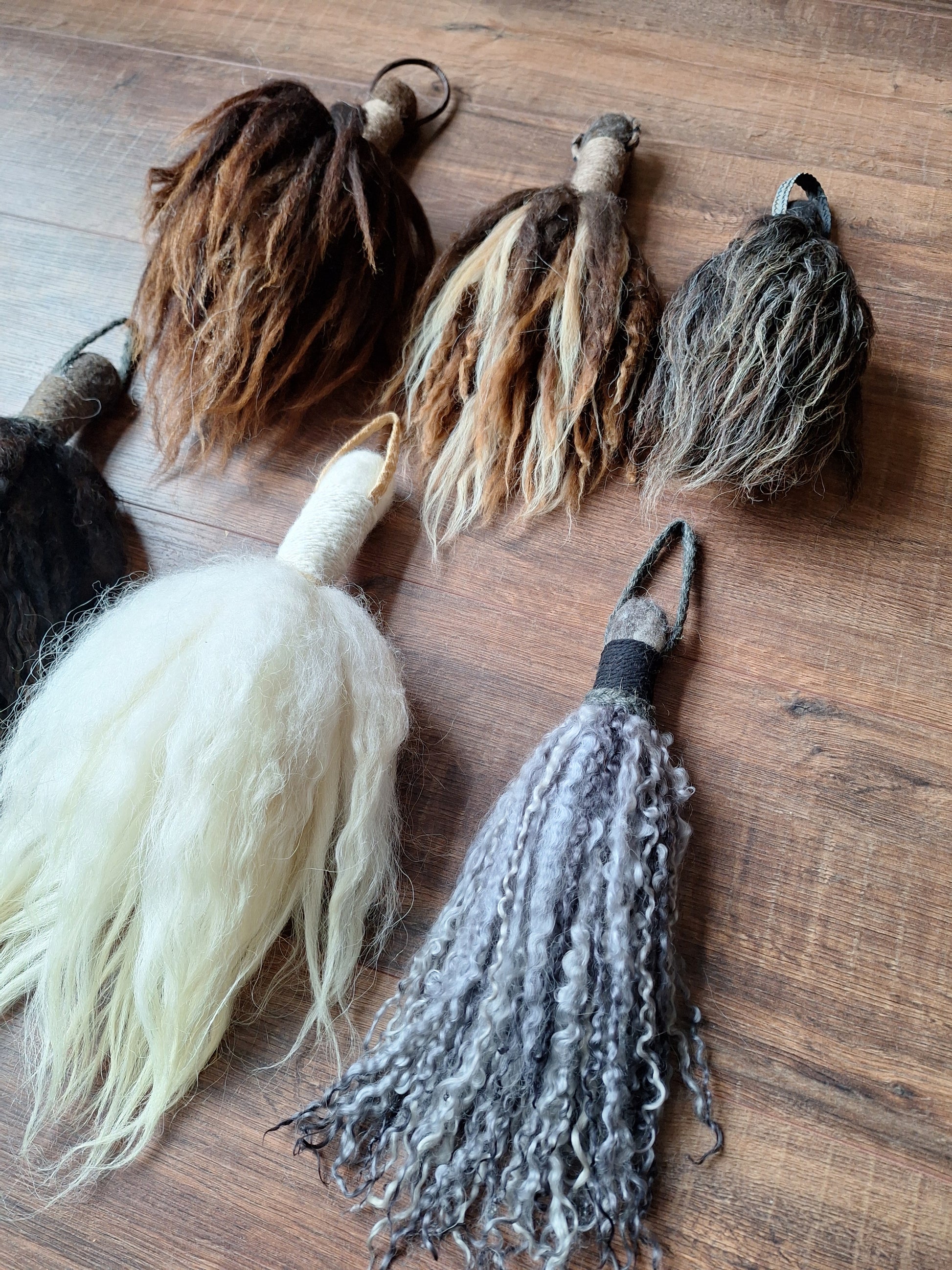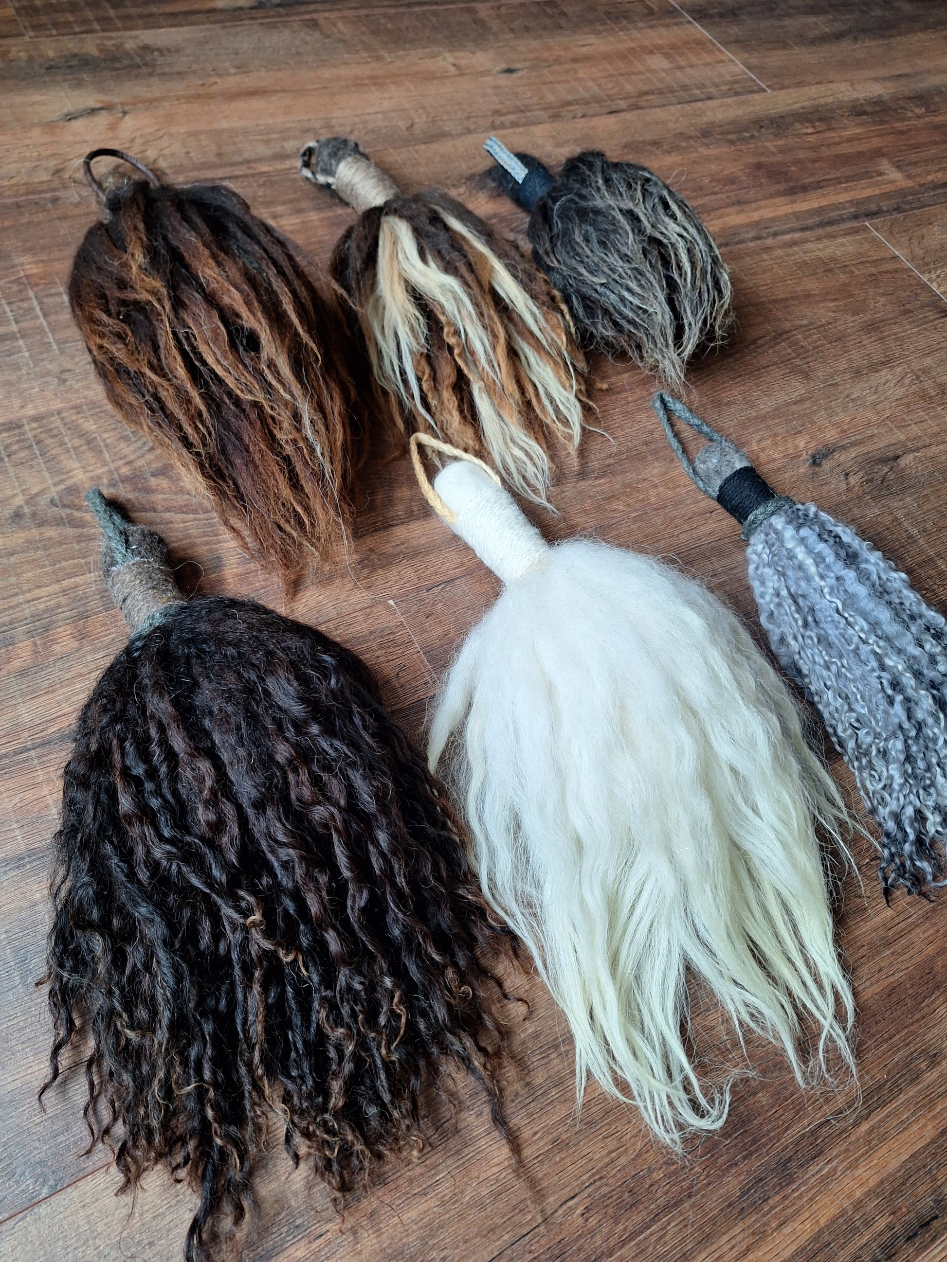 The wool has been carefully selected by Lalafemme on its ethical character and comes from (alive) animals that are treated with care and respect by small farmers and hobby-owners. She collects the wool as much as possible on these locations herself, to be able to see the animals in real life. The animals whose wool has been used in the bundles on these pictures are all living here in the Netherlands, except for the Teeswater sheep (the grey melange one on the bottom right) which is living in England.
