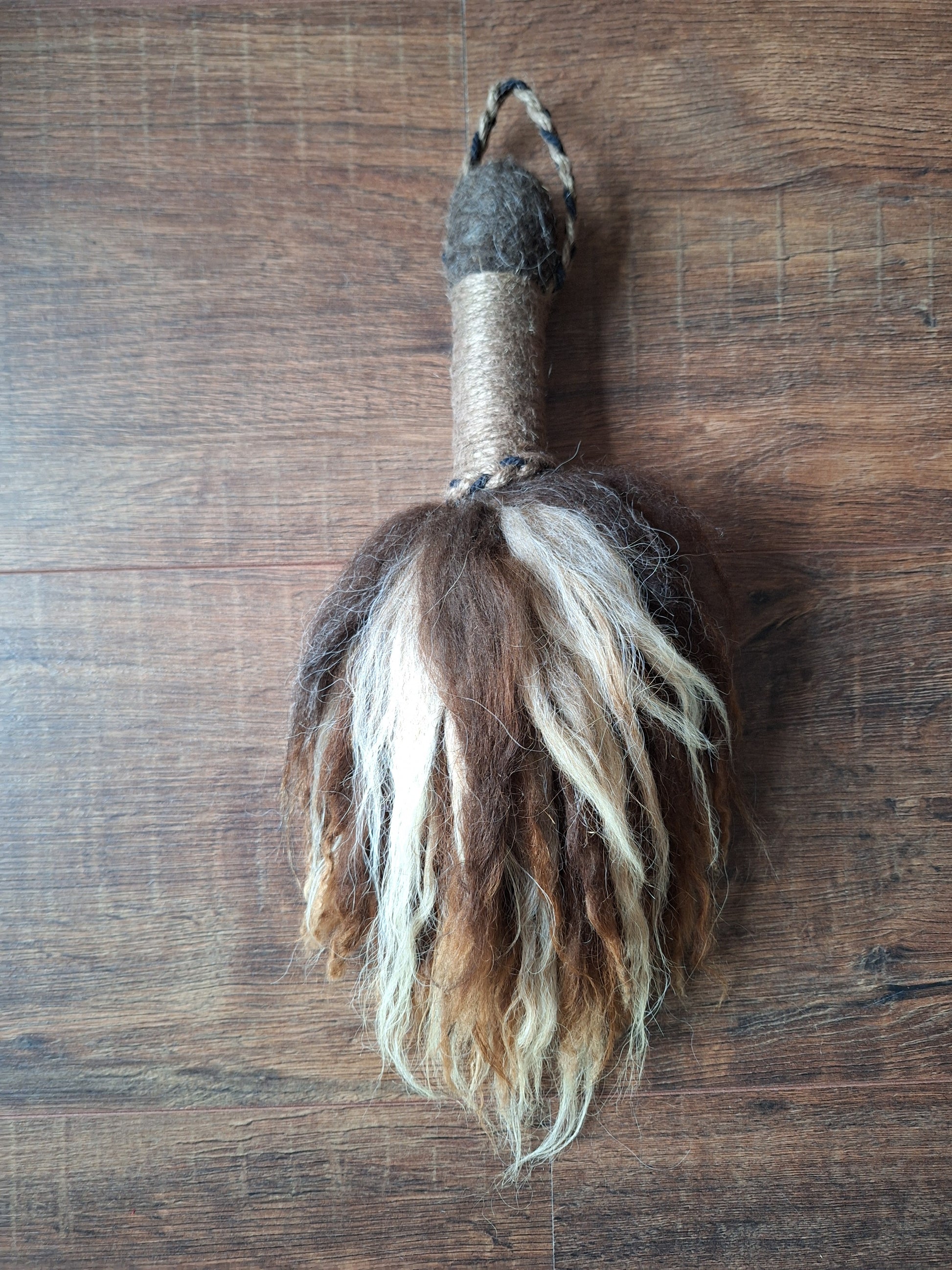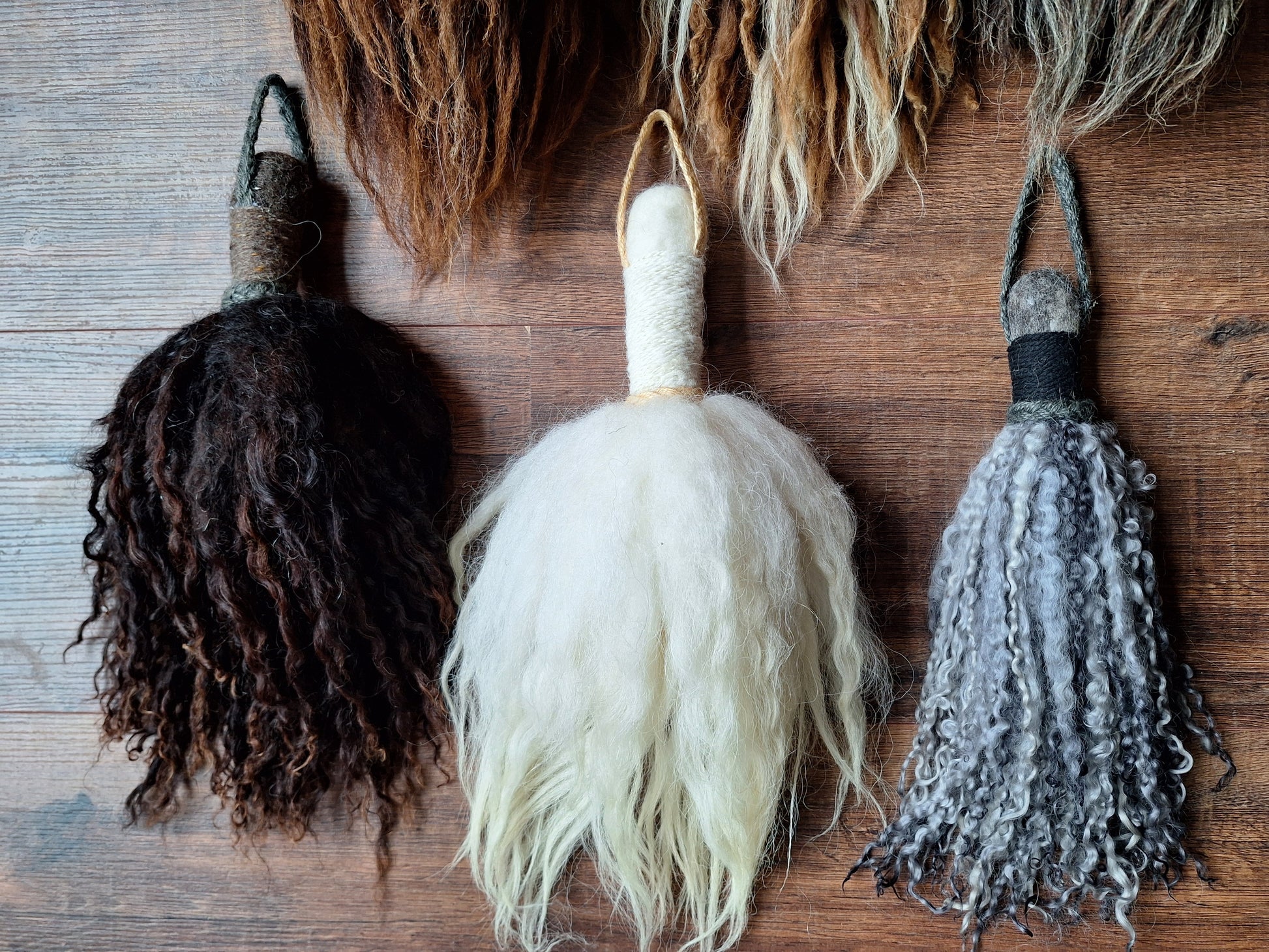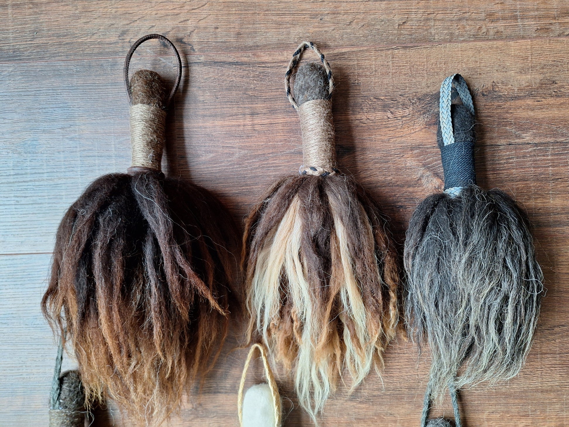 Multifunctional bundles of sheep wool, felted into besom-like models. These bundles are all handcrafted by Dutch woolworker Lalafemme and made from leftover wool pieces from her larger woolfelted items.