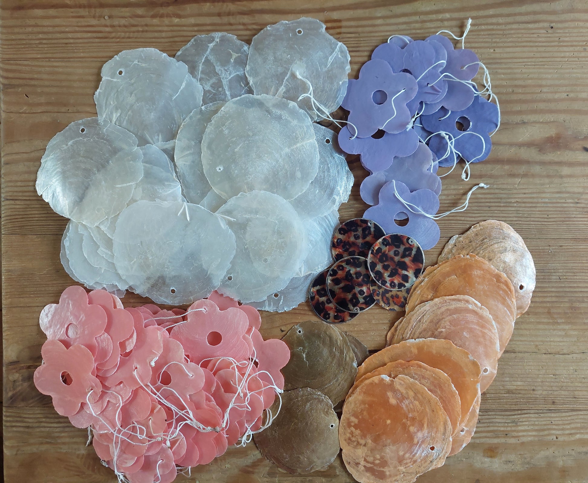 A collection of thin slices of shells for crafting purposes. Some in natural colors, some painted.