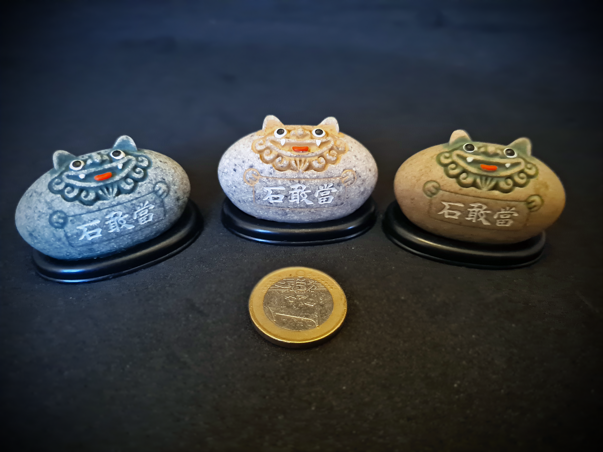 Shi Gan Dan, as the characters on the figurine says, means "stone that dares to resist". Traditionally, Shi Gan Dan were placed in front of entrances, gates and bridges to deter evil spirits and malevolent influences. The face of the stone is an image of the Heavenly Lion, here in the West more commonly known as Foo Dog, the guardian that stands (mostly in pairs of two, a male and a female) at the entrance of your local Asian temple or restaurant.
