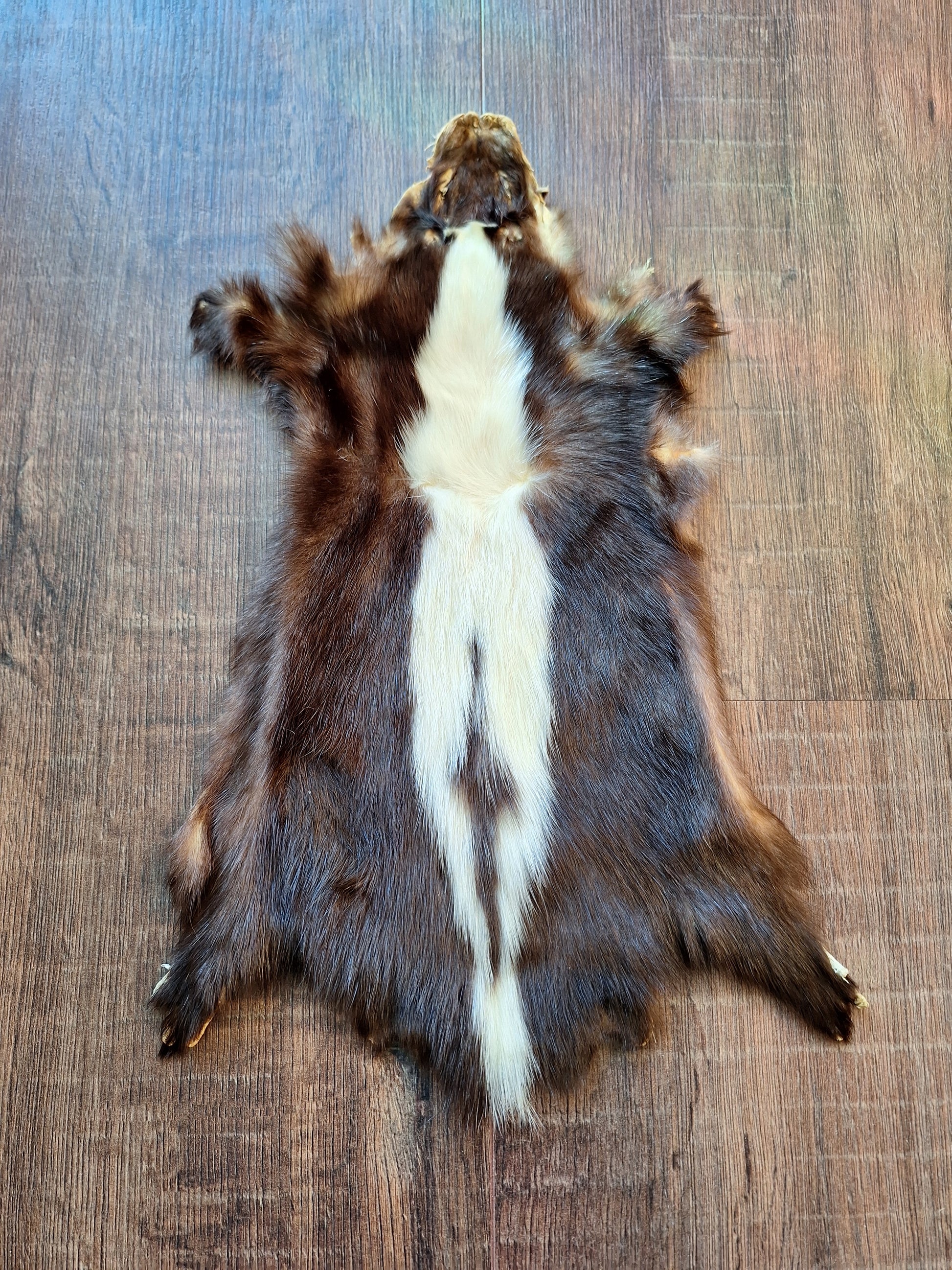 Nice hide of a skunk, with the beautiful, typical black & white hair colors. Recent preparation, soft and supple hide. A very nice item for all your personal ritual, crafting or decorational purposes. Will make a good home for your Skunk spirit animal.