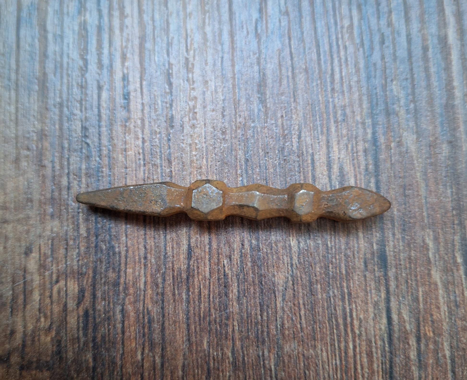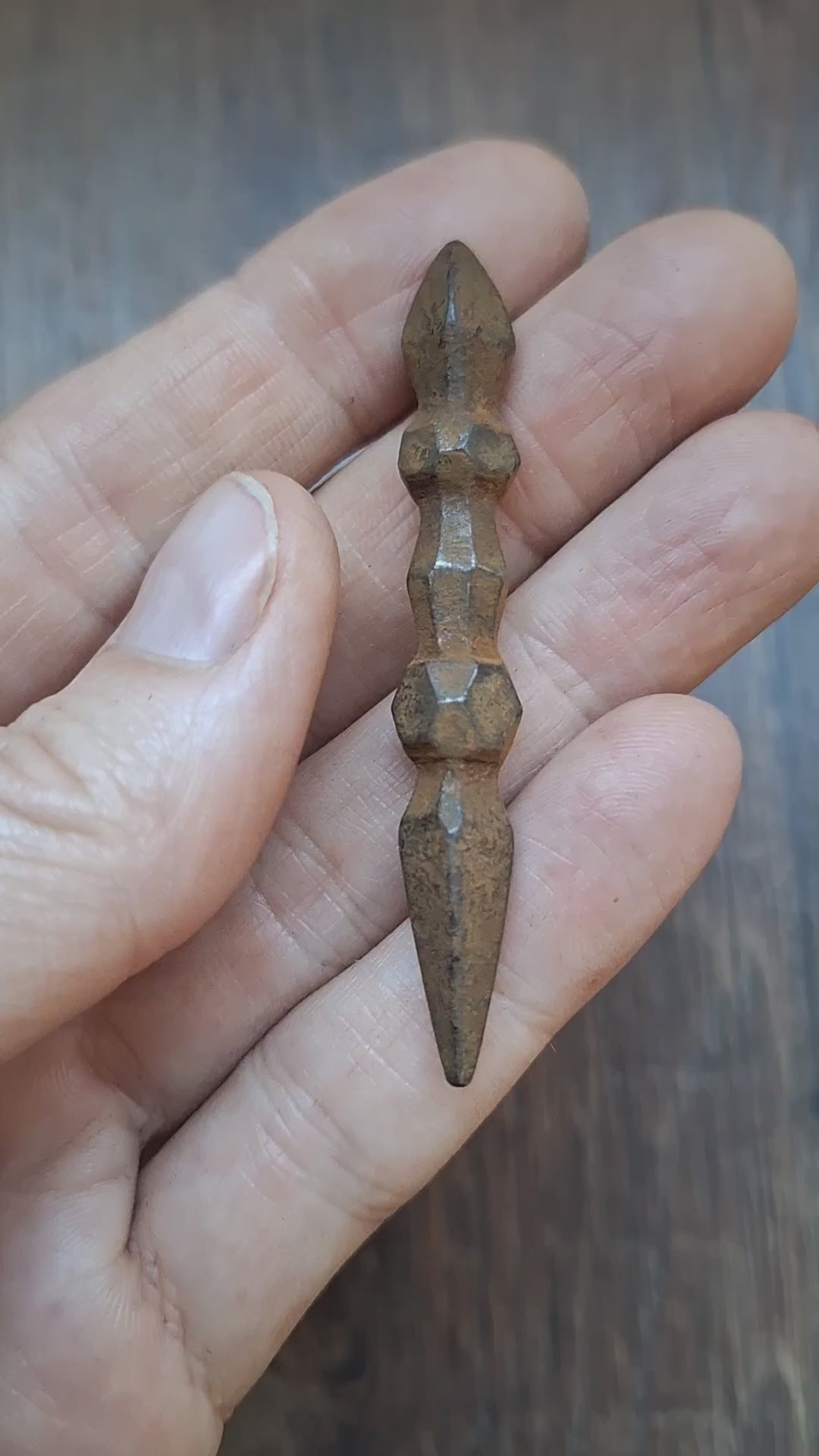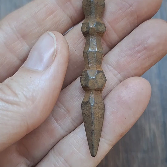 Small iron phurba from Nepal. From vintage origin. As can be seen on the pictures, the iron has a nice rustique layer of rust on it, but the overall stability and integrity of the structure has not been compromised.