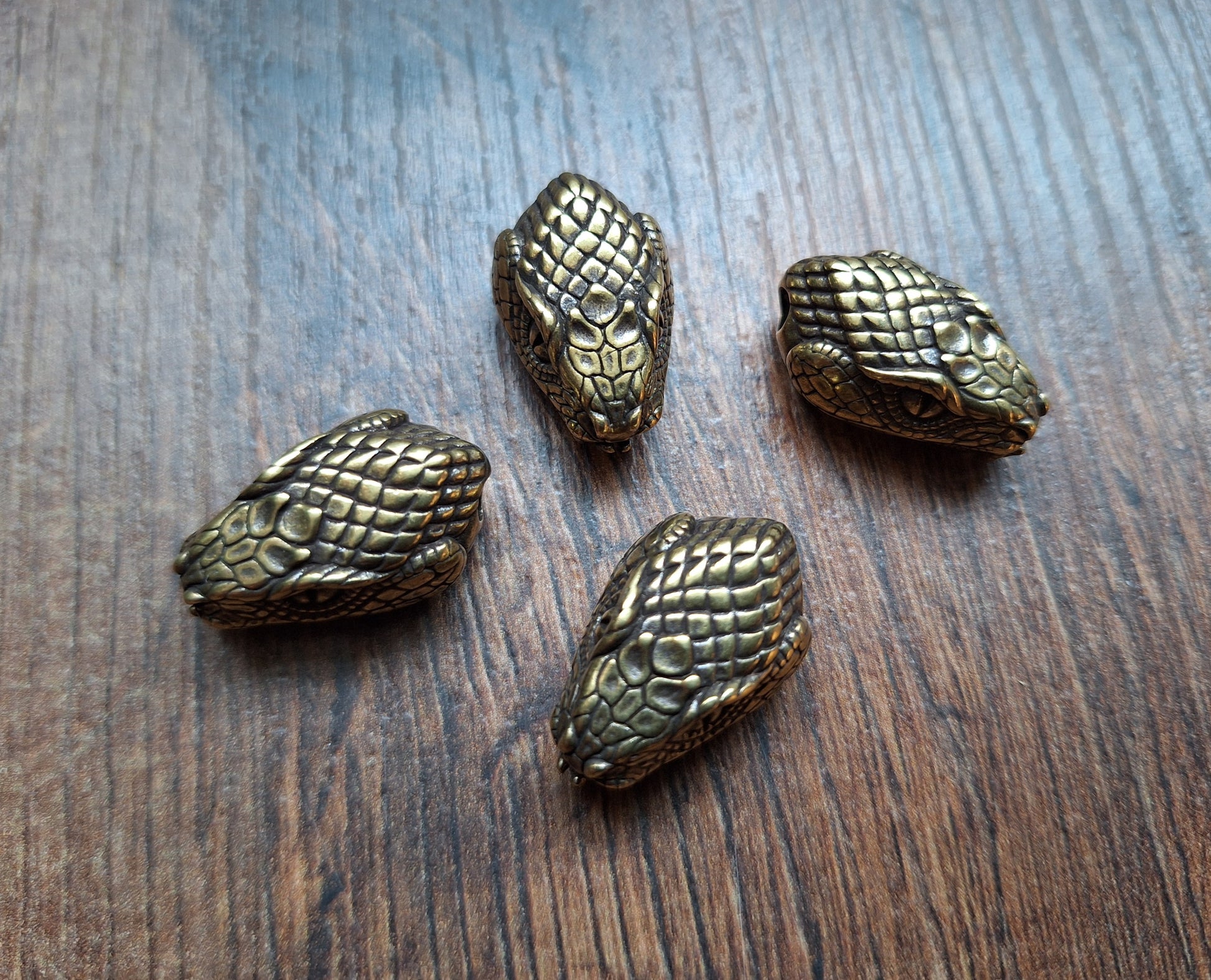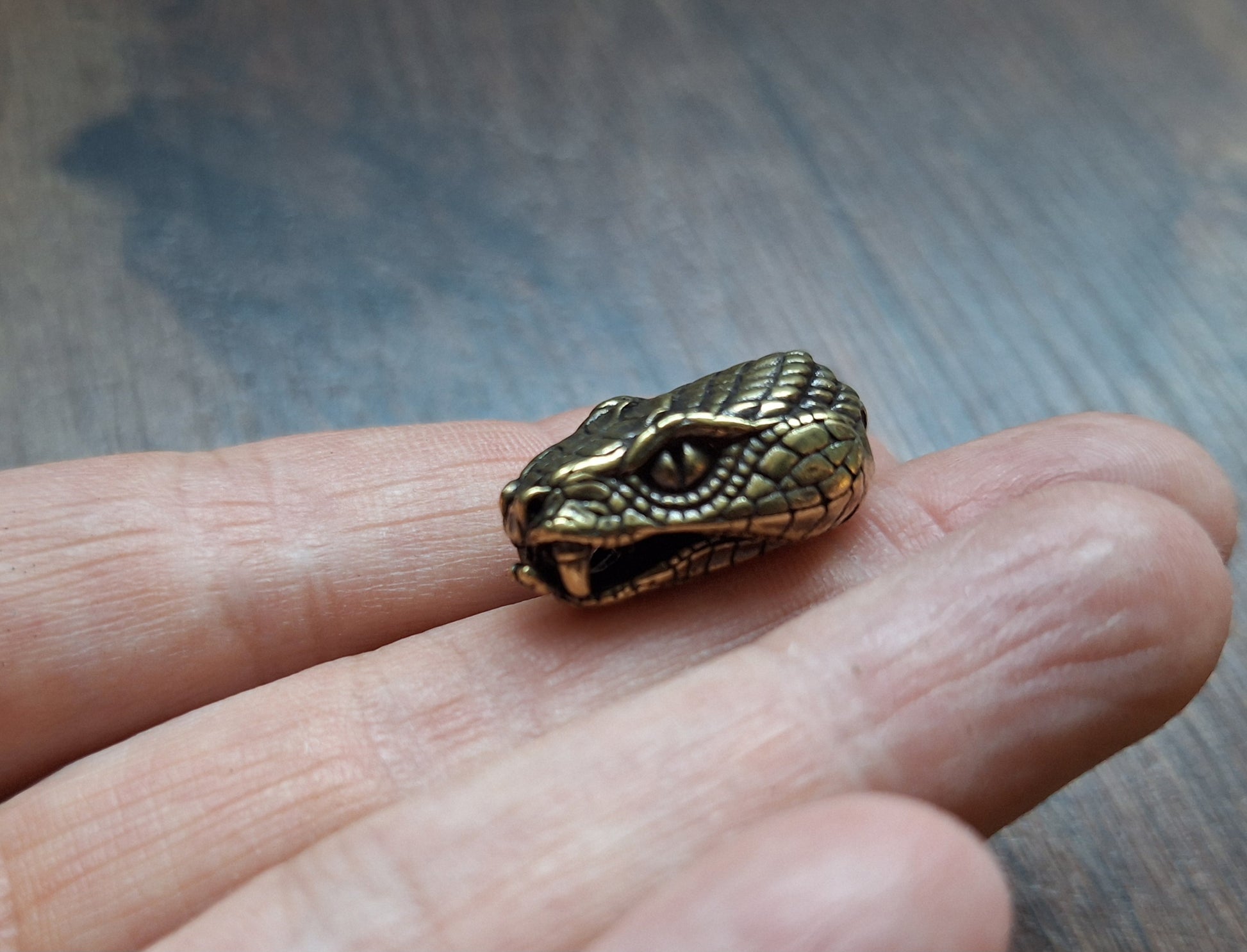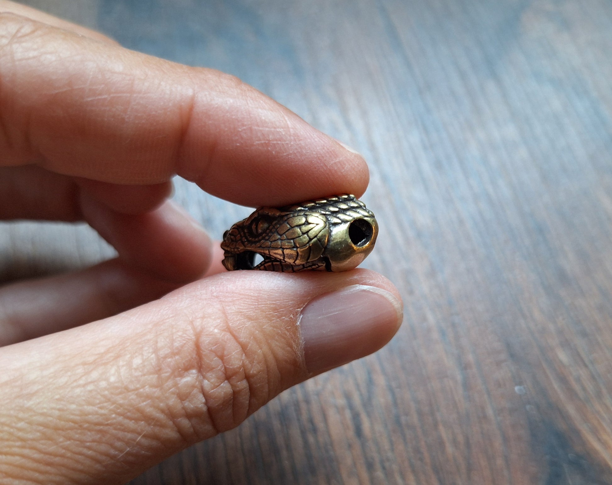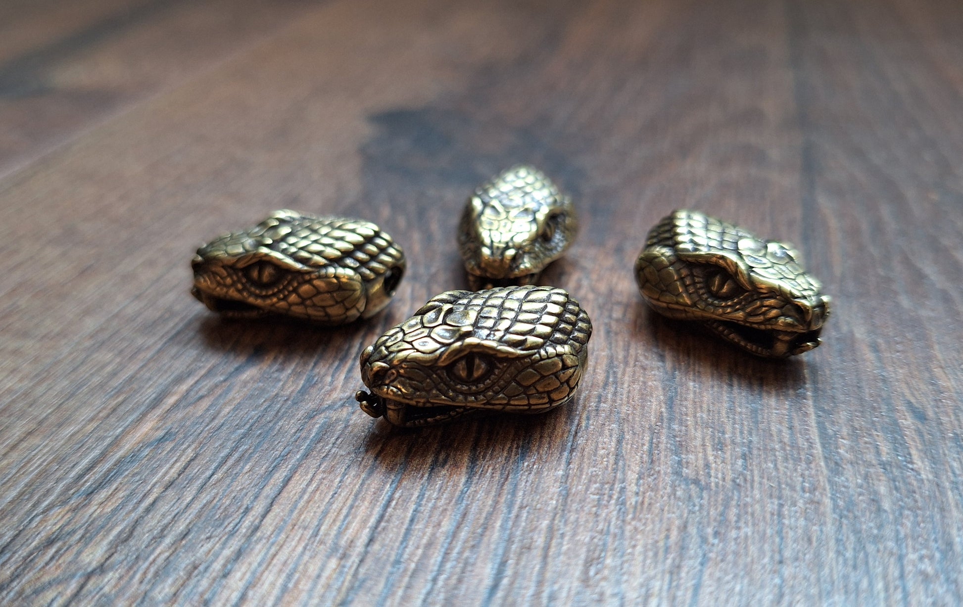 These pendants in the shape of a snake-head are made from brass and are nicely decorated on both the front- and the backside. They can be hung on a simple cord or necklace for use as a personal amulet or be attached to your ritual clothing or attributes. They have a double hole on the back of the head, where the cord can be threaded through.