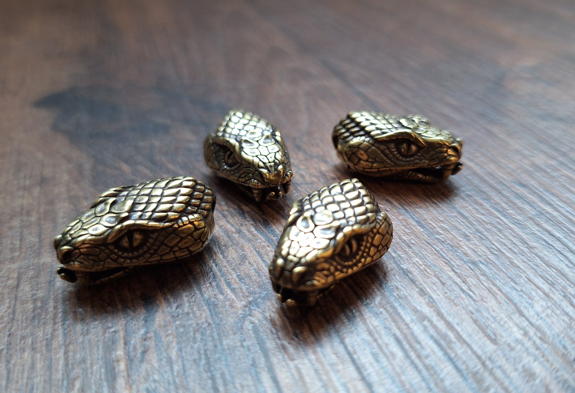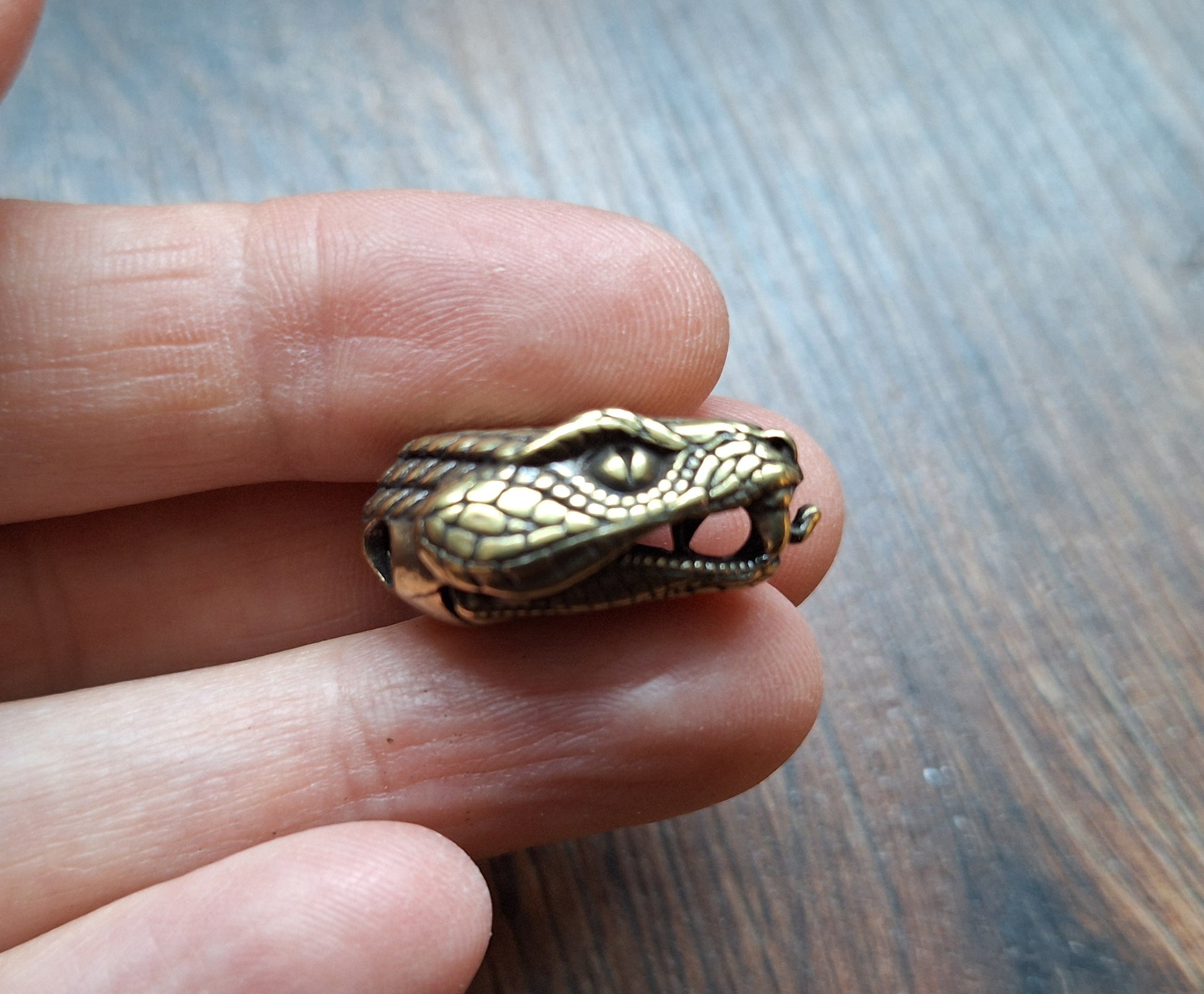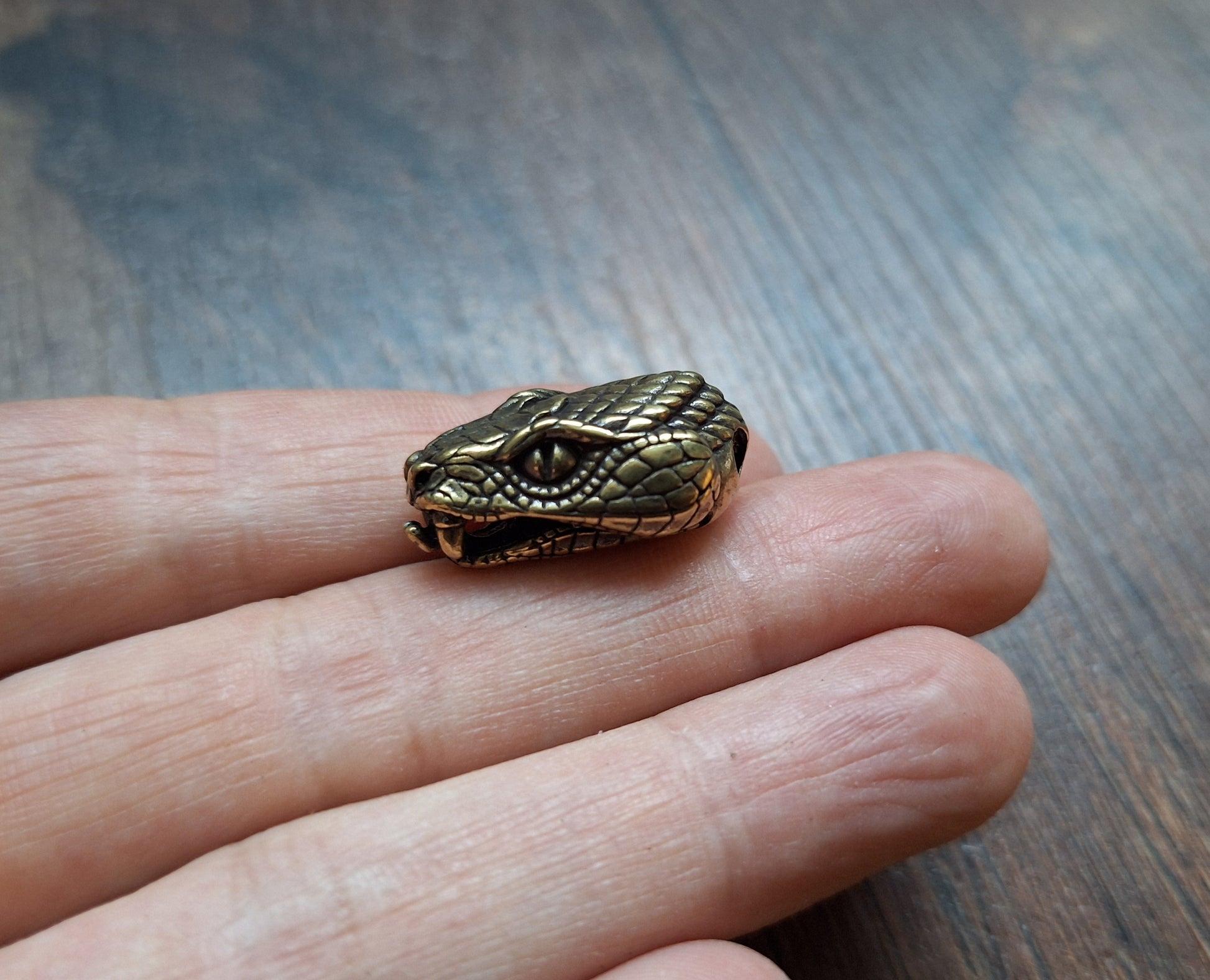 These pendants in the shape of a snake-head are made from brass and are nicely decorated on both the front- and the backside. They can be hung on a simple cord or necklace for use as a personal amulet or be attached to your ritual clothing or attributes. They have a double hole on the back of the head, where the cord can be threaded through.