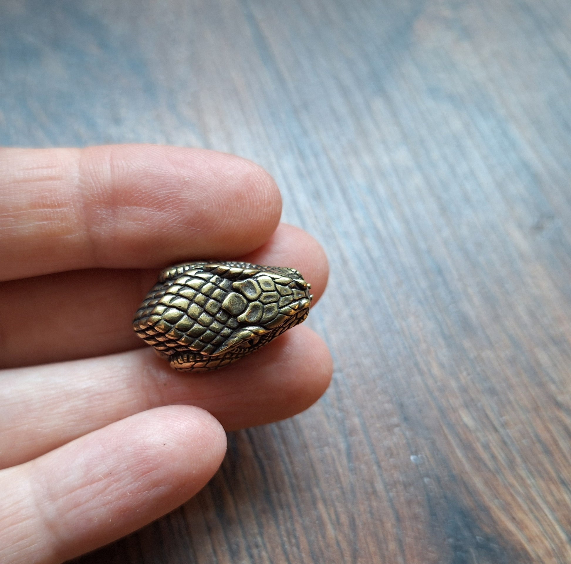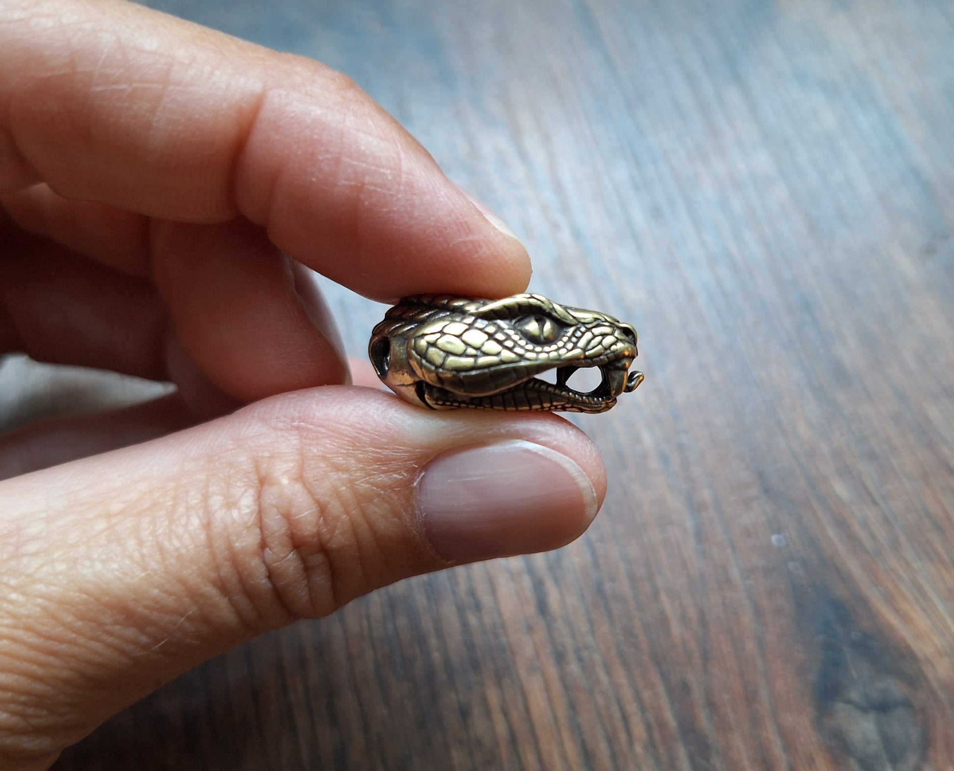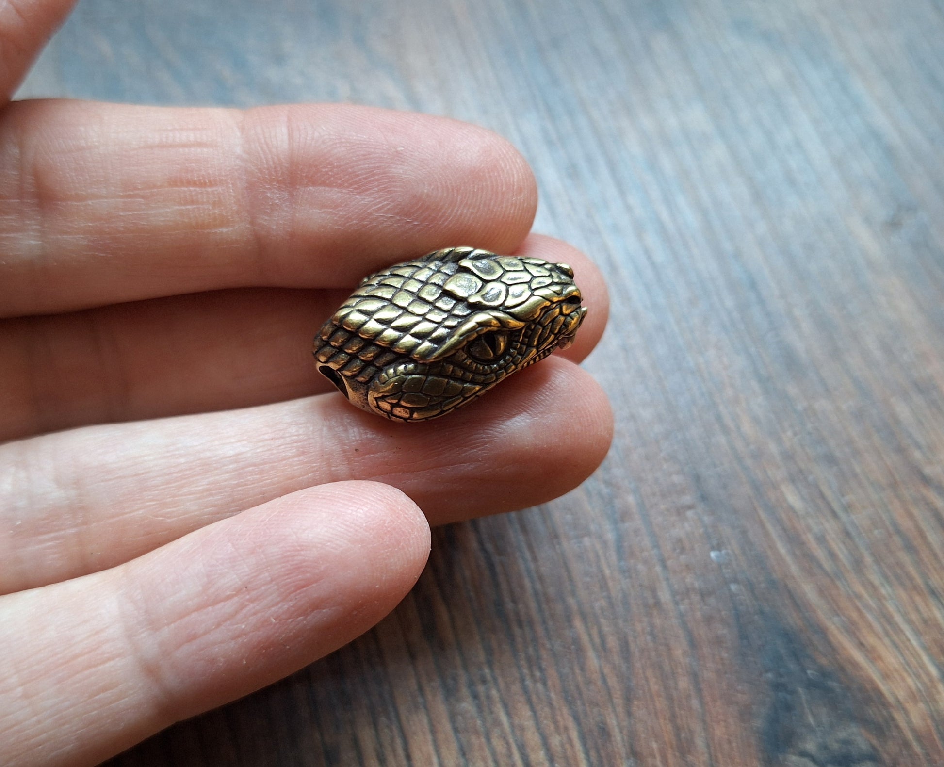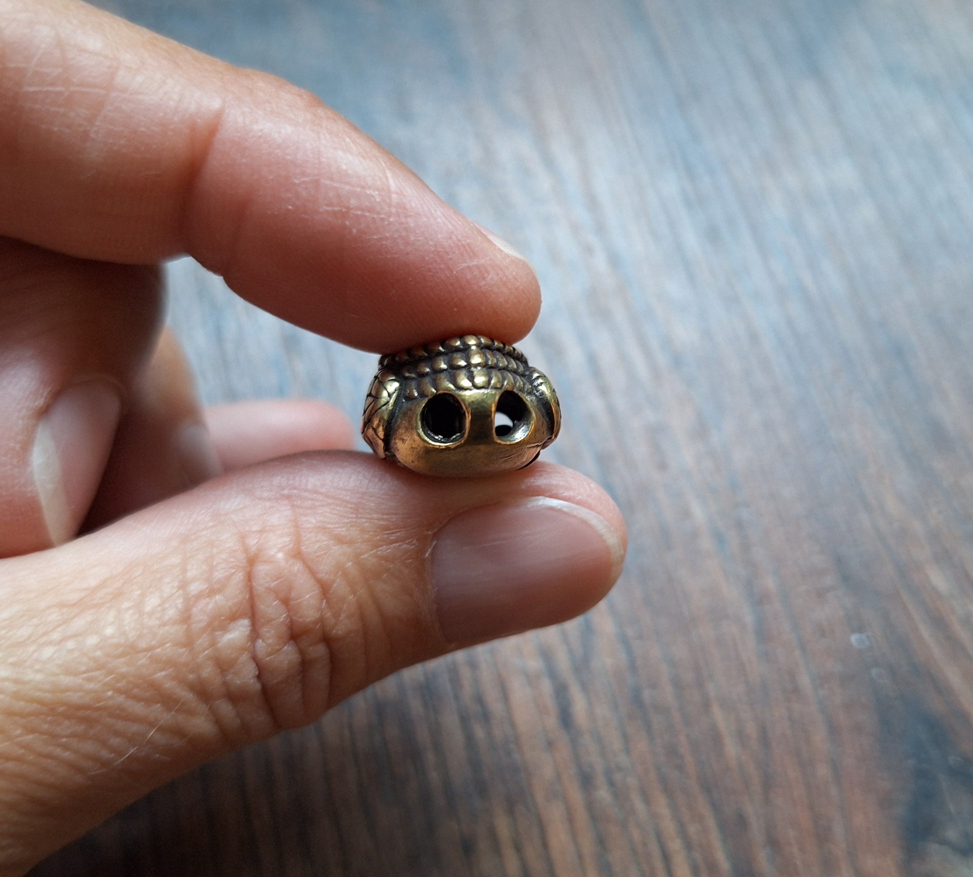 These pendants in the shape of a snake-head are made from brass and are nicely decorated on both the front- and the backside. They can be hung on a simple cord or necklace for use as a personal amulet or be attached to your ritual clothing or attributes. They have a double hole on the back of the head, where the cord can be threaded through.
