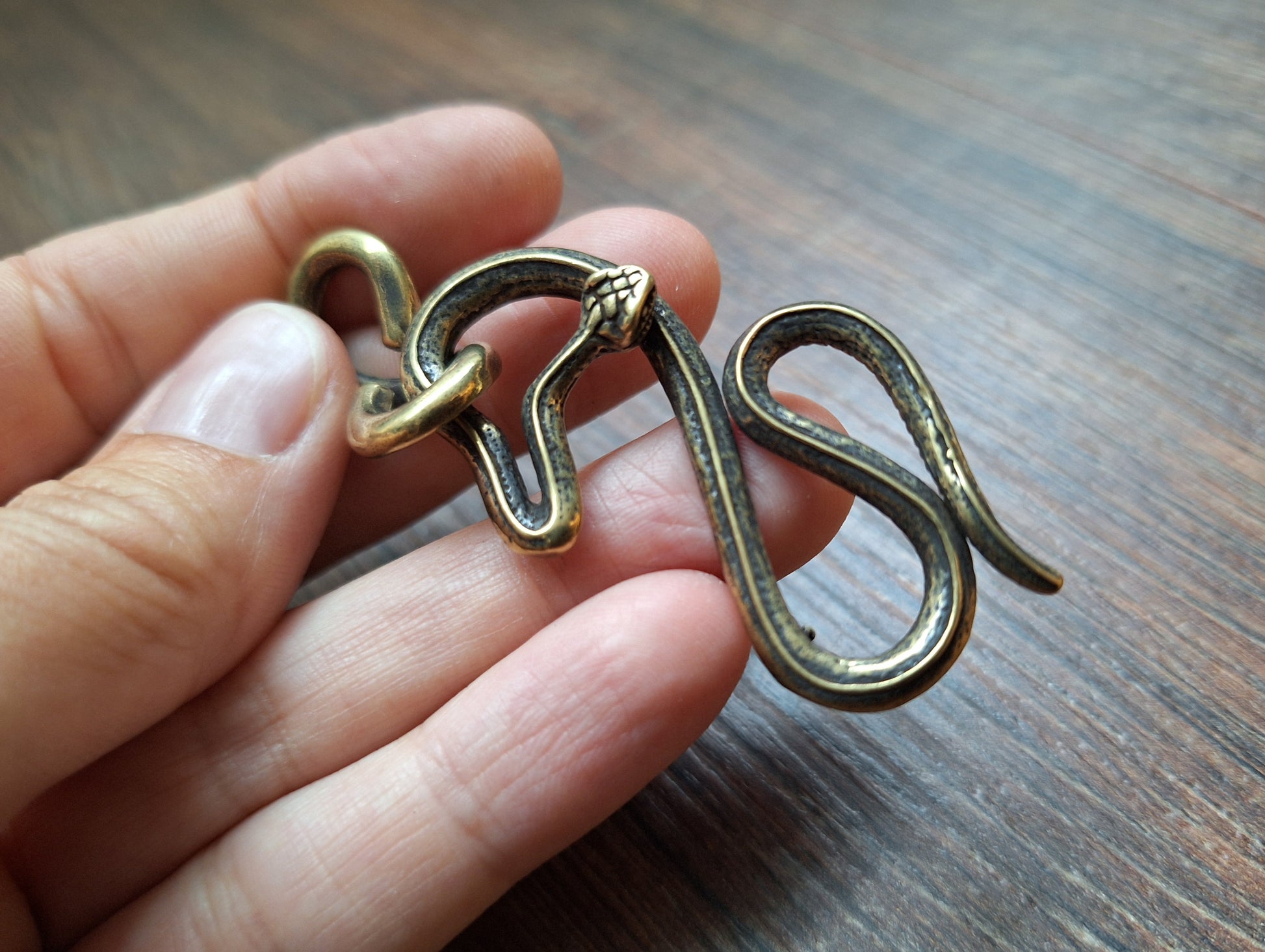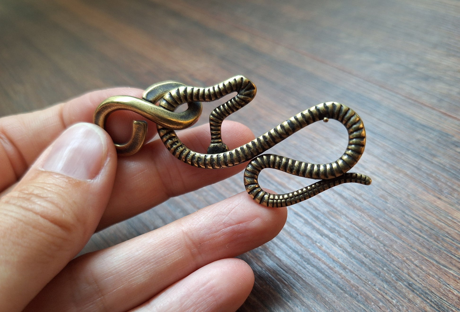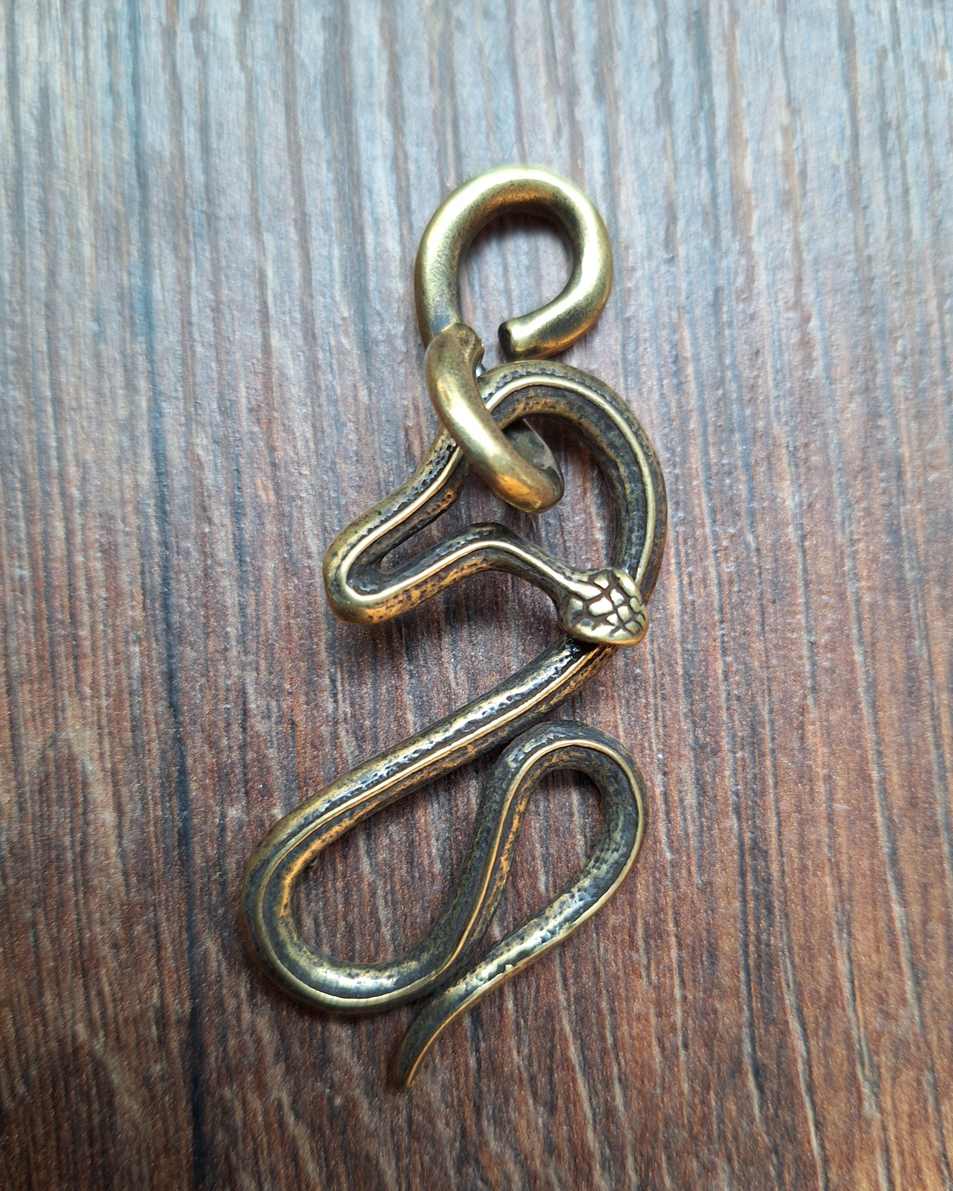 Size; approximately 55 millimeters long and 25 millimeters wide. The slender snake's body is approximately 4 millimeters thick. Close to the head of the snake, a brass double loop has been attached to serve as an eyelet. This loop slides freely over the upper part of the snake's body.