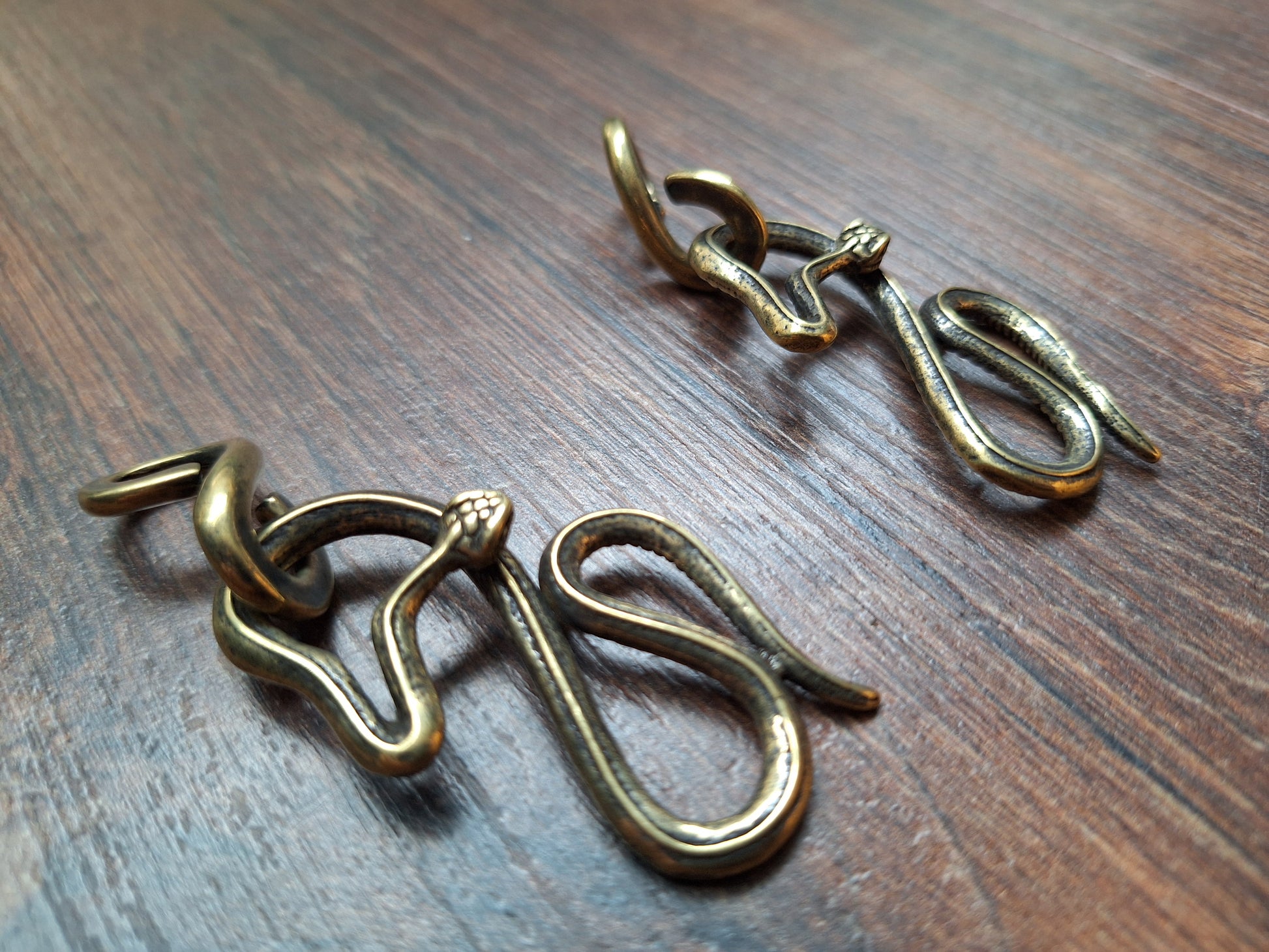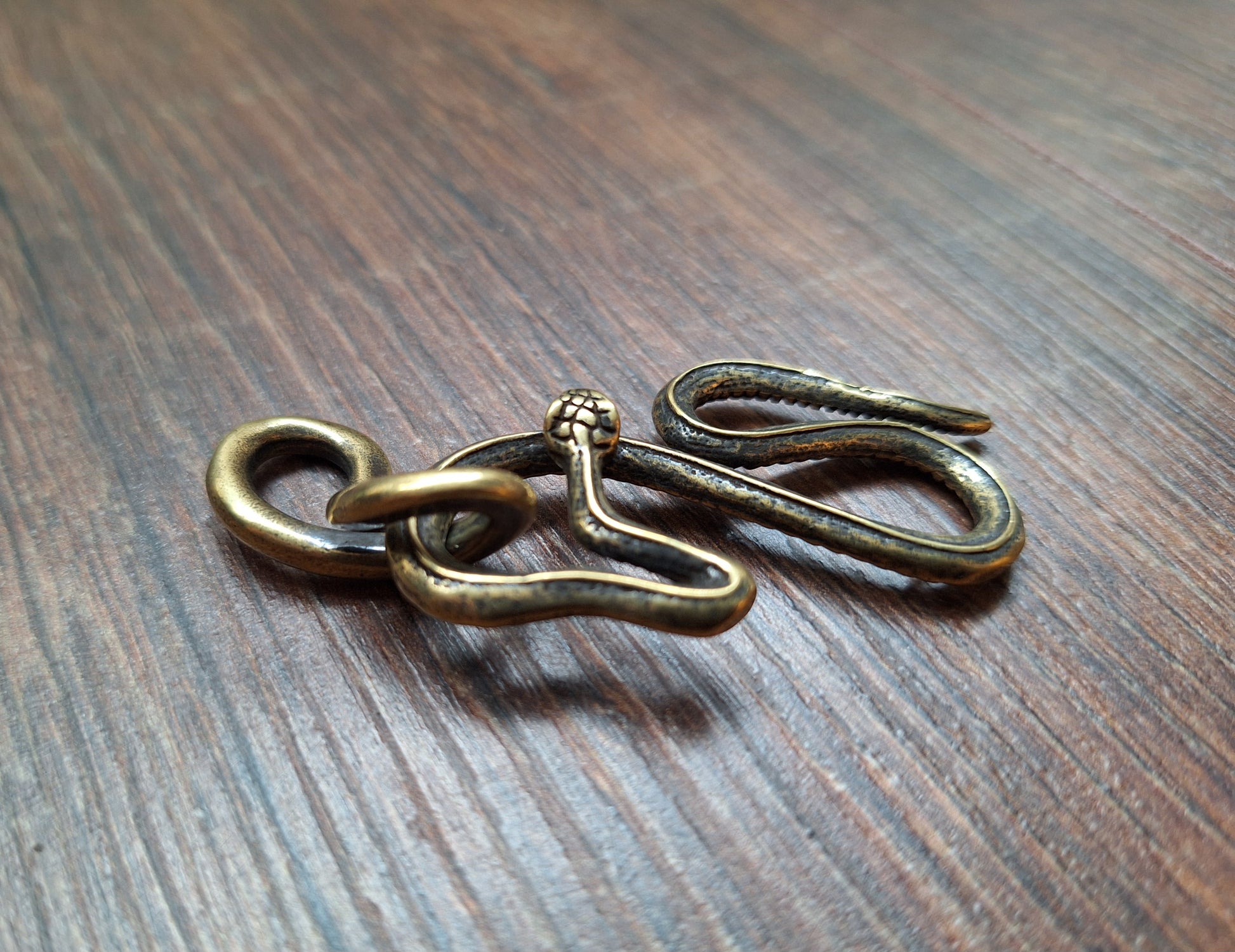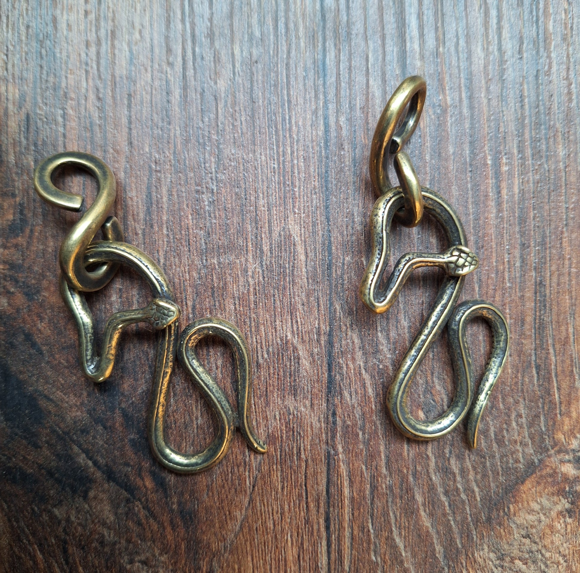 Size; approximately 55 millimeters long and 25 millimeters wide. The slender snake's body is approximately 4 millimeters thick. Close to the head of the snake, a brass double loop has been attached to serve as an eyelet. This loop slides freely over the upper part of the snake's body.
