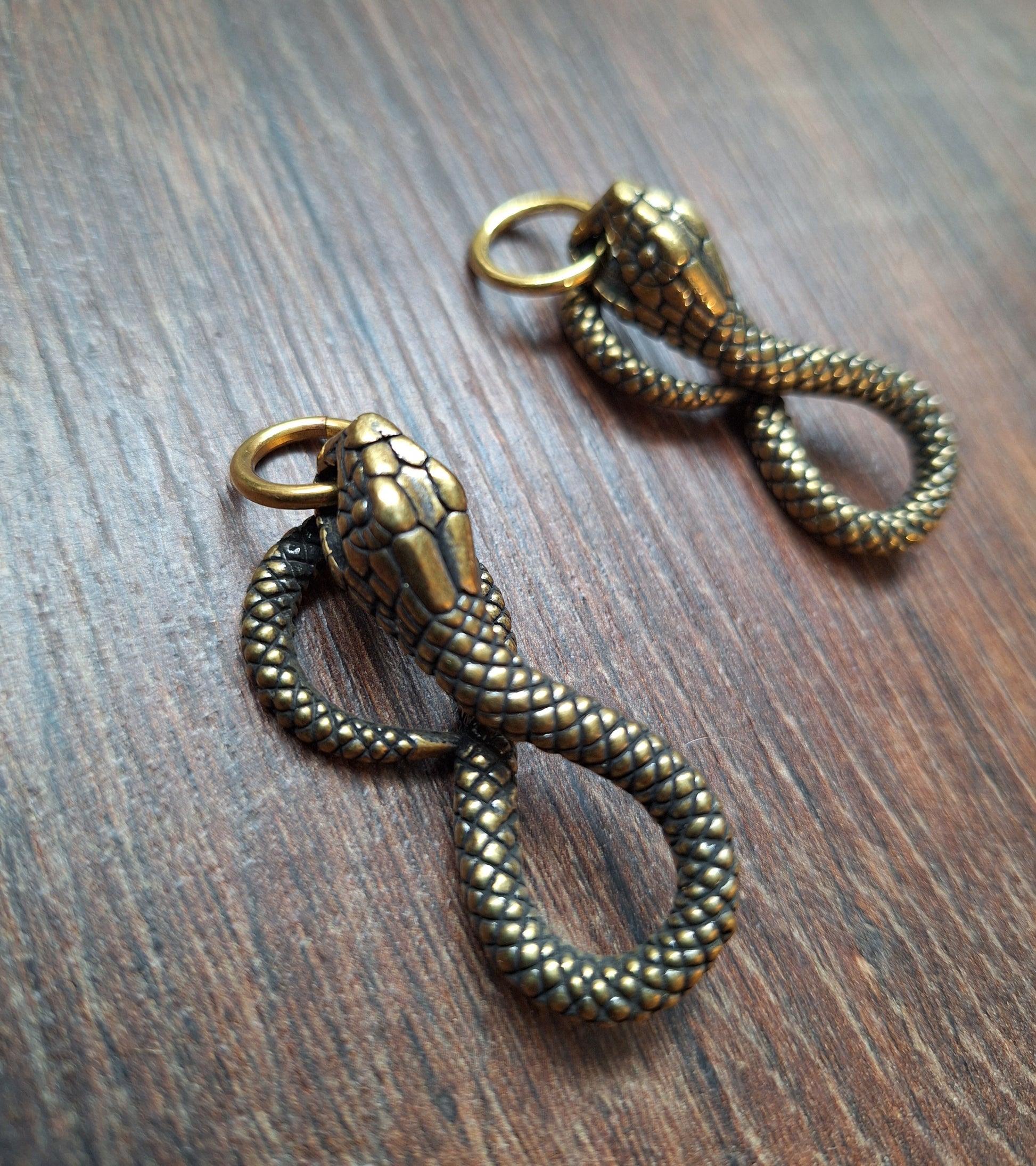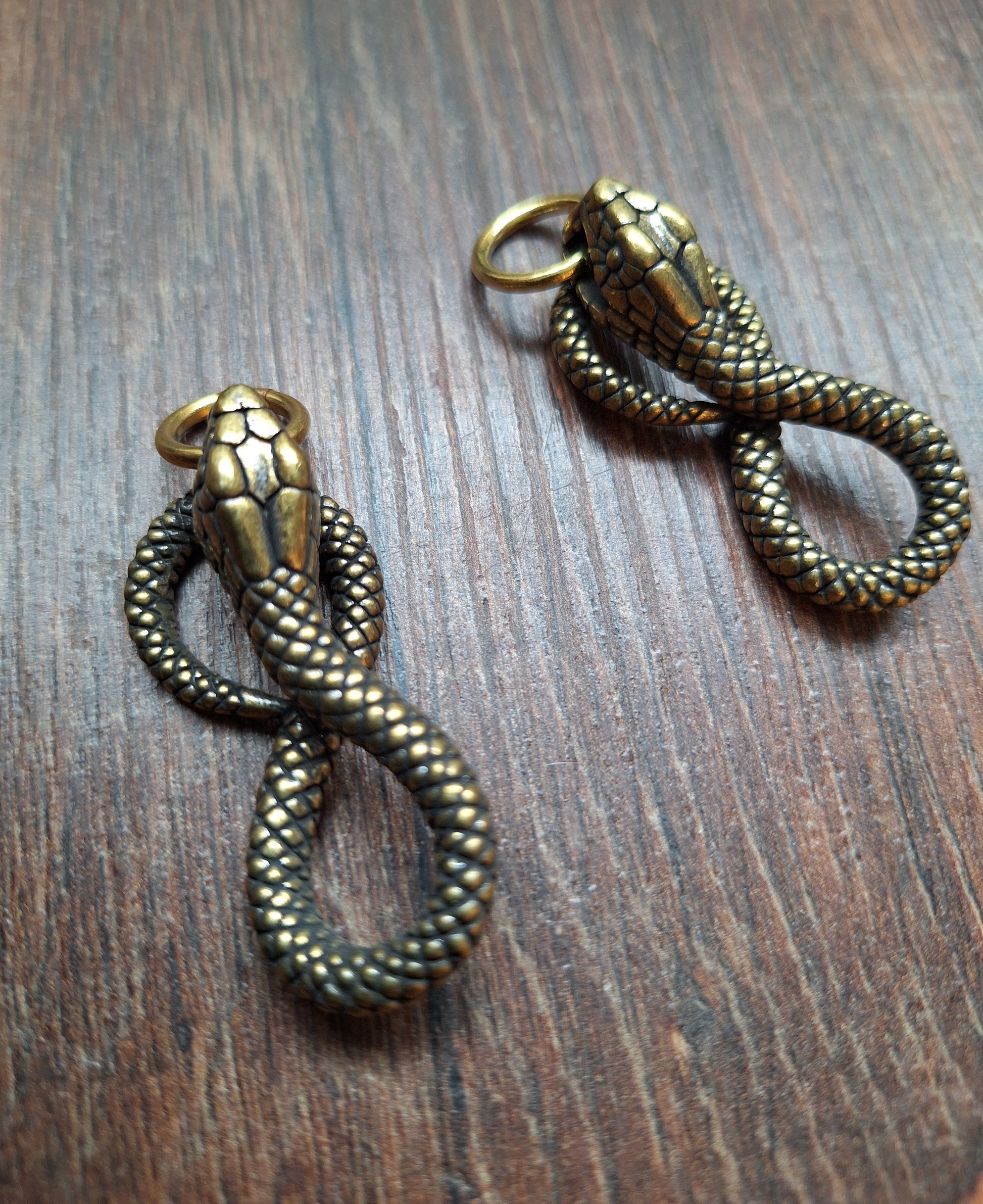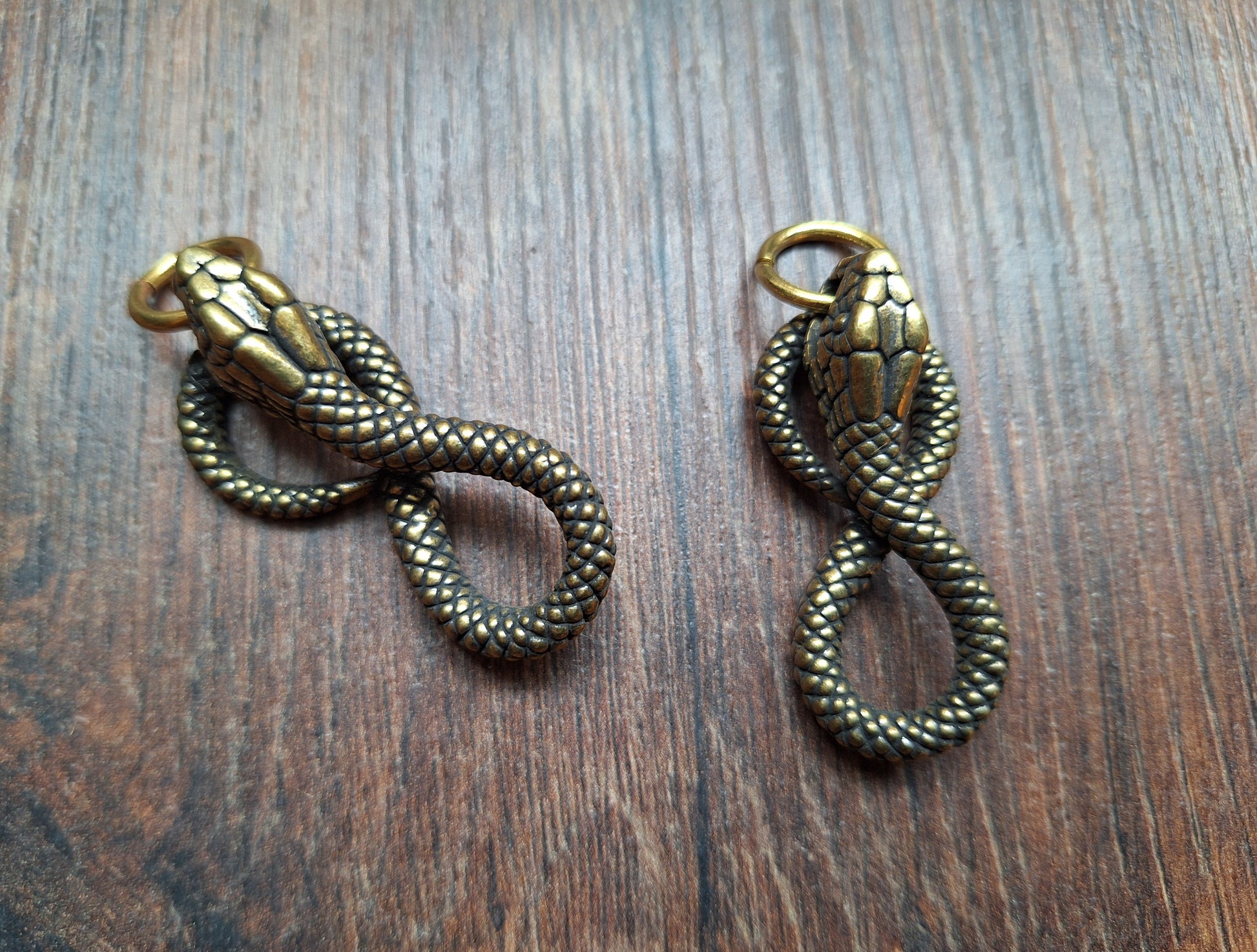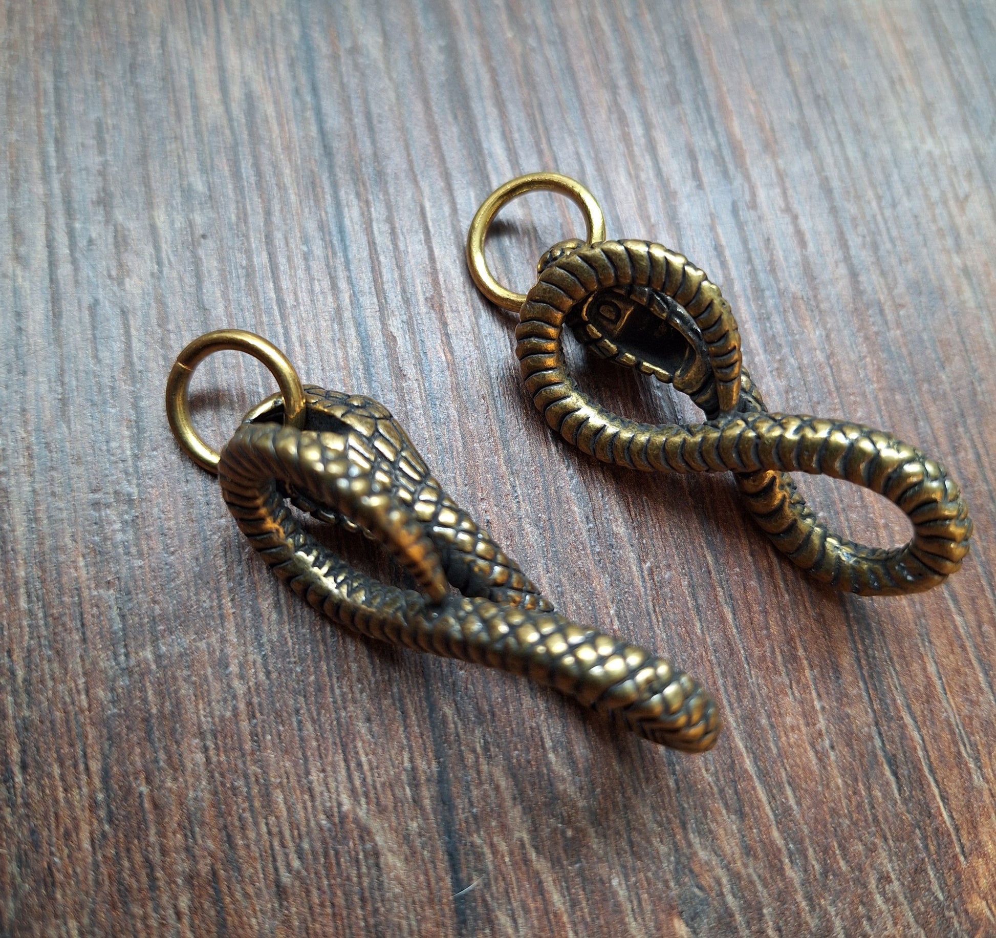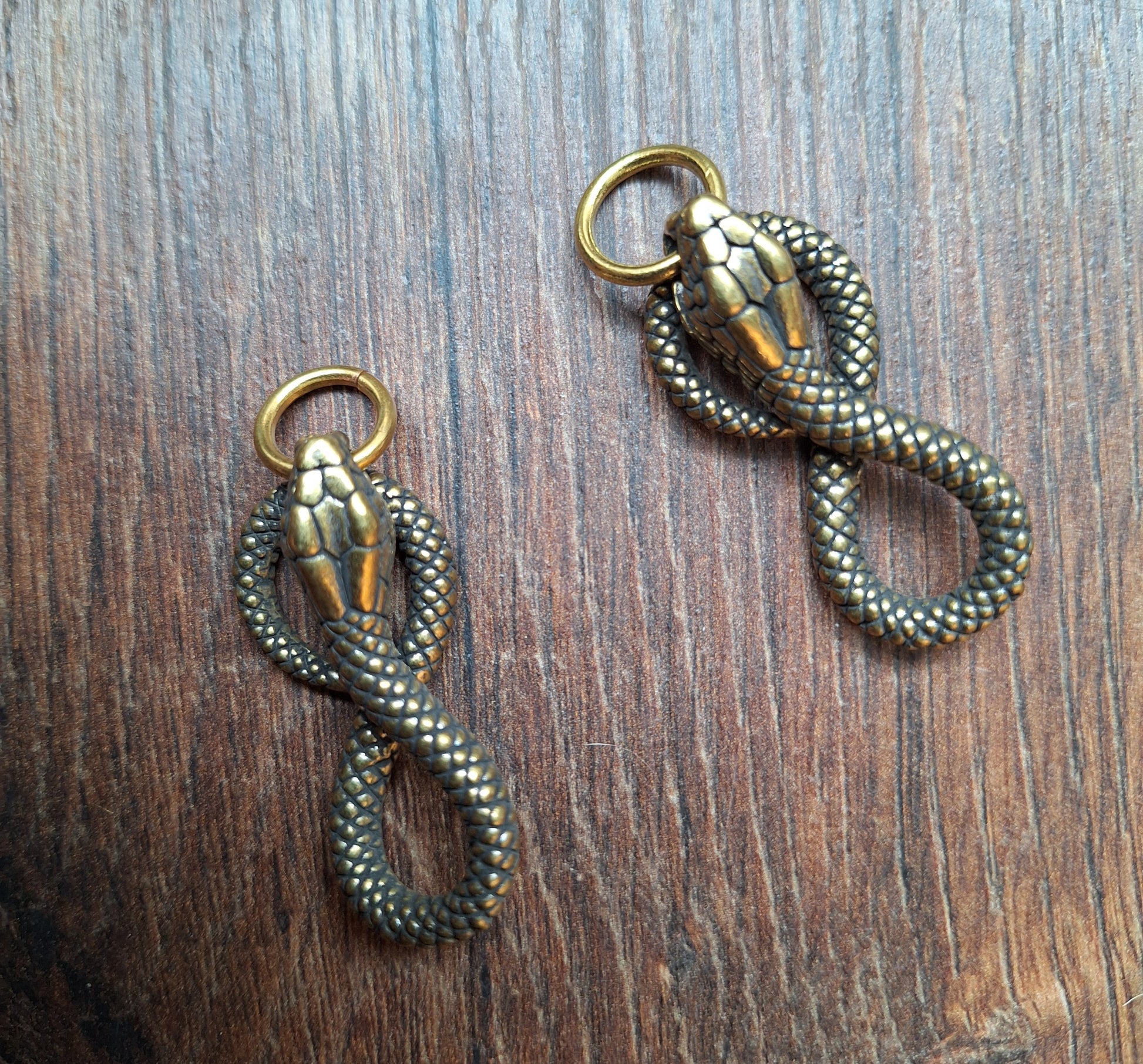Size; approximately 48 millimeters long (measured without the metal ring), 20 millimeters wide and 15 millimeters deep. The metal ring in the snake's mouth has a diameter of 13 millimeters. They are nicely decorated on both the front- and the backside and can be hung on a simple cord or necklace for use as a personal amulet or be attached to your ritual clothing or attributes.