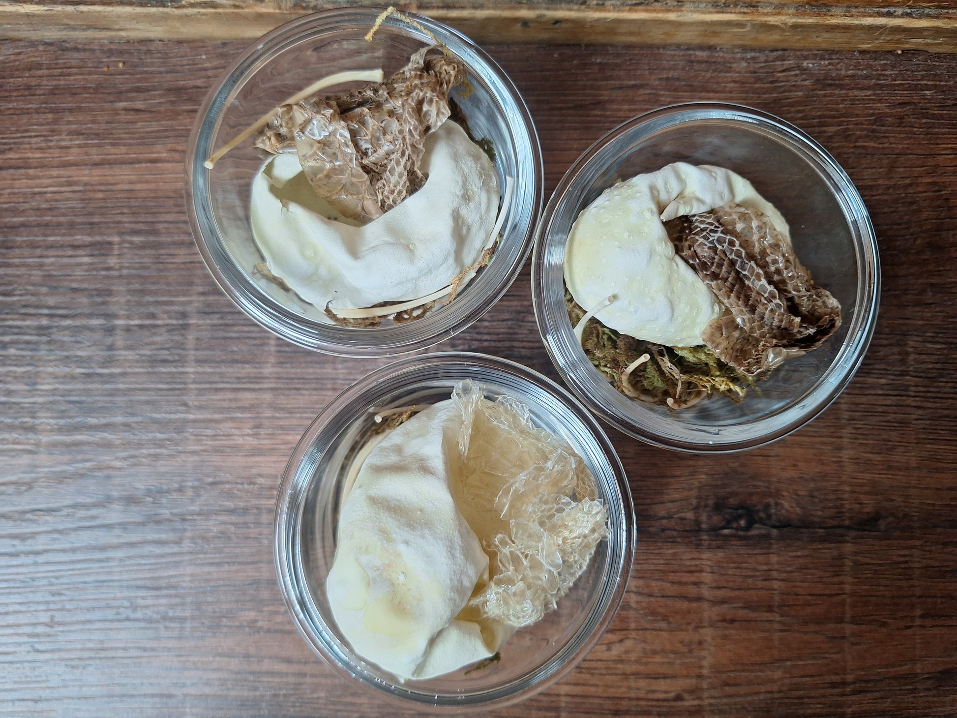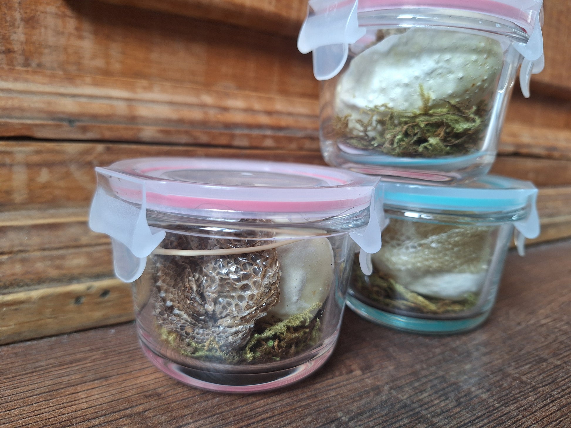 Three jars available; two with a pink lining in the lid, one with a green lining. The piece of crawl skin included in the ones with the pink lining is slightly darker in color, the piece of crawl skin in the jar with the green lining is very light colored. Otherwise the contents are very similar (but of course all unique because of their organic nature).