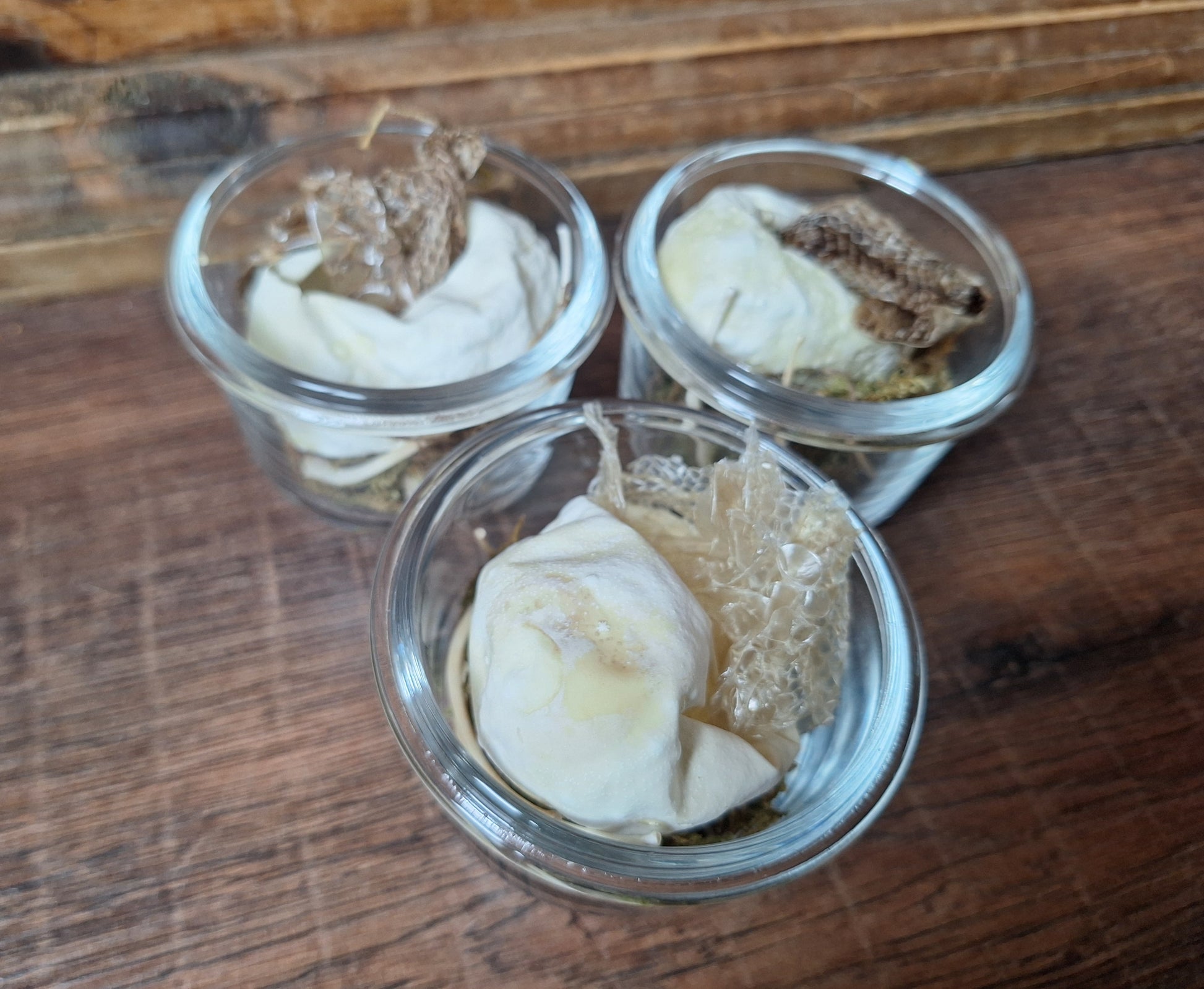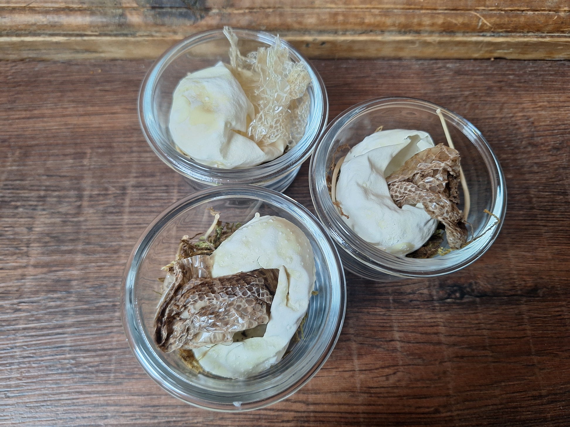 Snake-set in a nice glass jar with some decorative moss. Each set consists of an (empty) snake eggshell, three snake ribs and a piece of (crawl) skin. Great items to use in all kinds of personal ritual or crafting purposes, to connect you with the spirit of Snake. And of course also very nice to put on your altar or in your personal cabinet of curiosities 'as-is'.