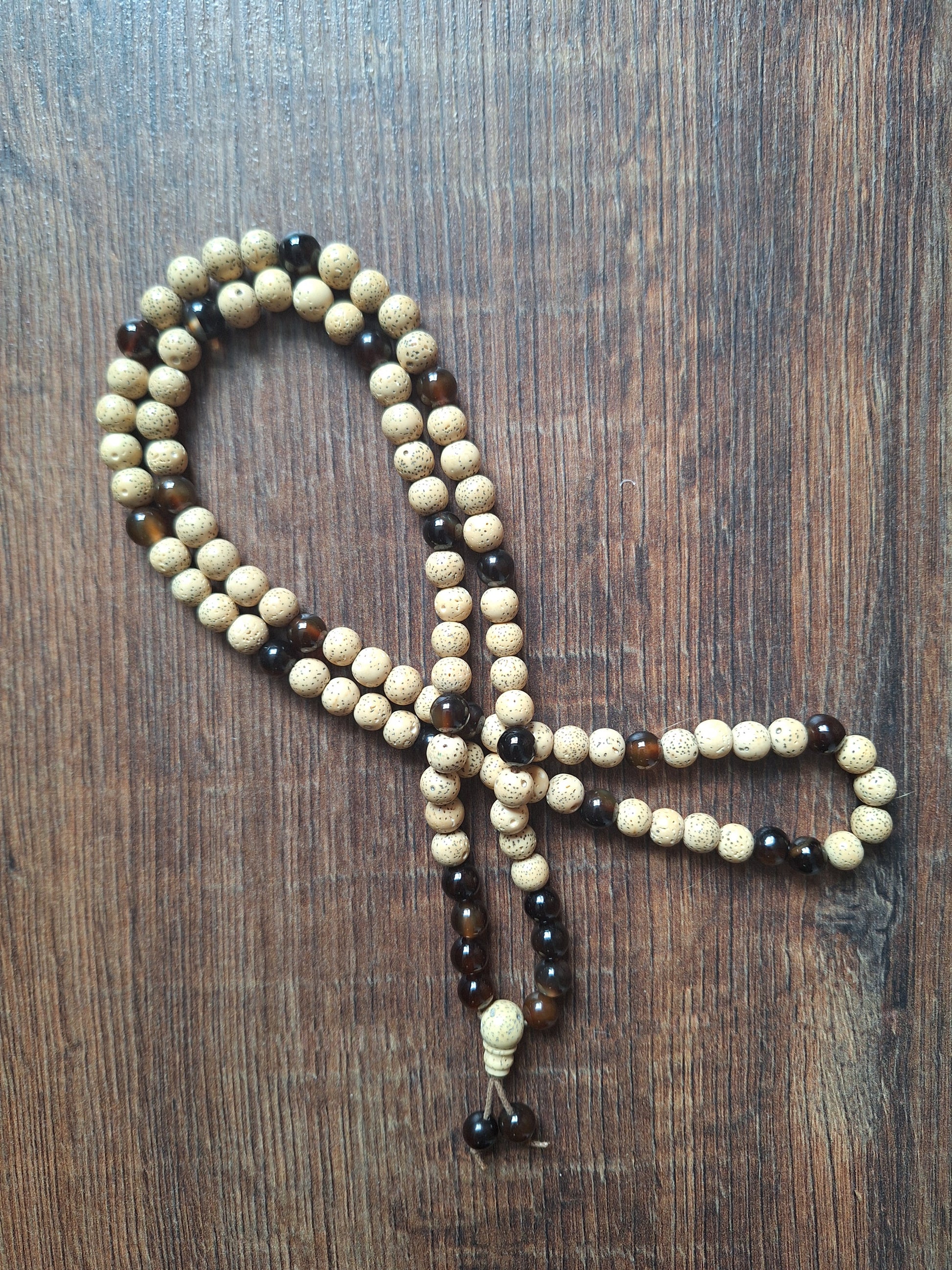 In this mala, the Moon and Stars bodhi seads have been combined with beads of agate, in a transparant dark-brown color with some white accents. There are many different energetic-spiritual dynamics attributed to agate, but in mala's such as these it is added especially for its grounding, stabilizing and calming properties. It helps to attain mental and emotional stability and an overall feeling of peace and safety.