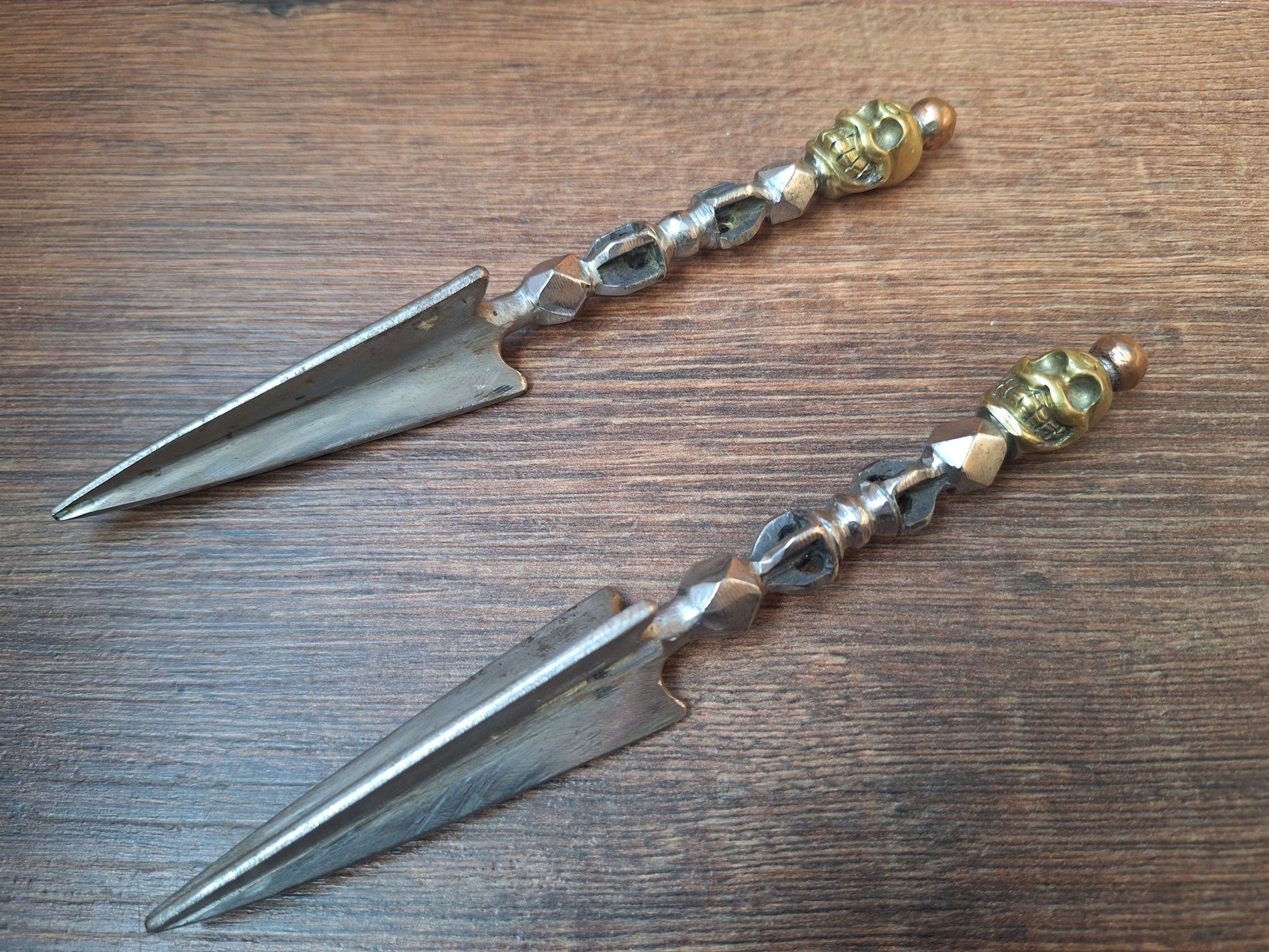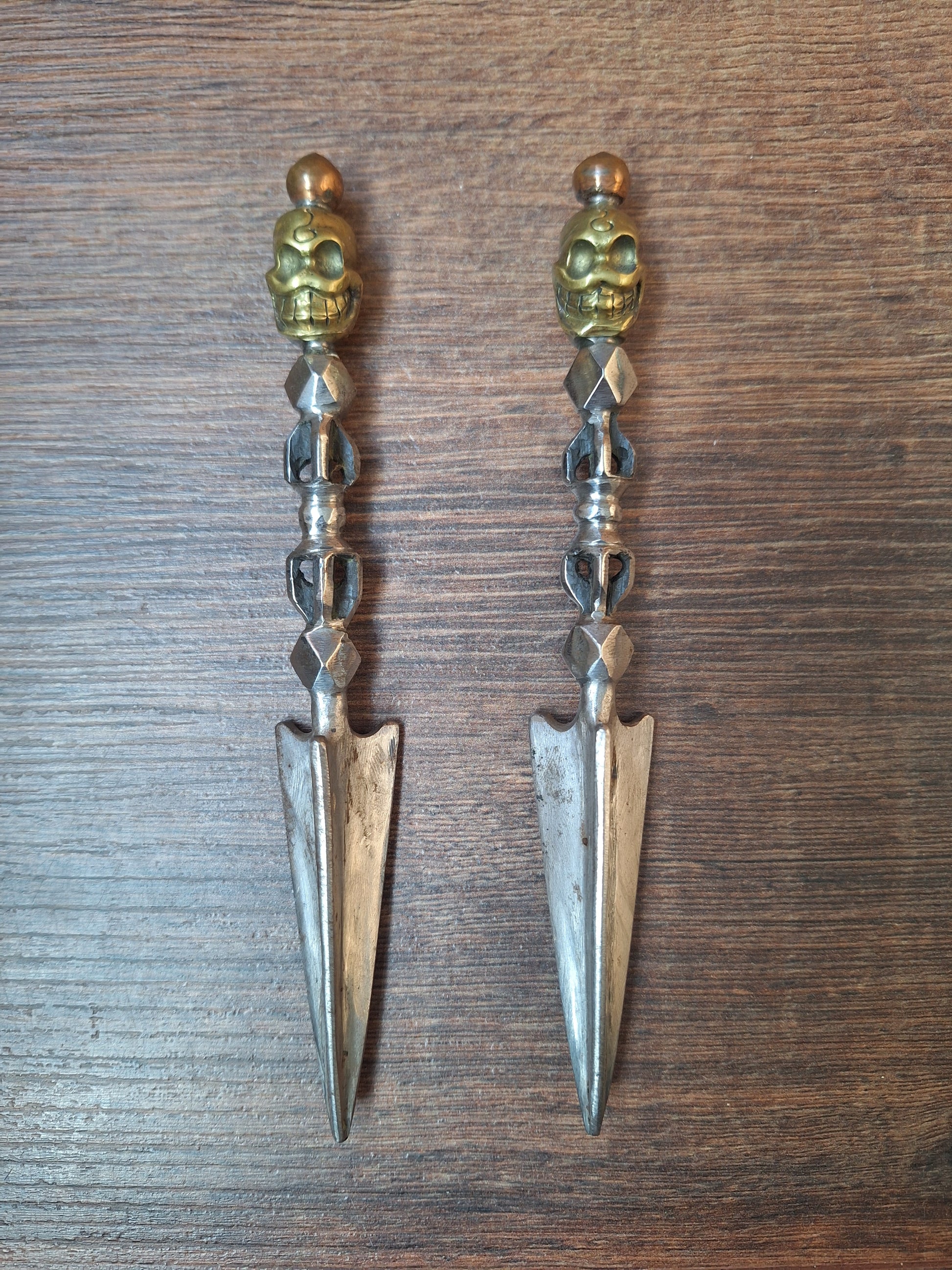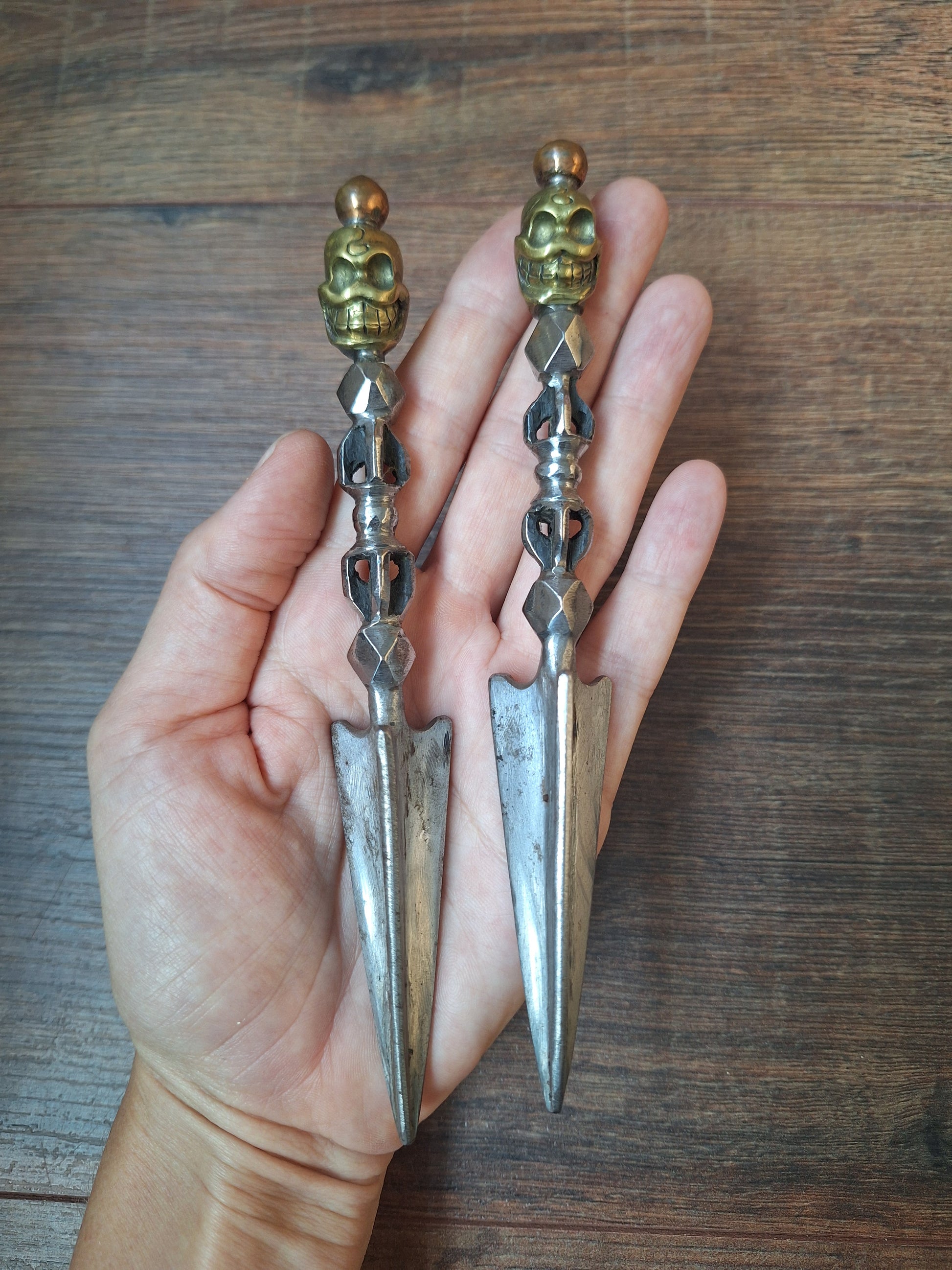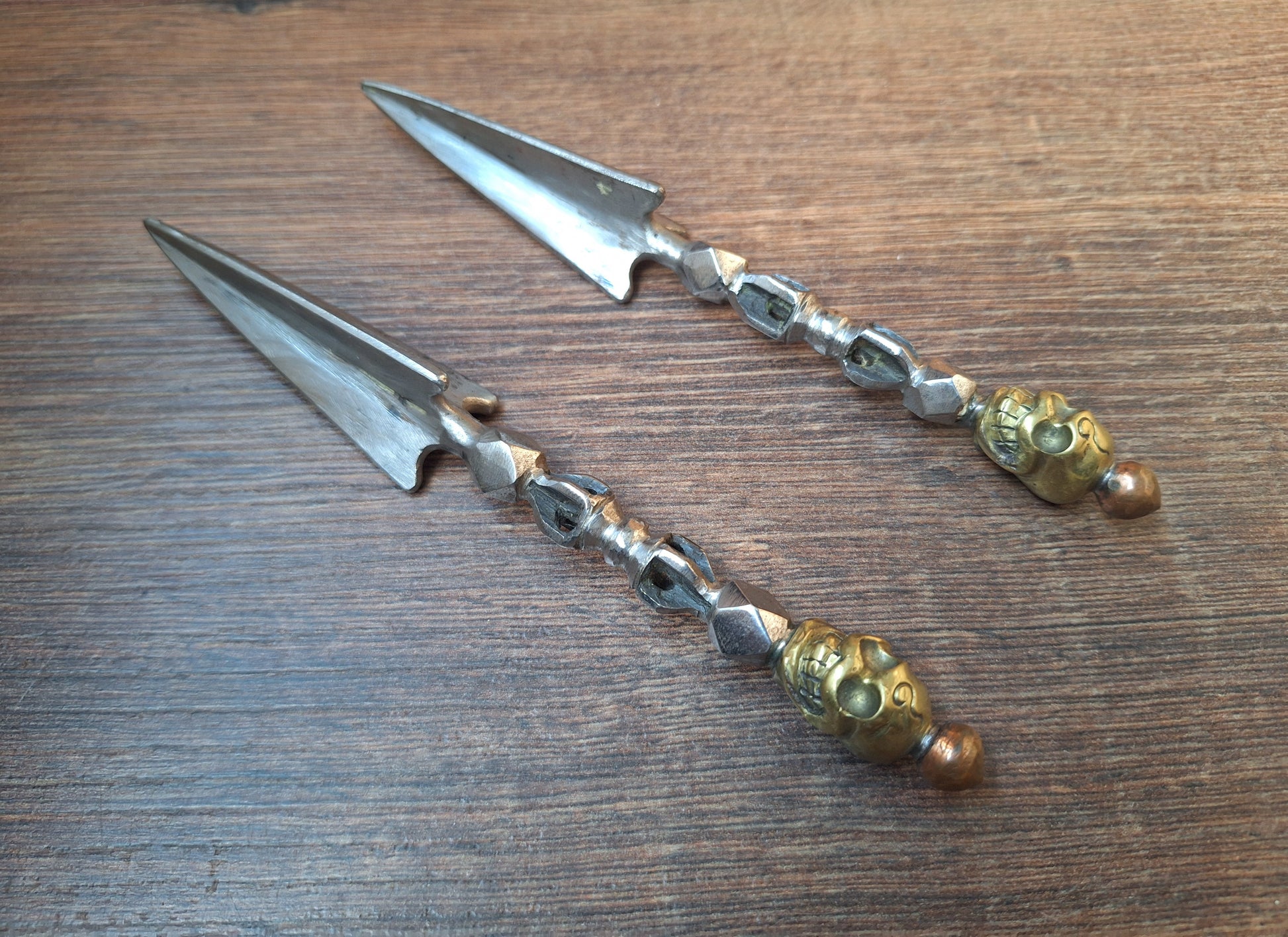 Recently made iron phurba's from Nepal, painted with brass and copper colored details. With a handy, somewhat smaller size and weight.