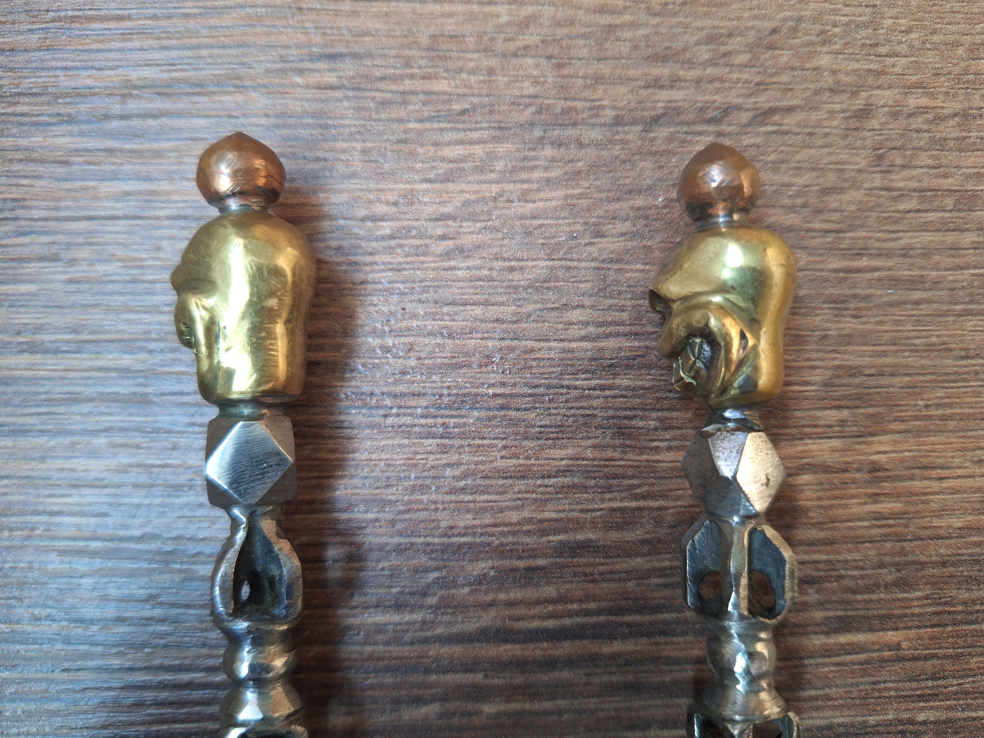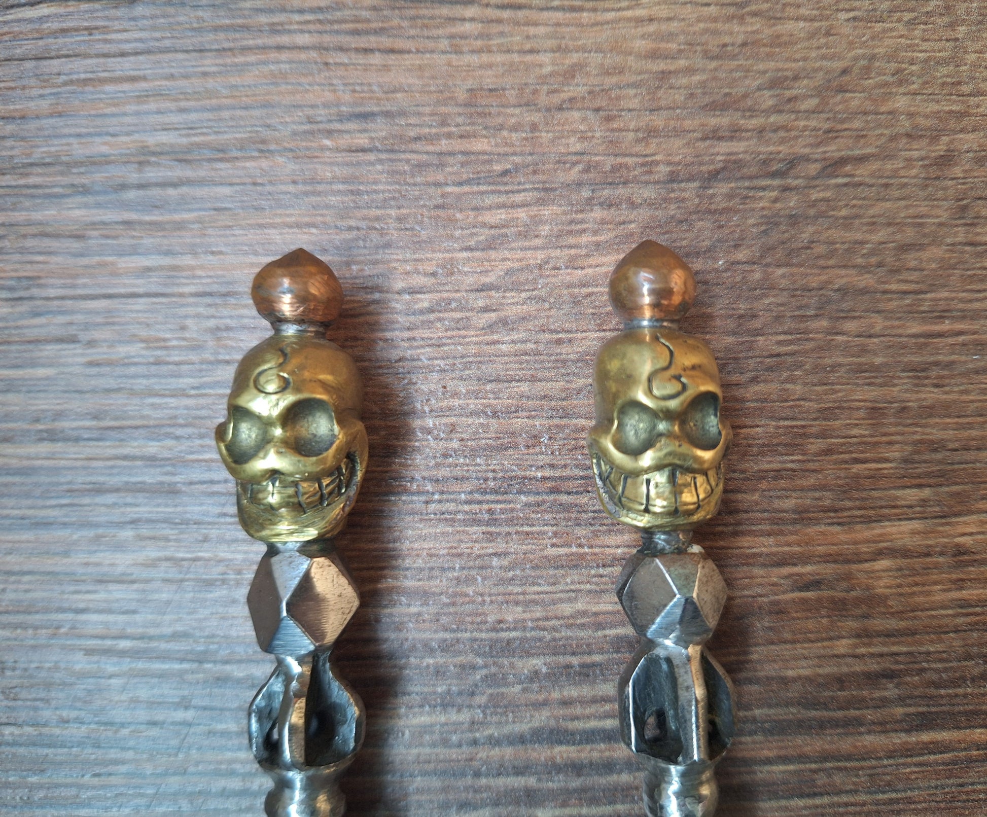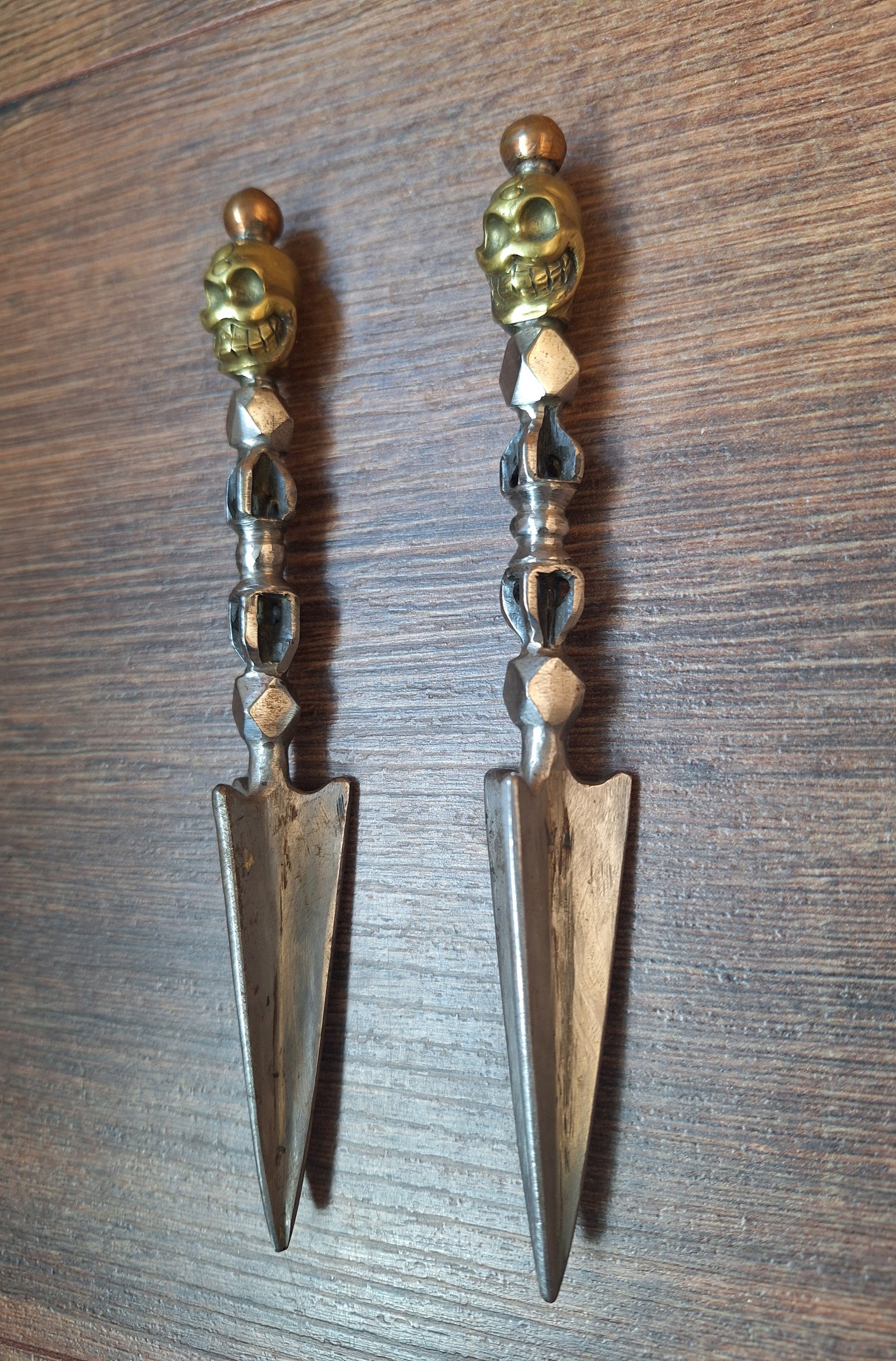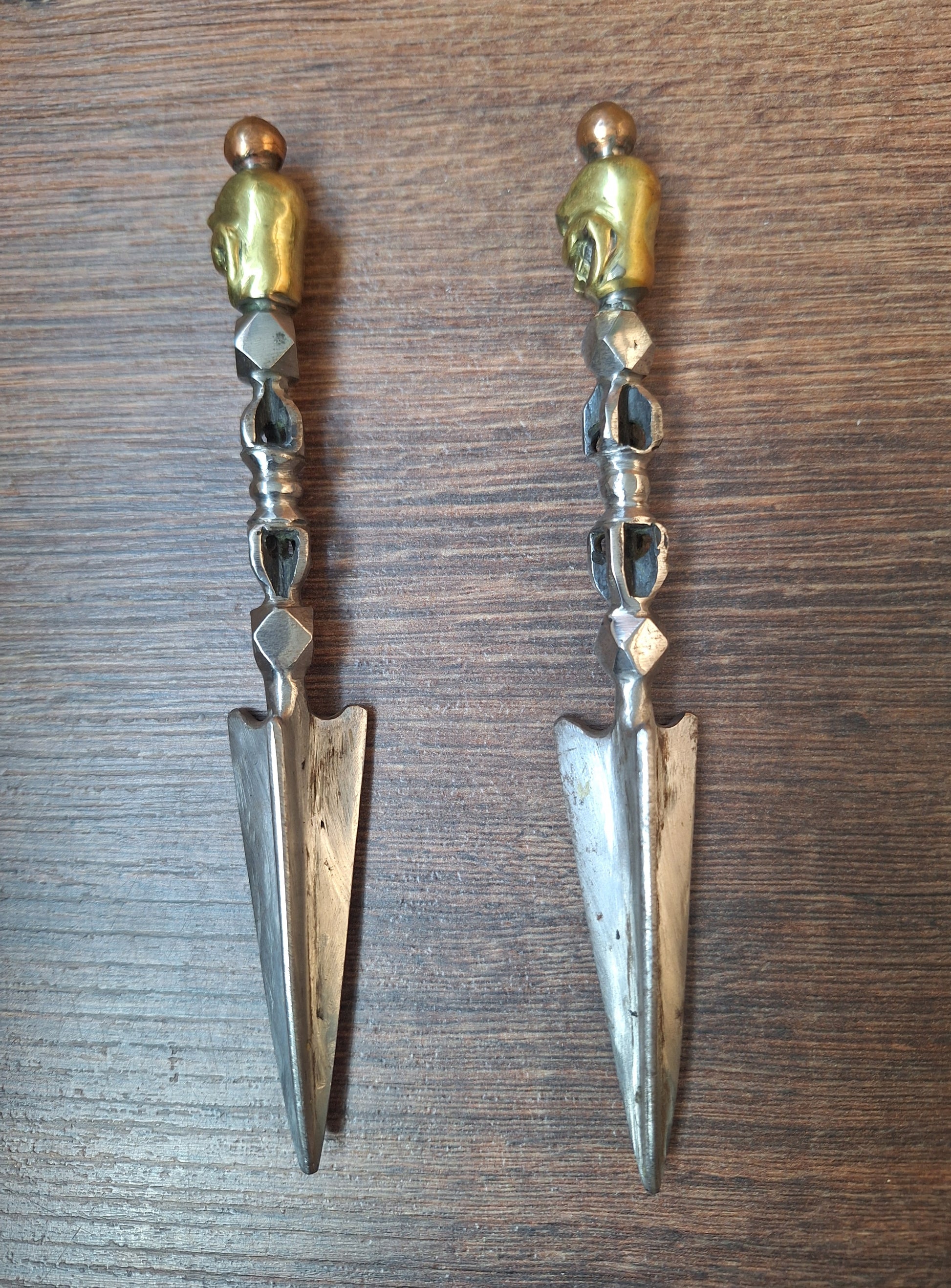 Recently made iron phurba's from Nepal, painted with brass and copper colored details. With a handy, somewhat smaller size and weight.