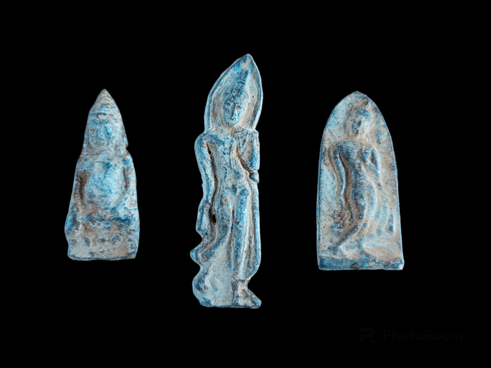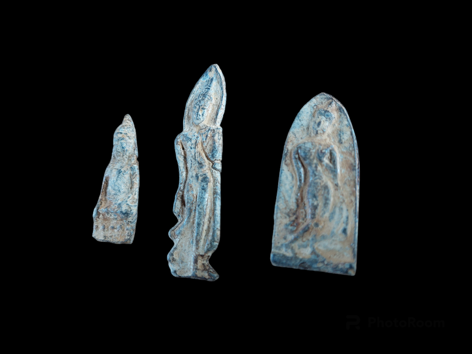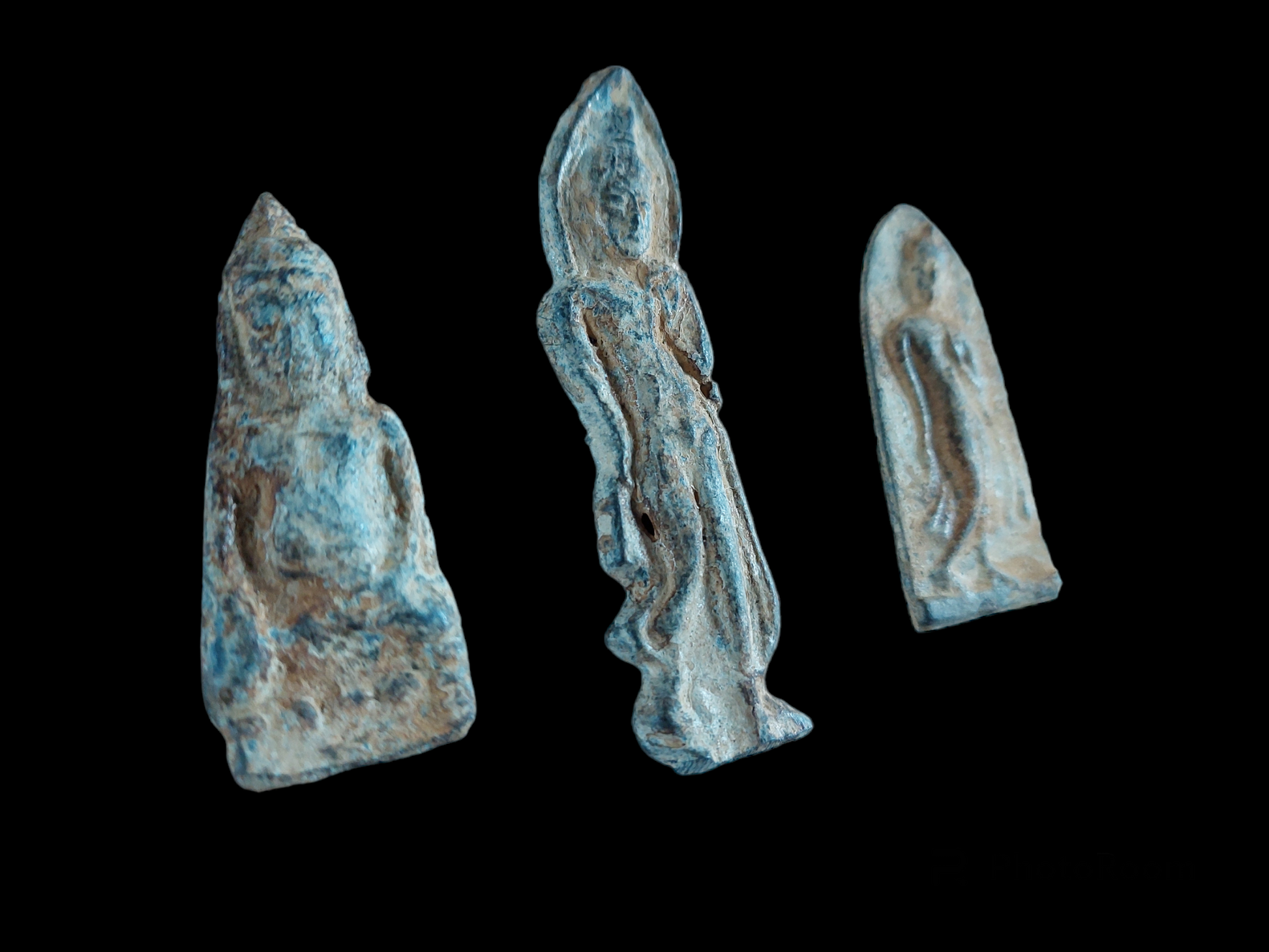 Old buddhist amulets from Thailand. Amulets such as these are also referred to as 'votive tablets'. They depict for example the buddha in various postures, saints or famous monks. Amulets such as these are mostly given as presents at buddhist temples, after a donation or offering has been made. In this way, they help to raise funds for the temple and its projects.
