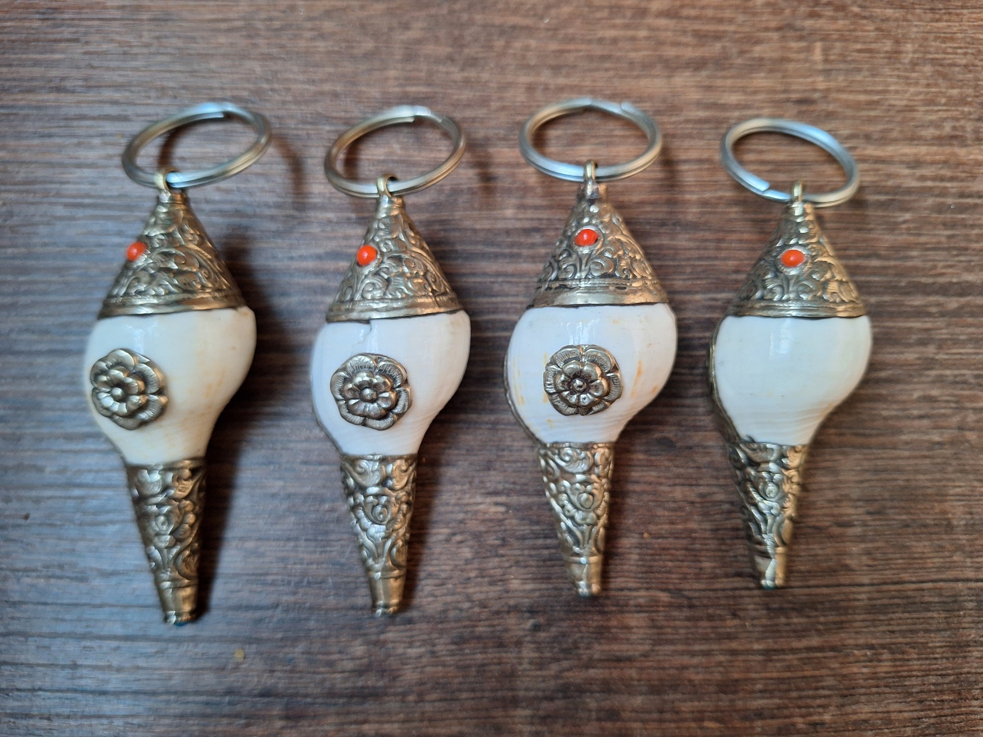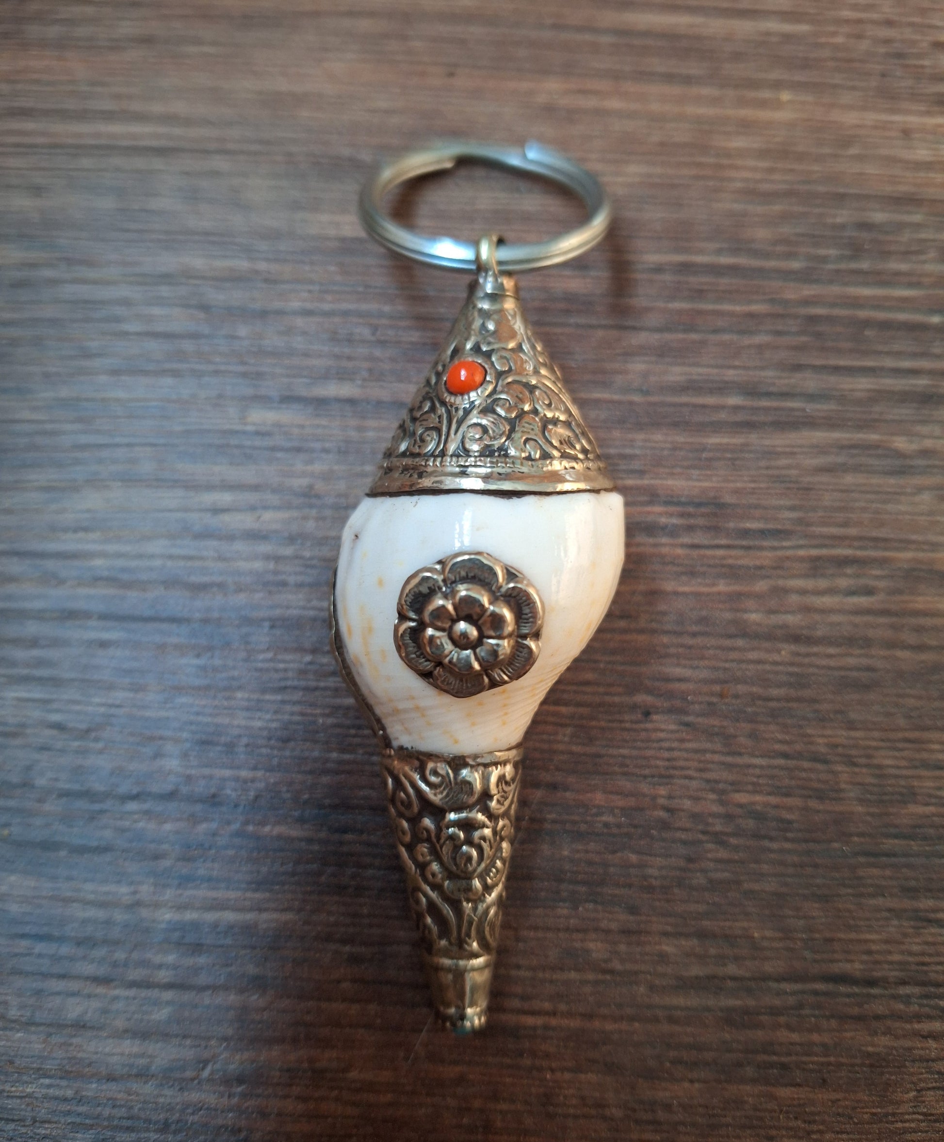 These keychains here in our shop are made with real conch shells (sankha) in very nicely detailed Tibetan silver settings, decorated with (faux) coral and turquoise cabochons. Of course the keychain-rings can also be taken off, to use the conch shells as pendants for jewelry or amulets.