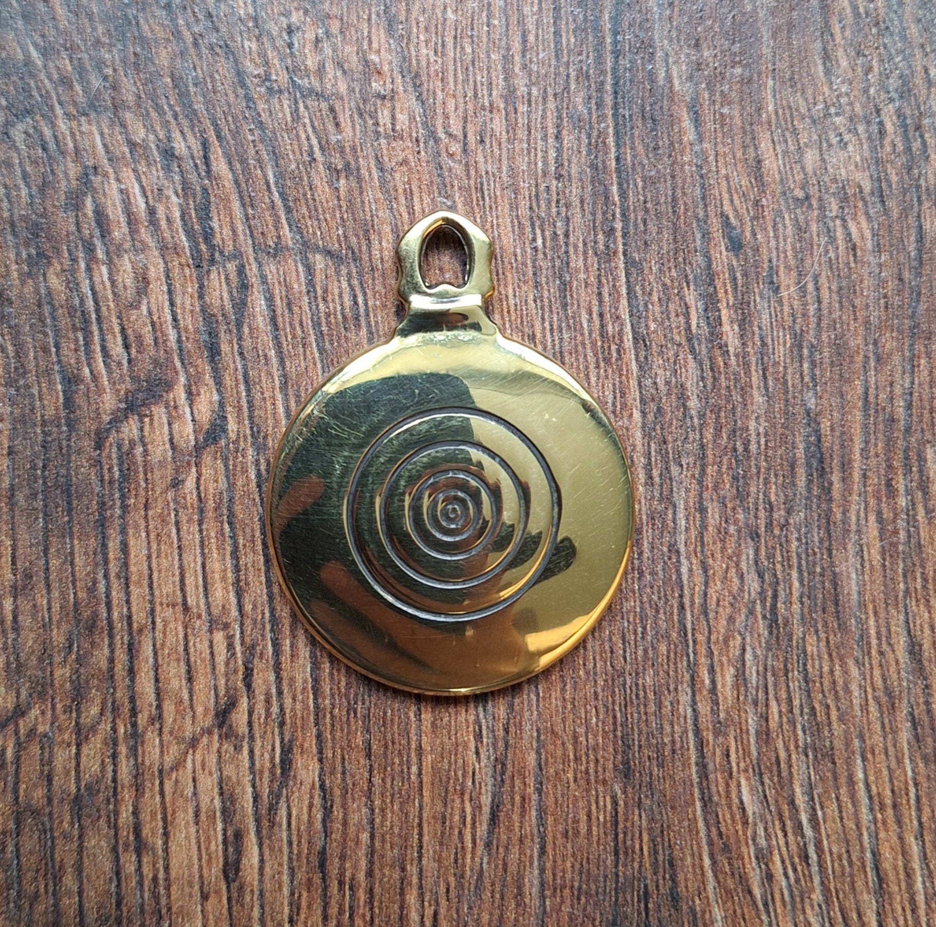 On the frontside of this mirror a depiction of concentric circles can be seen. They symbolize a correctly focused attention, through which the energyflow between the wearer and the universe is very precisely connected and directed, without being scattered or disturbed.