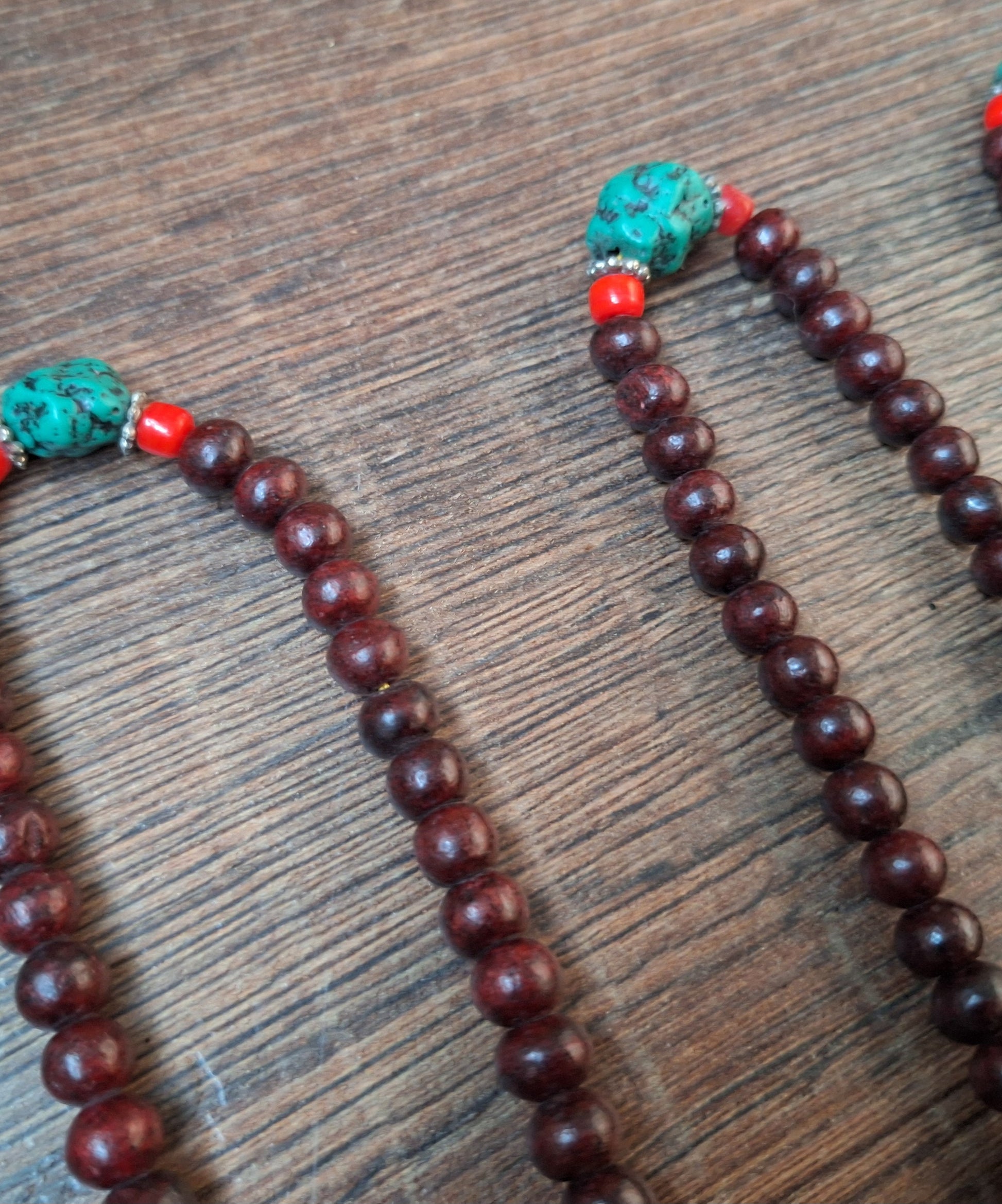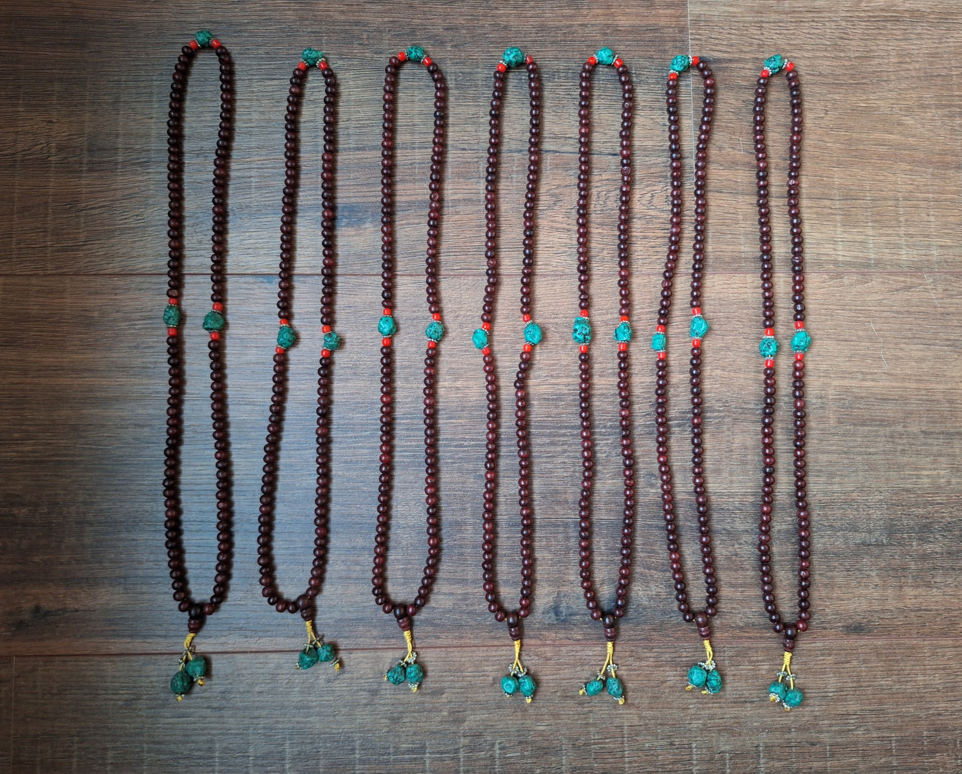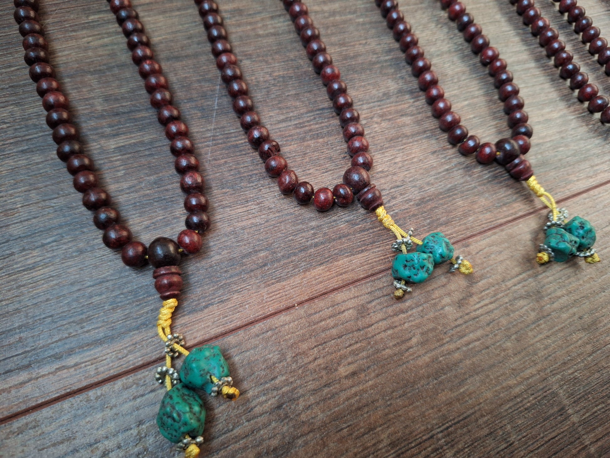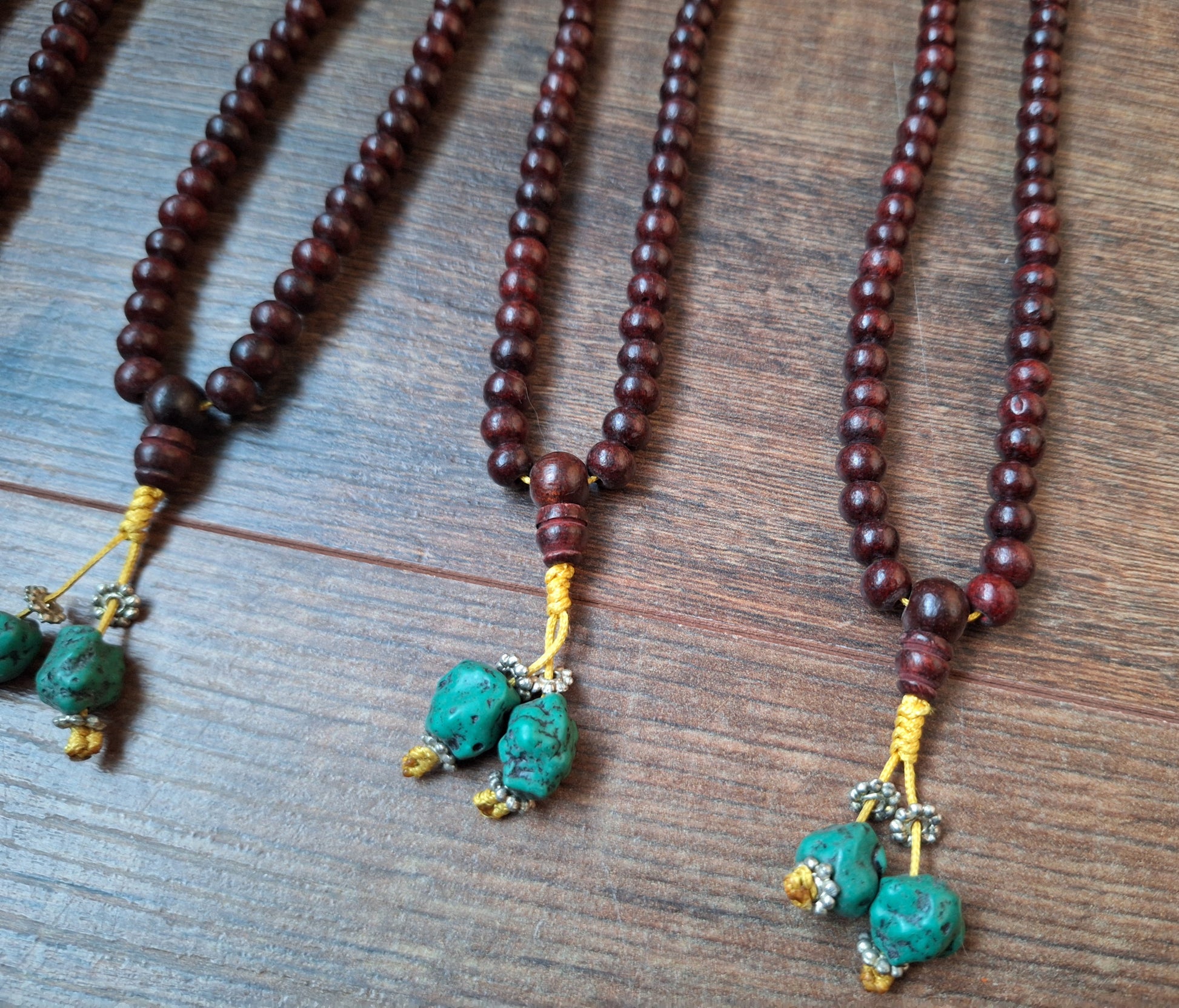 These mala's are made with beautiful shiny dark red-brown rosewood beads, strung on yellow nylon macrame cord. The rosewood beads have been combined with some turquoise colored howlite beads, red glass beads and alpaca metal spacers.