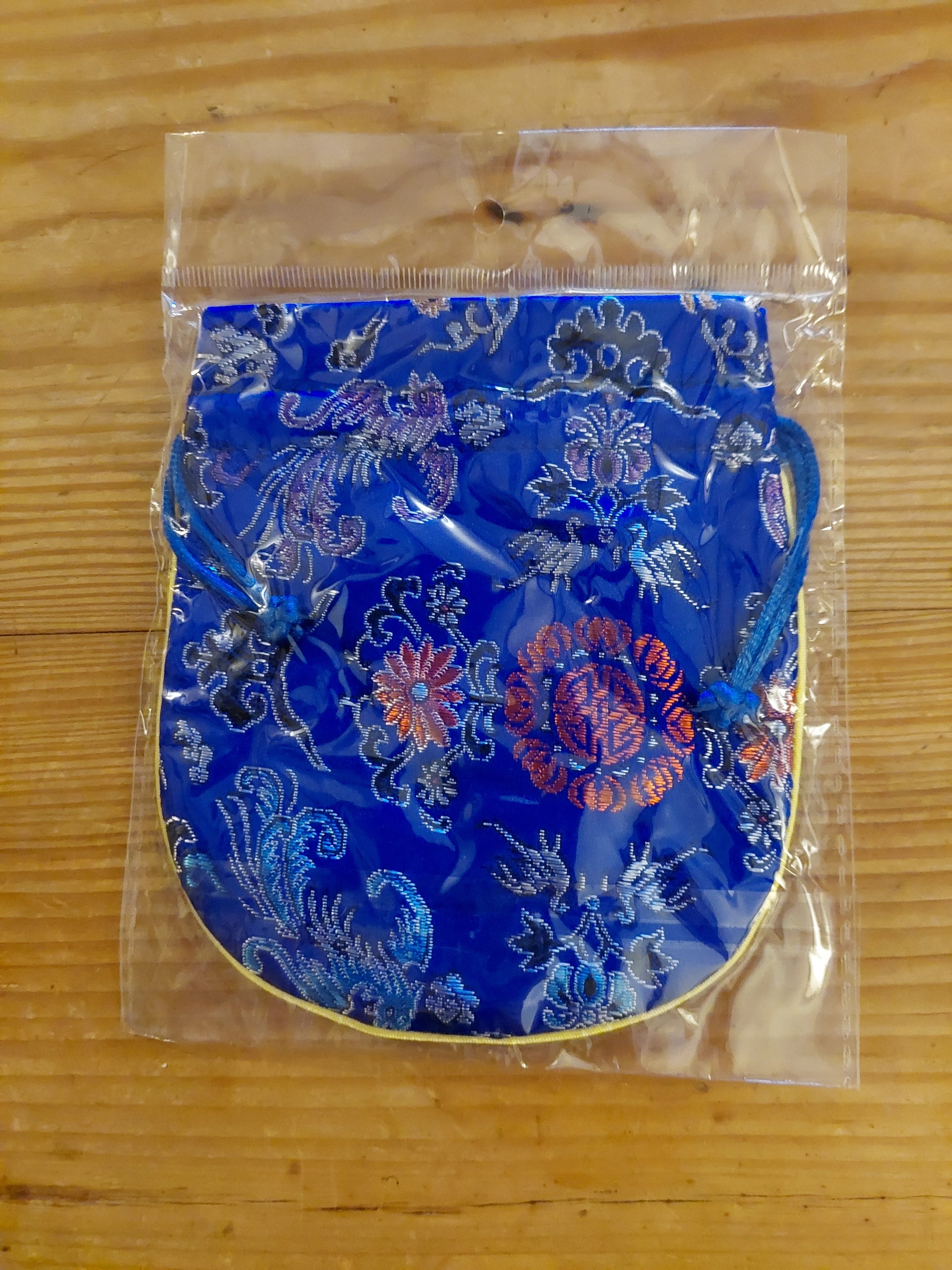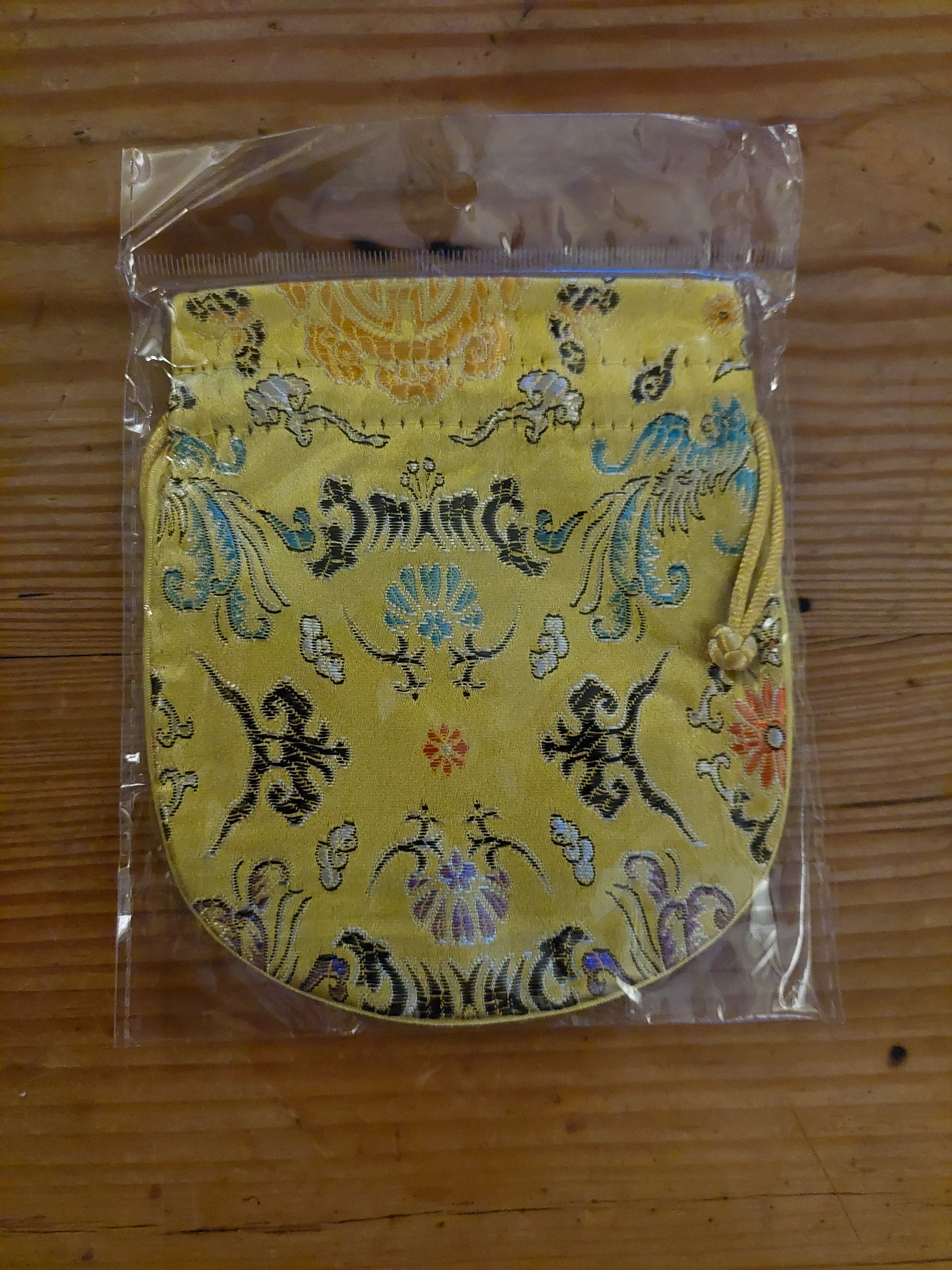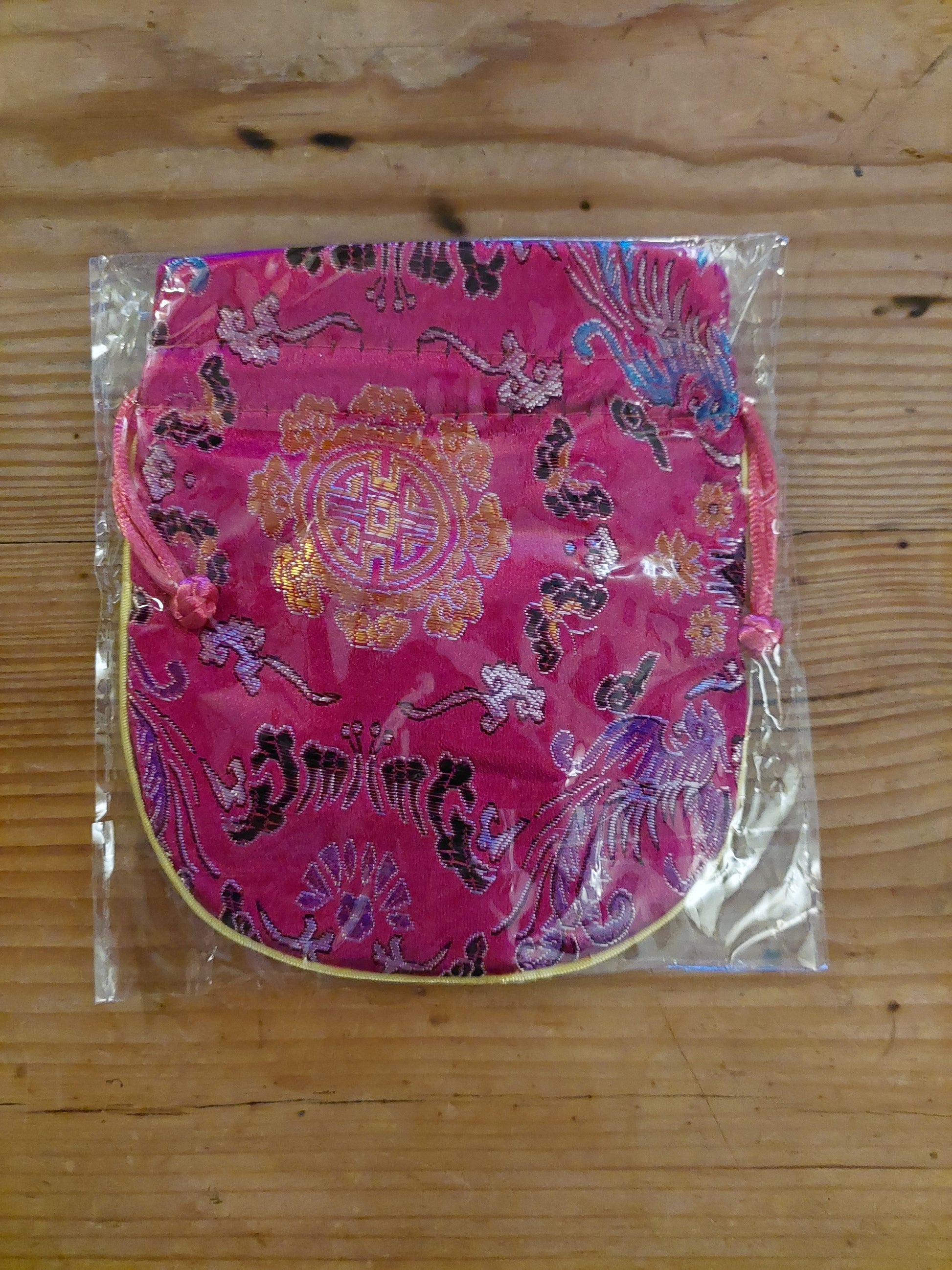 Pouch made from colorful and shiny Tibetan silk. Very good, heavy quality double fabric with red lining.
