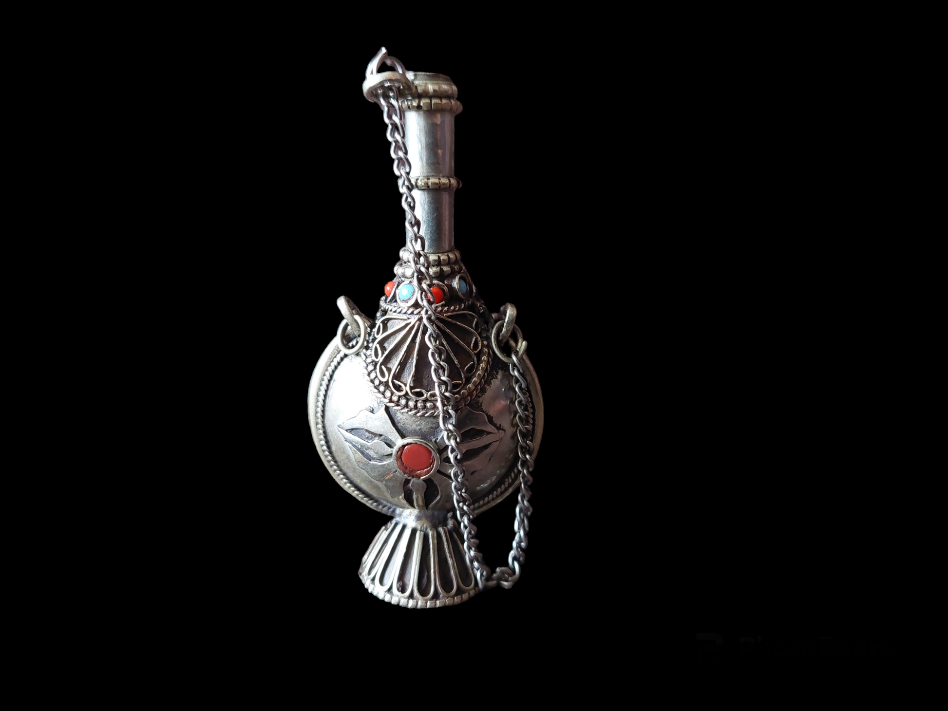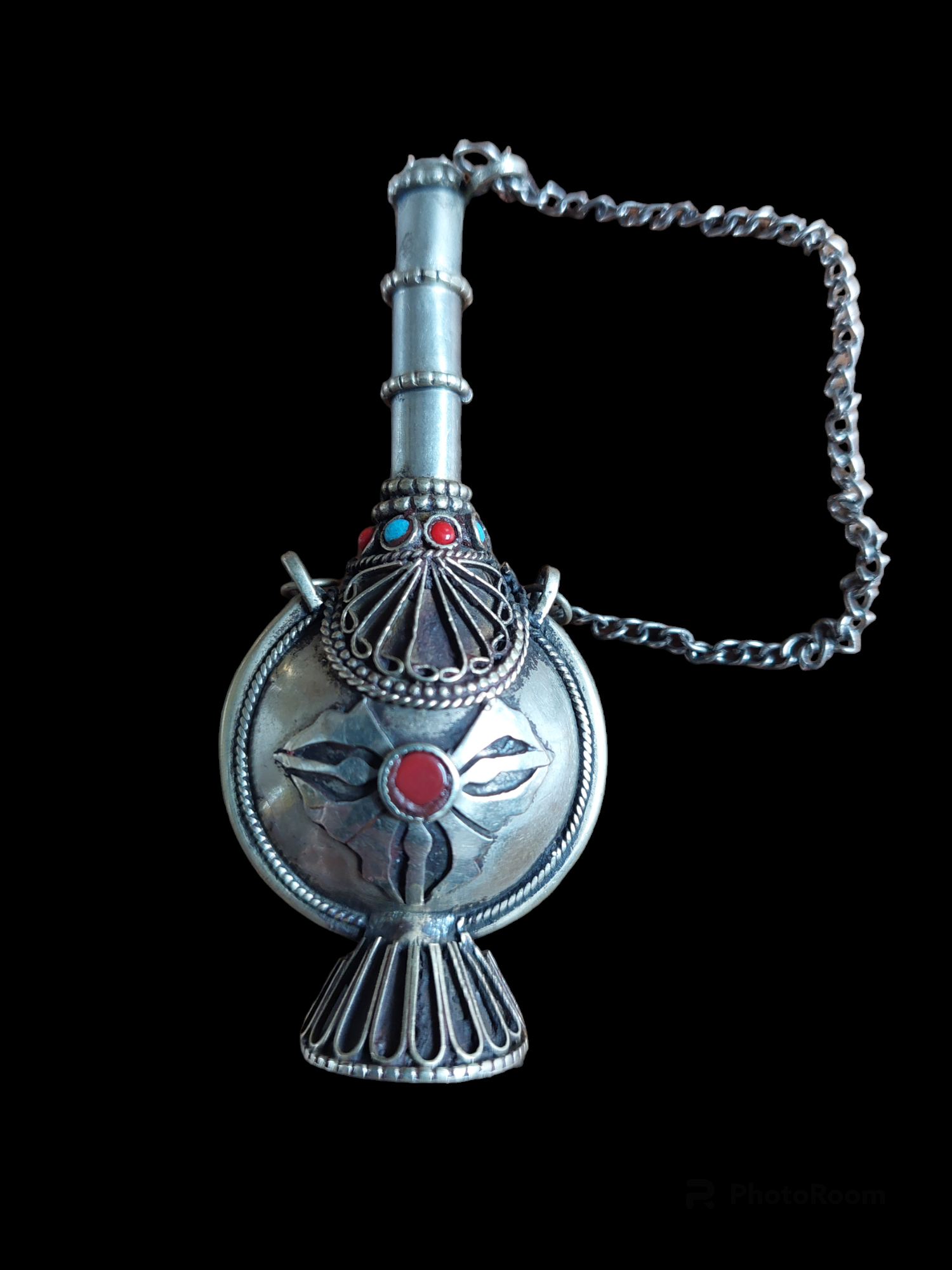 This beautiful little Tibetan snuff bottle has been made from Tibetan silver, decorated with the image of a double dorje and with an inlay of (faux) turquoise and coral stones. Little bottles such as these were often made by the most excellent craftsmen such as silversmiths and jewelrymakers. Because of this beautiful craftmanship, they are nowadays still considered very valuable collectors items.