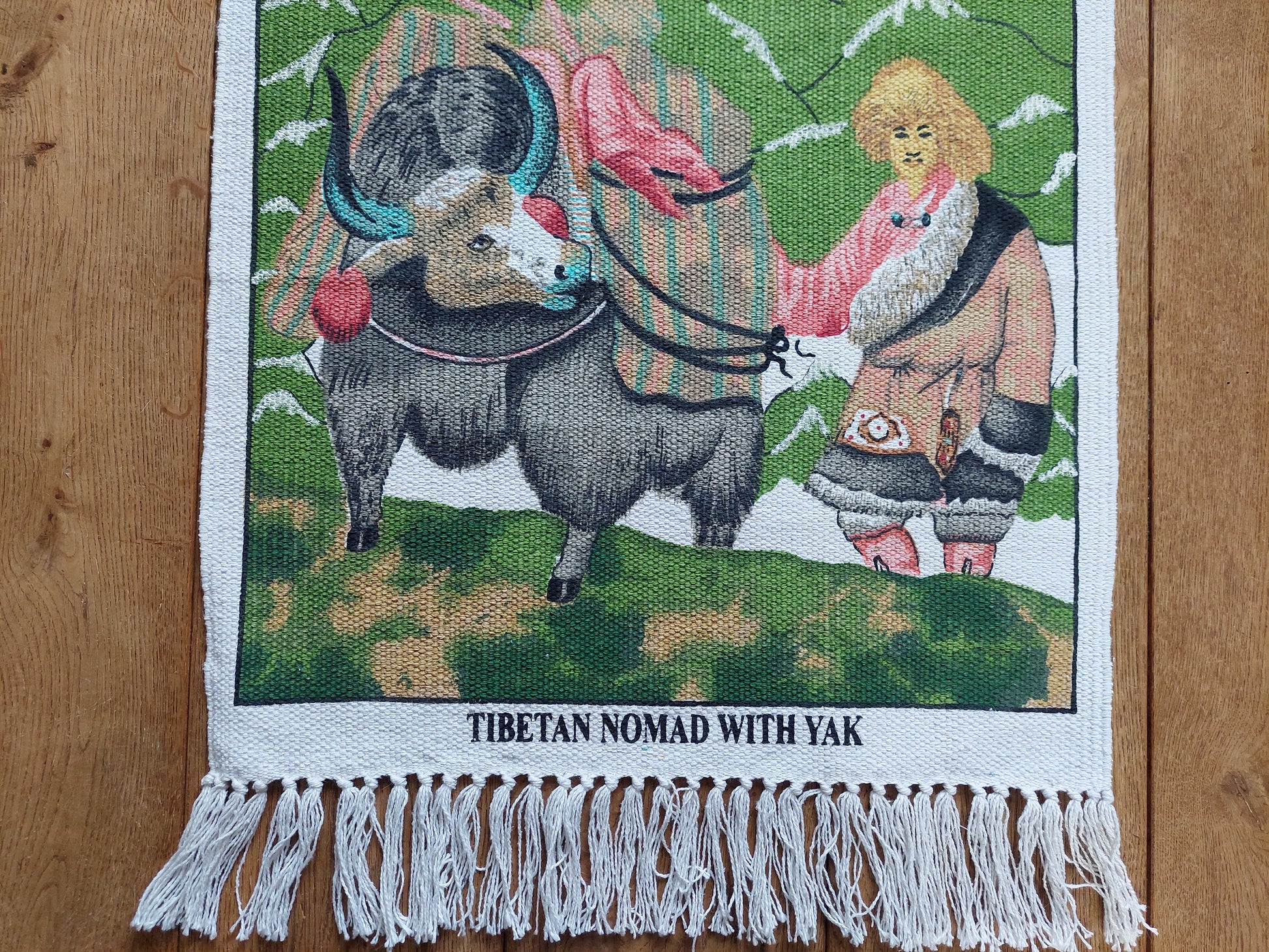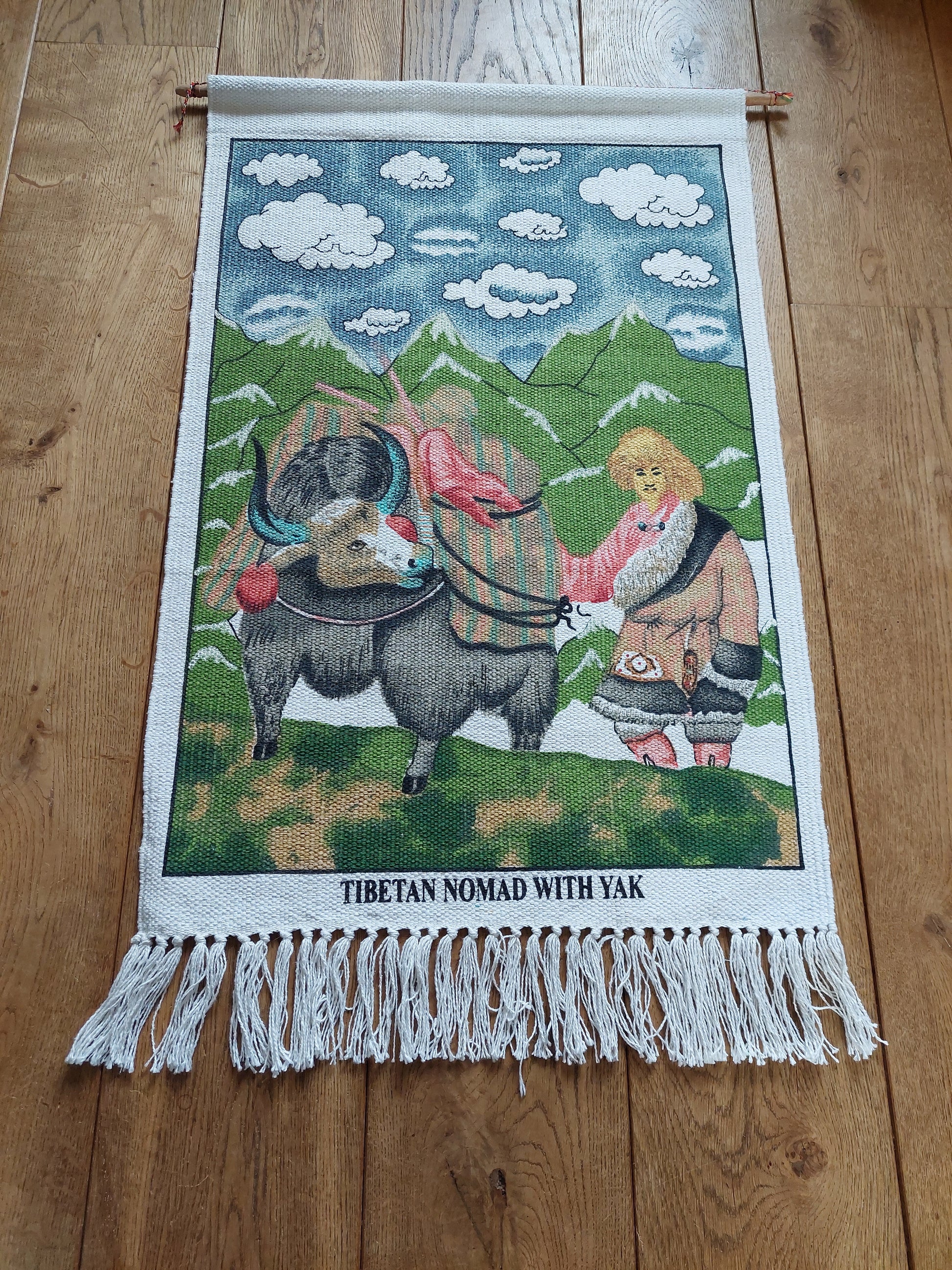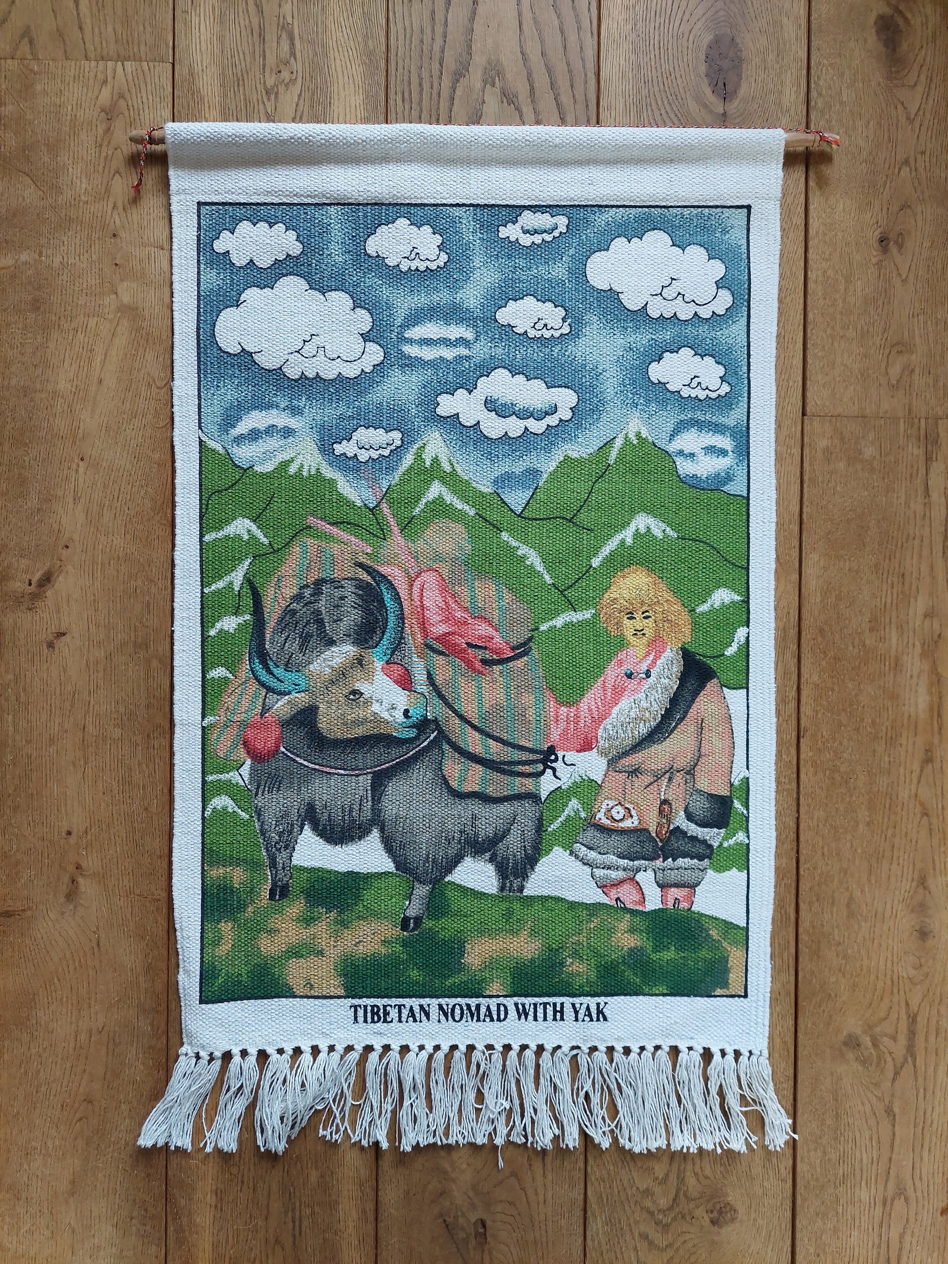 Decorative wallhanger made from sturdy cotton, painted with the motive "Tibetan nomad with yak".