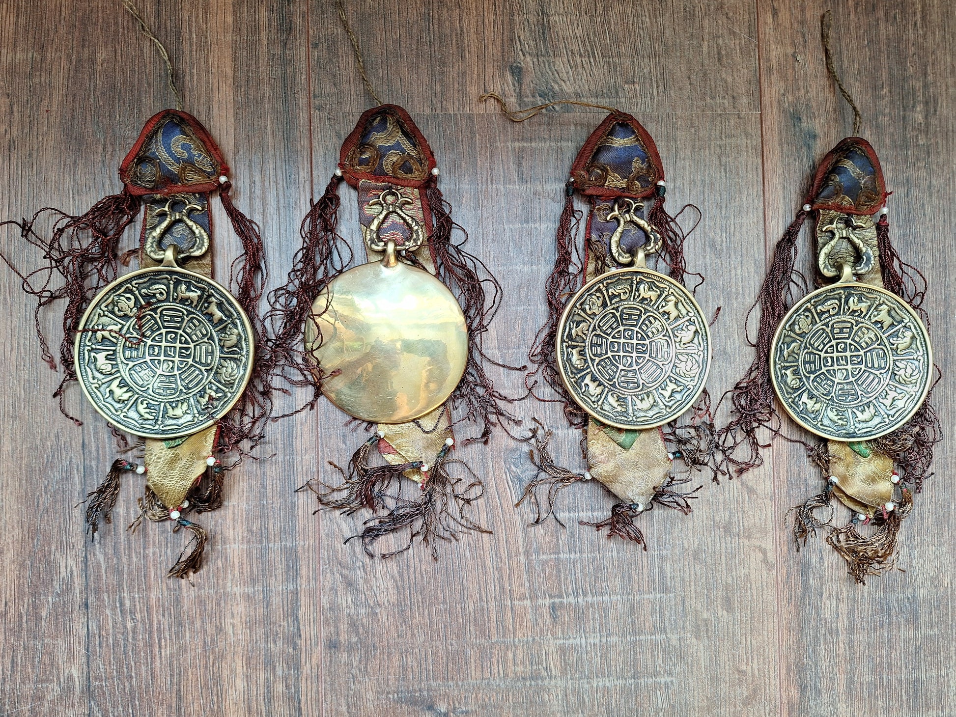 The melongs used for these wallhanging amulets have a diameter of 85 millimeters (measured without their eyelets) and are made from a thick, heavy layer of brass.