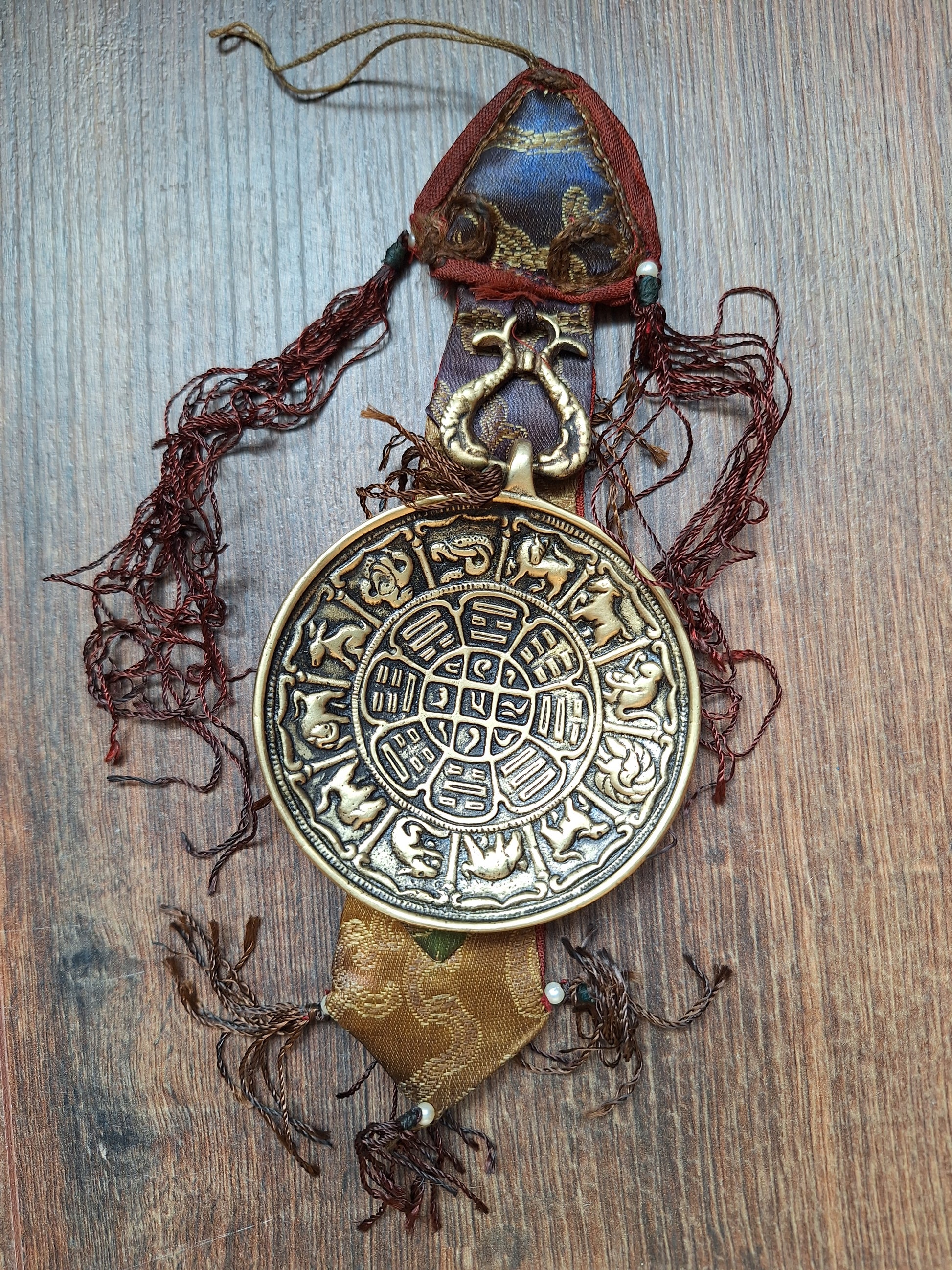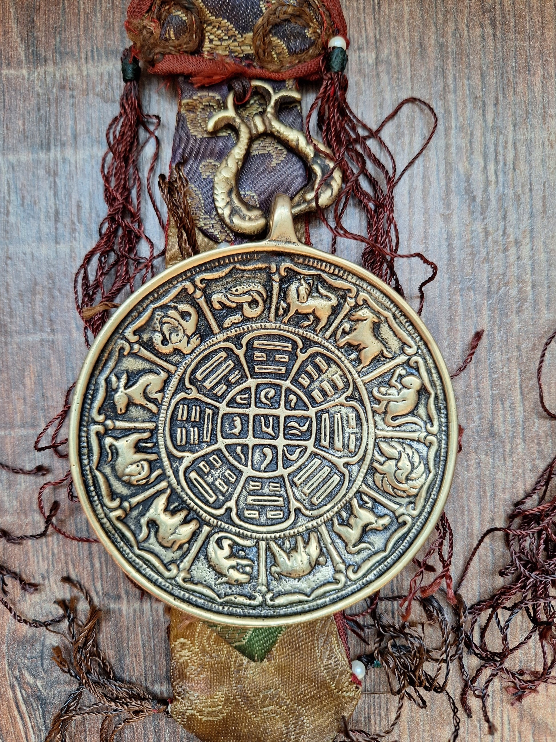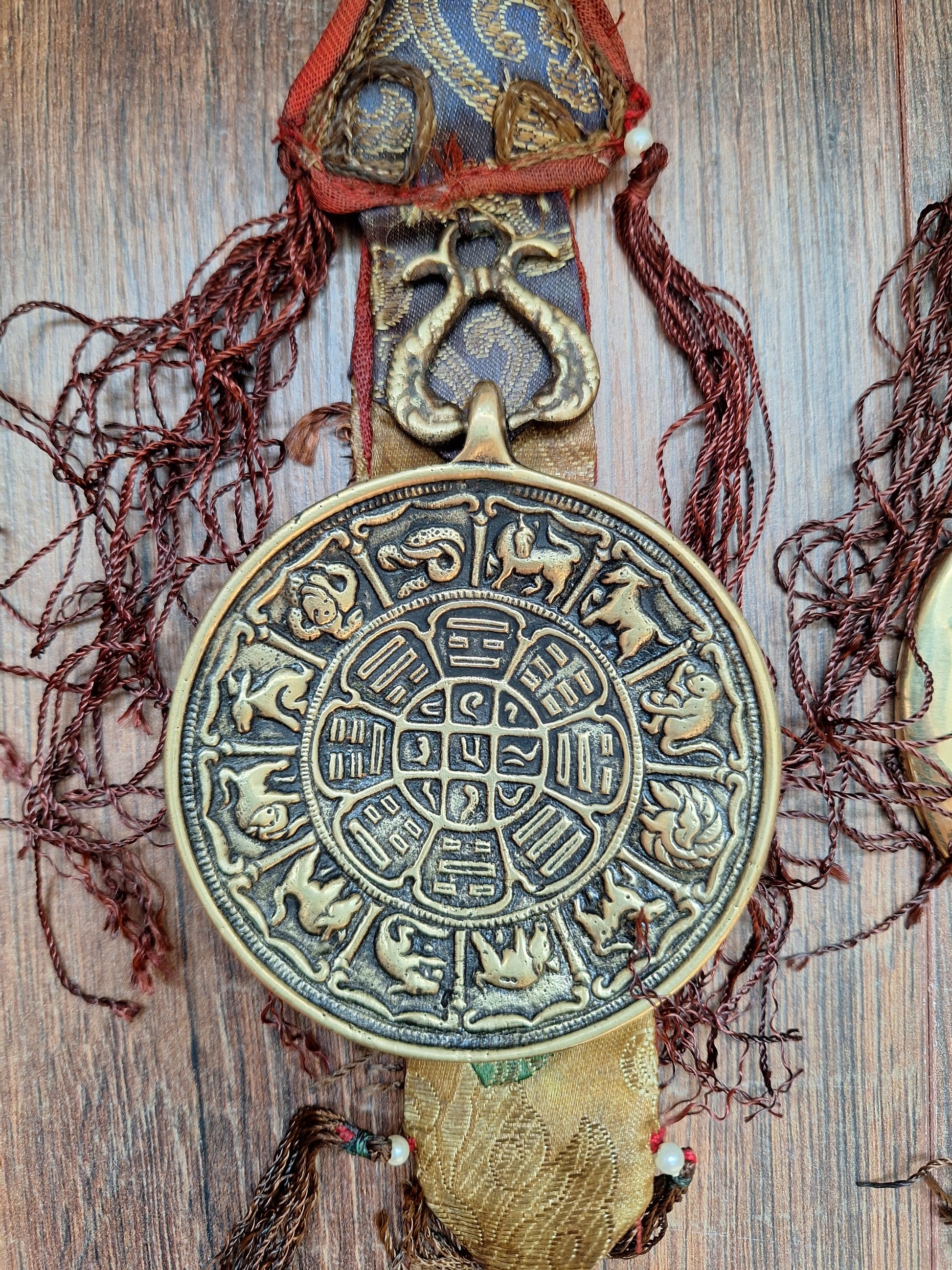 These wallhangers are all made with a thick, heavy brass melong with a depiction of the traditional Tibetan astrological system on the backside; the astrological chart of Si Pa Ho, consisting of three schematic images: