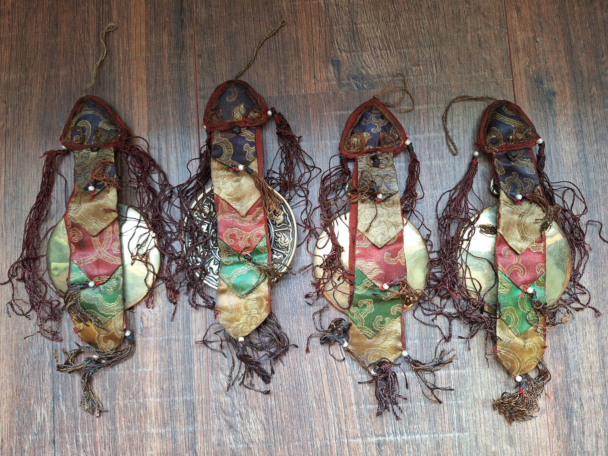 Vintage wall hanging amulets made in the traditional Tibetan Buddhist style in which a symbol, amulet or figurine is combined with a banner of multi-layered silk brocade with tassels.