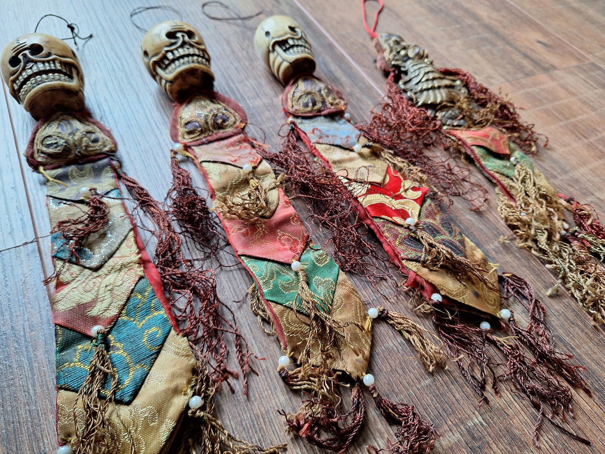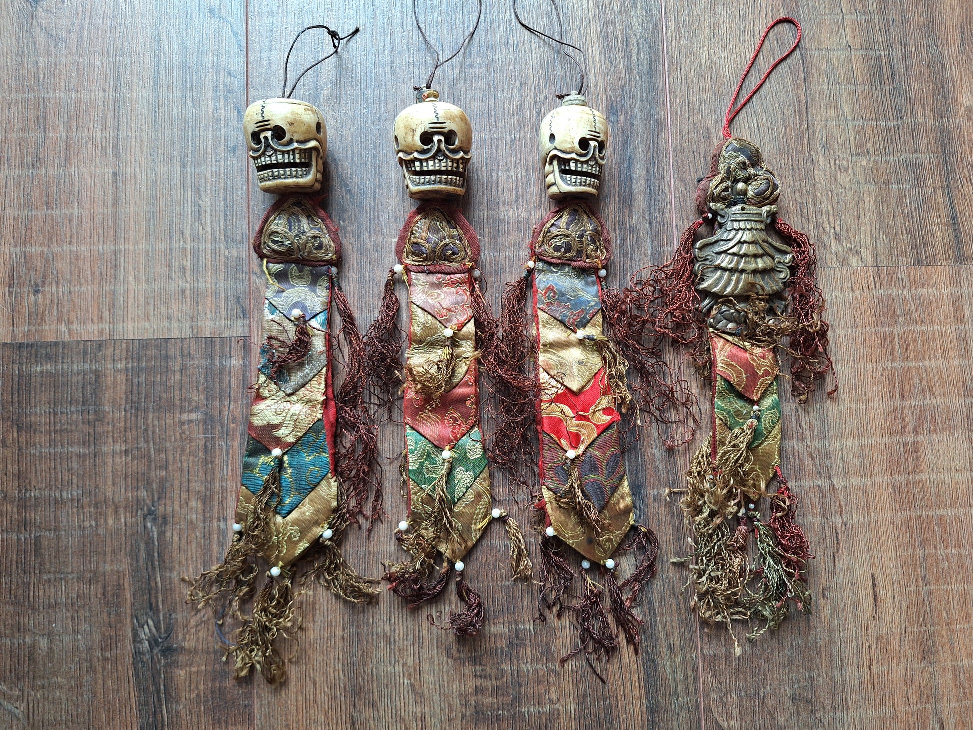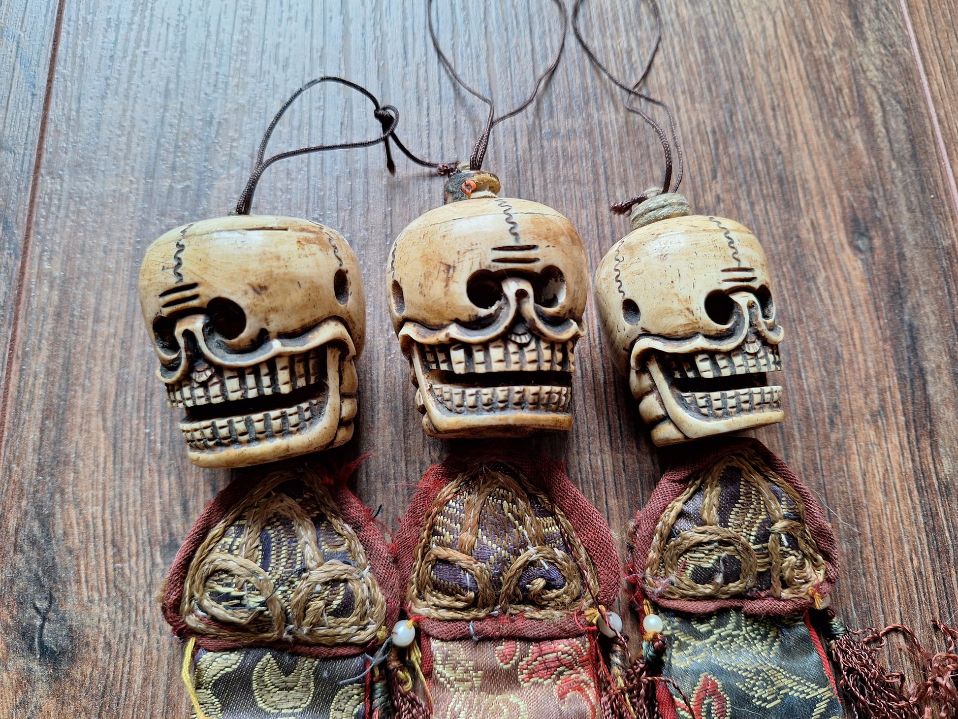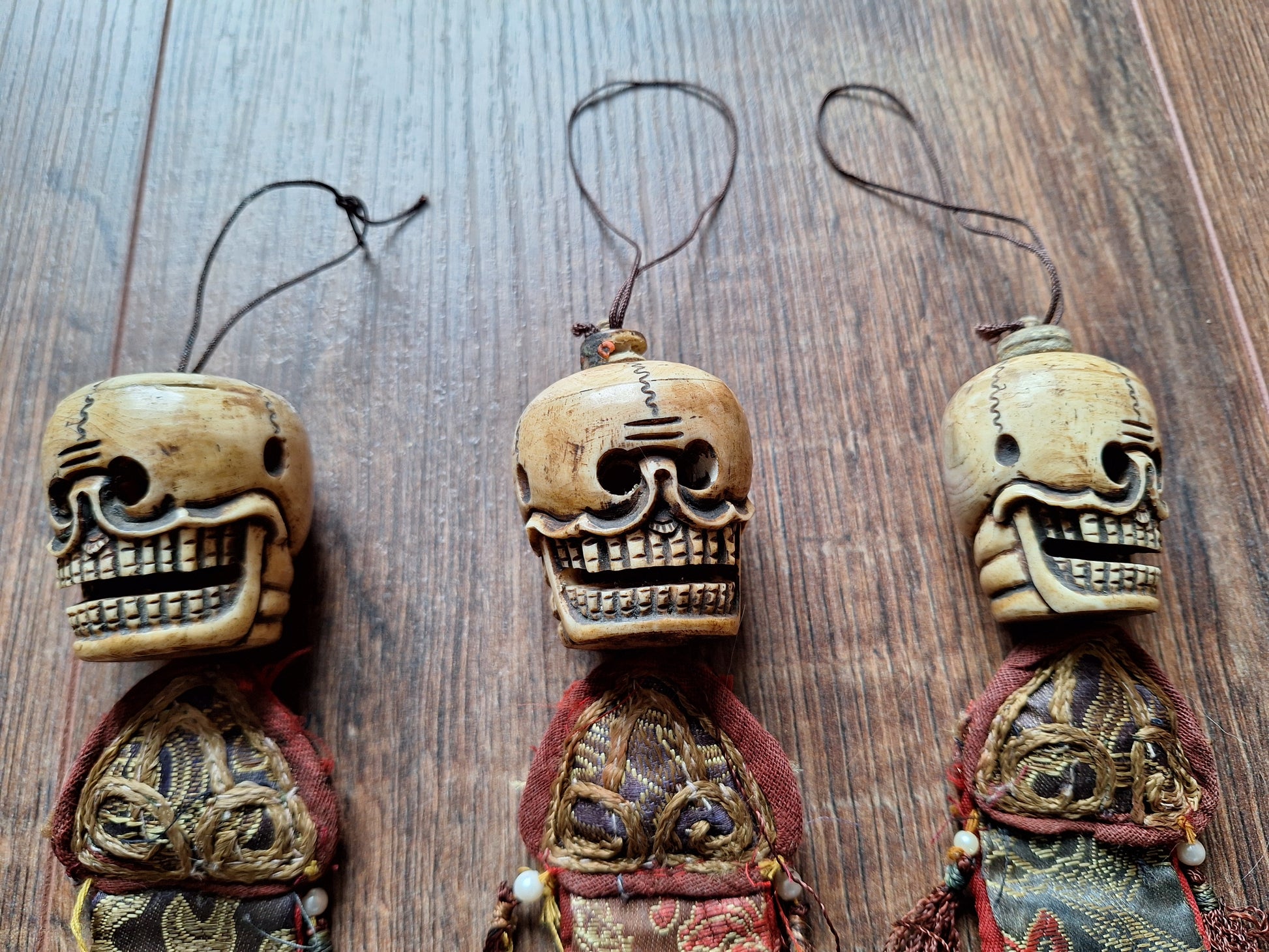 * Three with a large skull bead handcarved from yak bone. These are approximately 31 centimeters long in total (including the fringes), from which the skull is between 4-5 centimeters high.