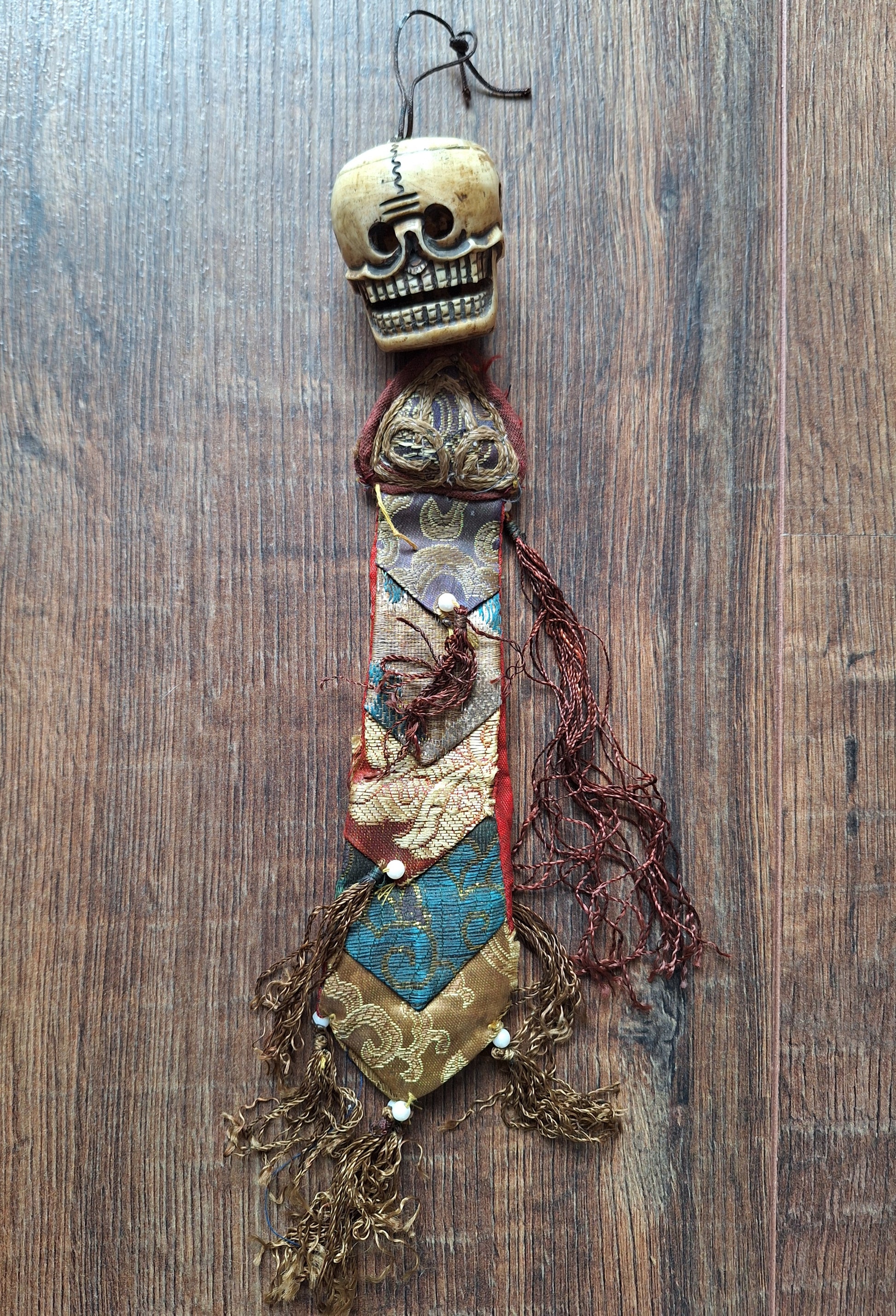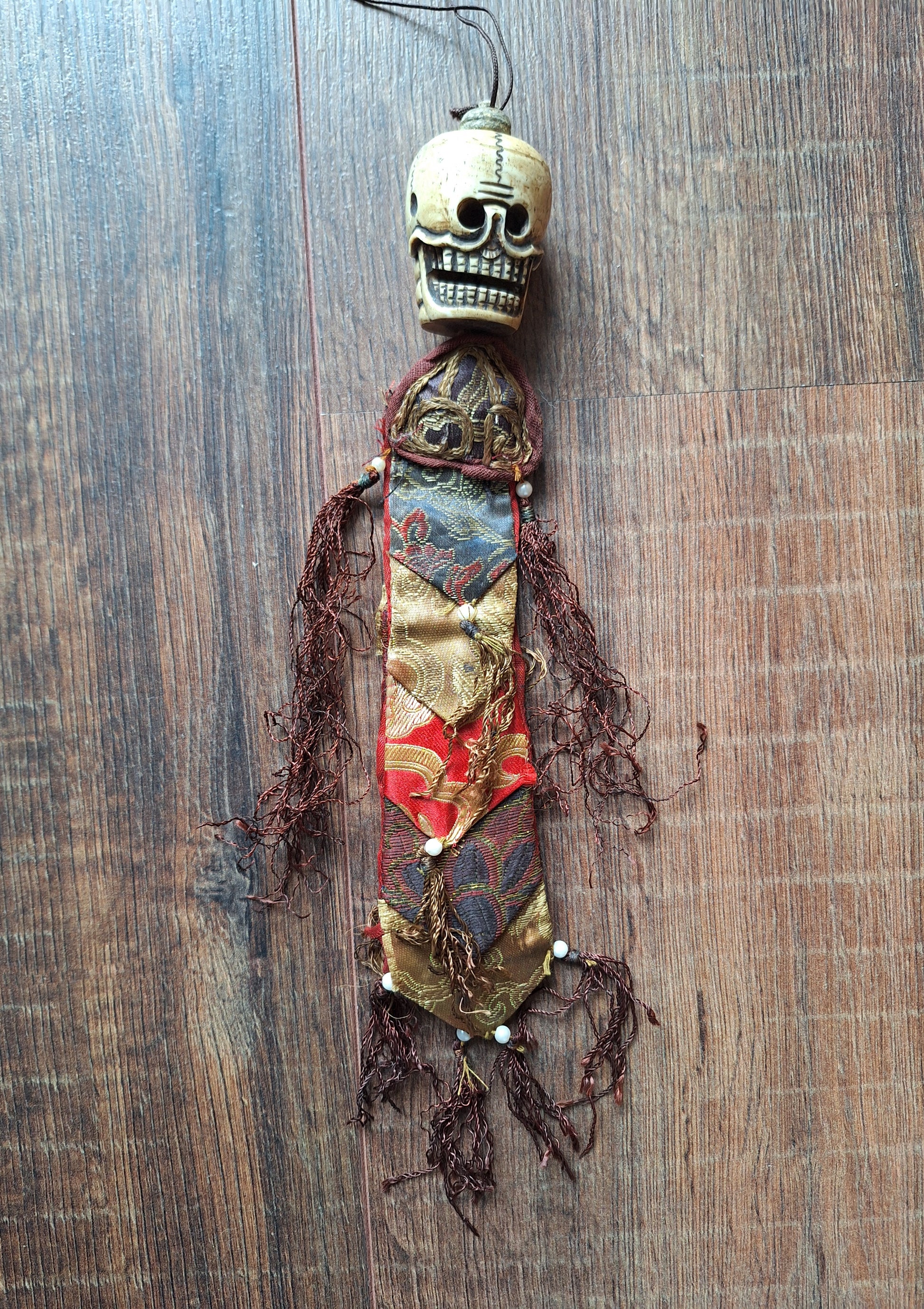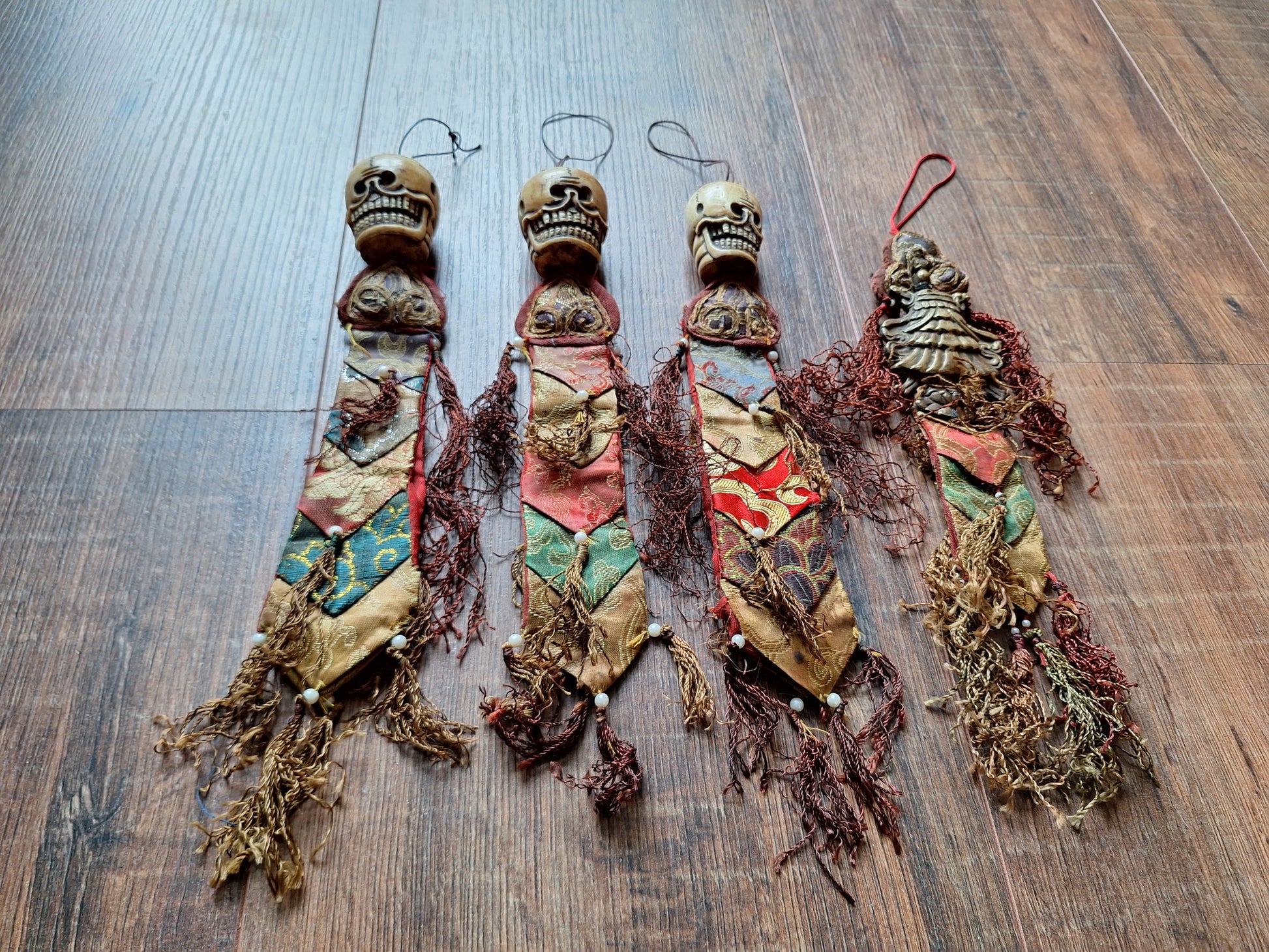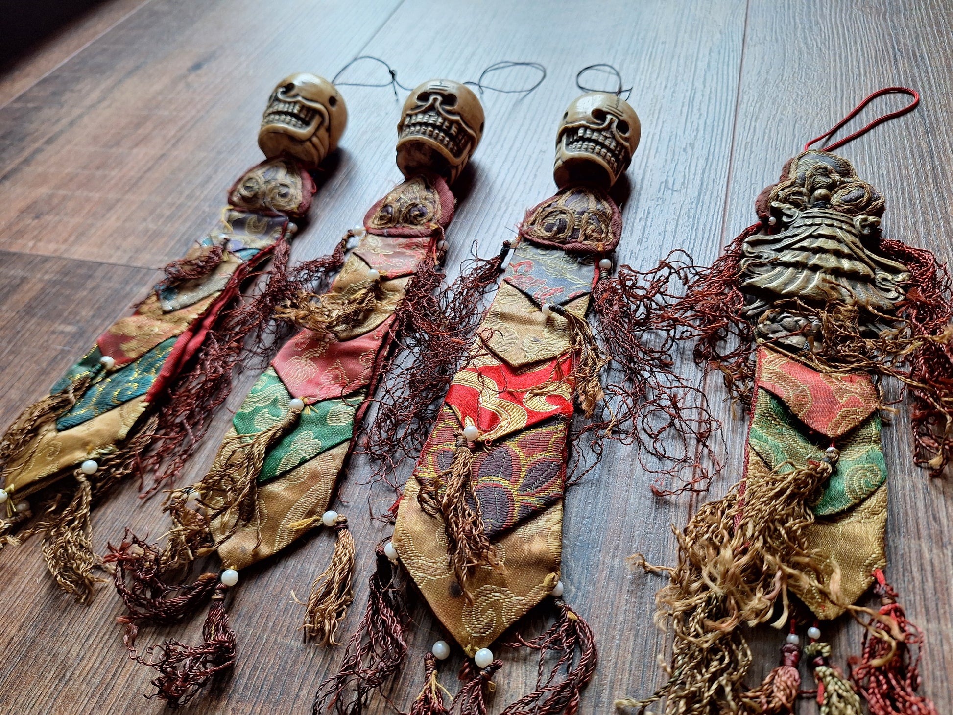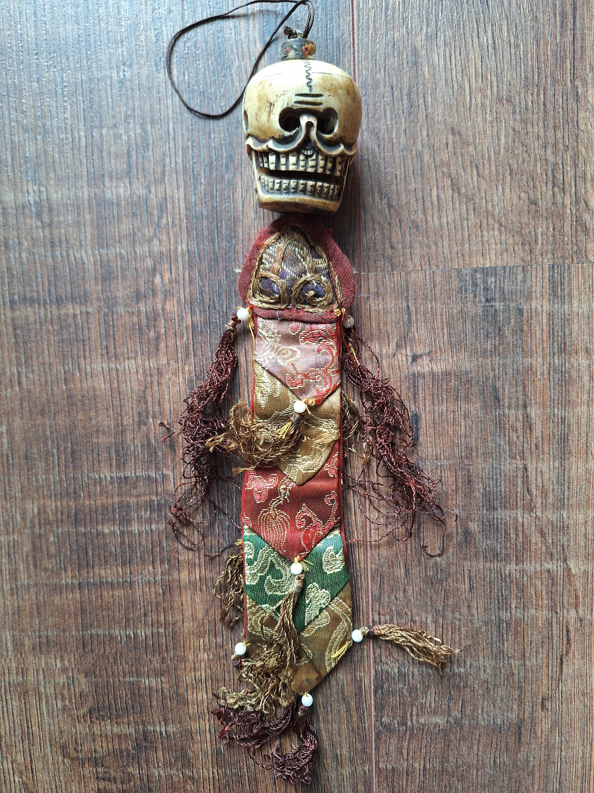 * Three with a large skull bead handcarved from yak bone. These are approximately 31 centimeters long in total (including the fringes), from which the skull is between 4-5 centimeters high.