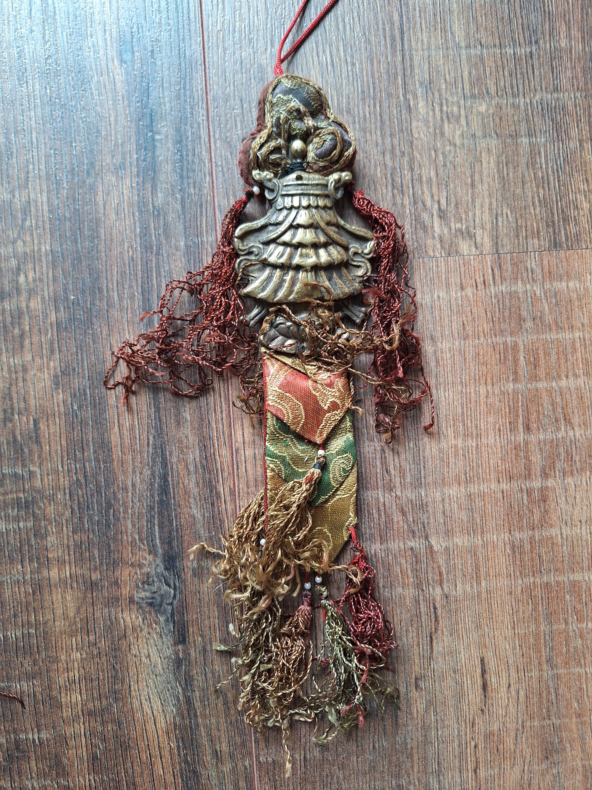 * And one with a bronze depiction of the Victory Banner, one of the Tibetan Buddhist Eight Auspicious Symbols. This one has a total lenght (including the fringes) of approximately 29 centimeters. The Victory Banner symbolizes the victory of the Buddha over obstacles on the road to enlightenment such as the fear of death, negative emotions, pride, and the attachment to desires.