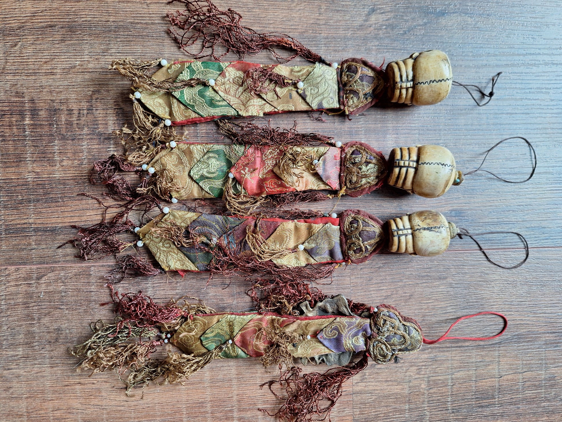 Vintage wall hanging amulets made in the traditional Tibetan Buddhist style in which a symbol or figurine is combined with a banner of multi-layered silk brocade with tassels.