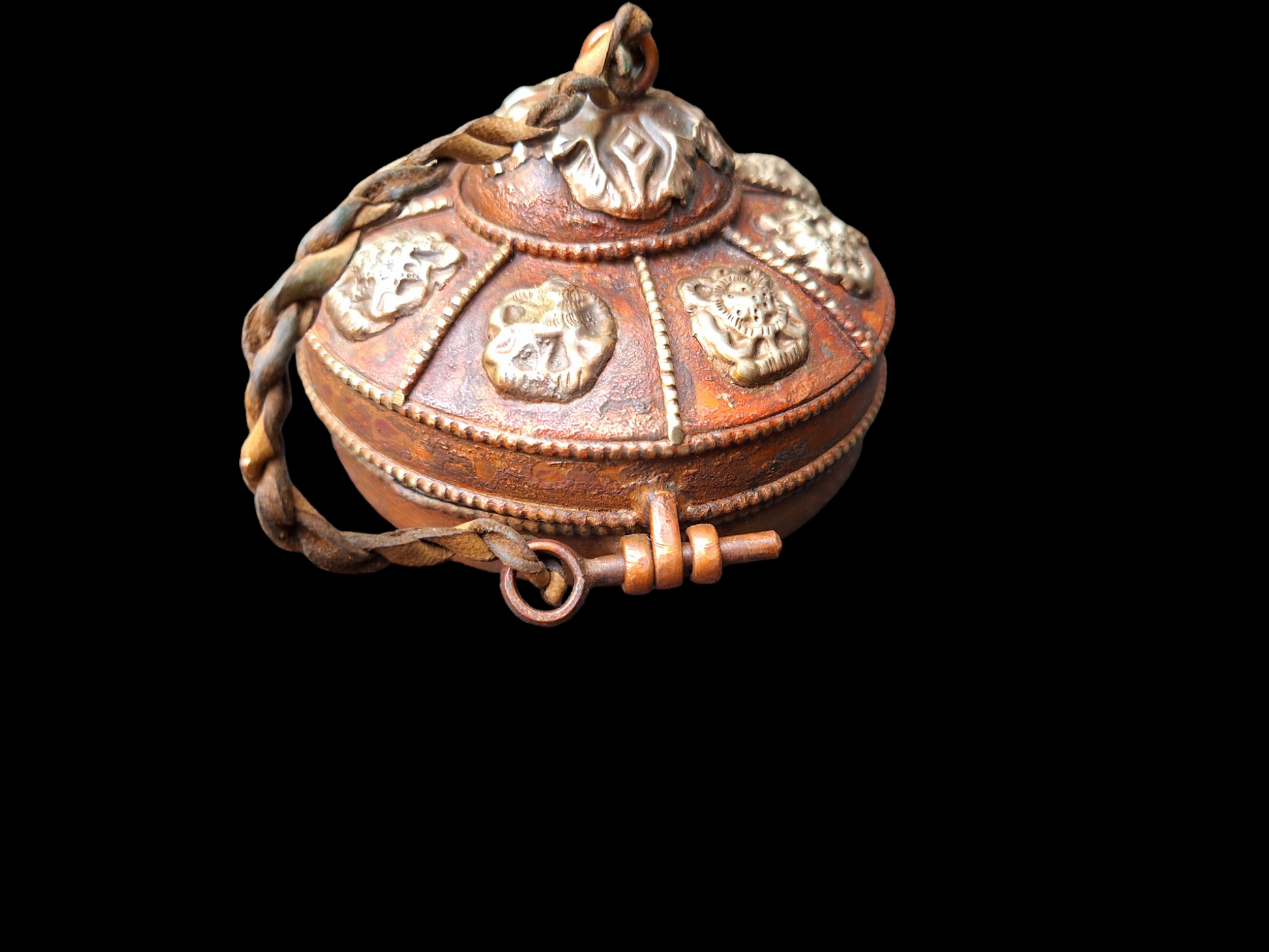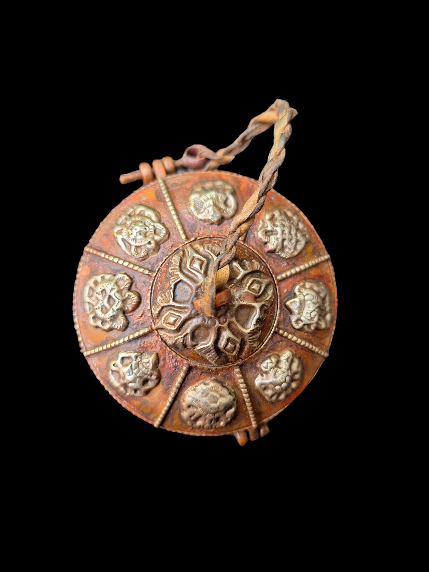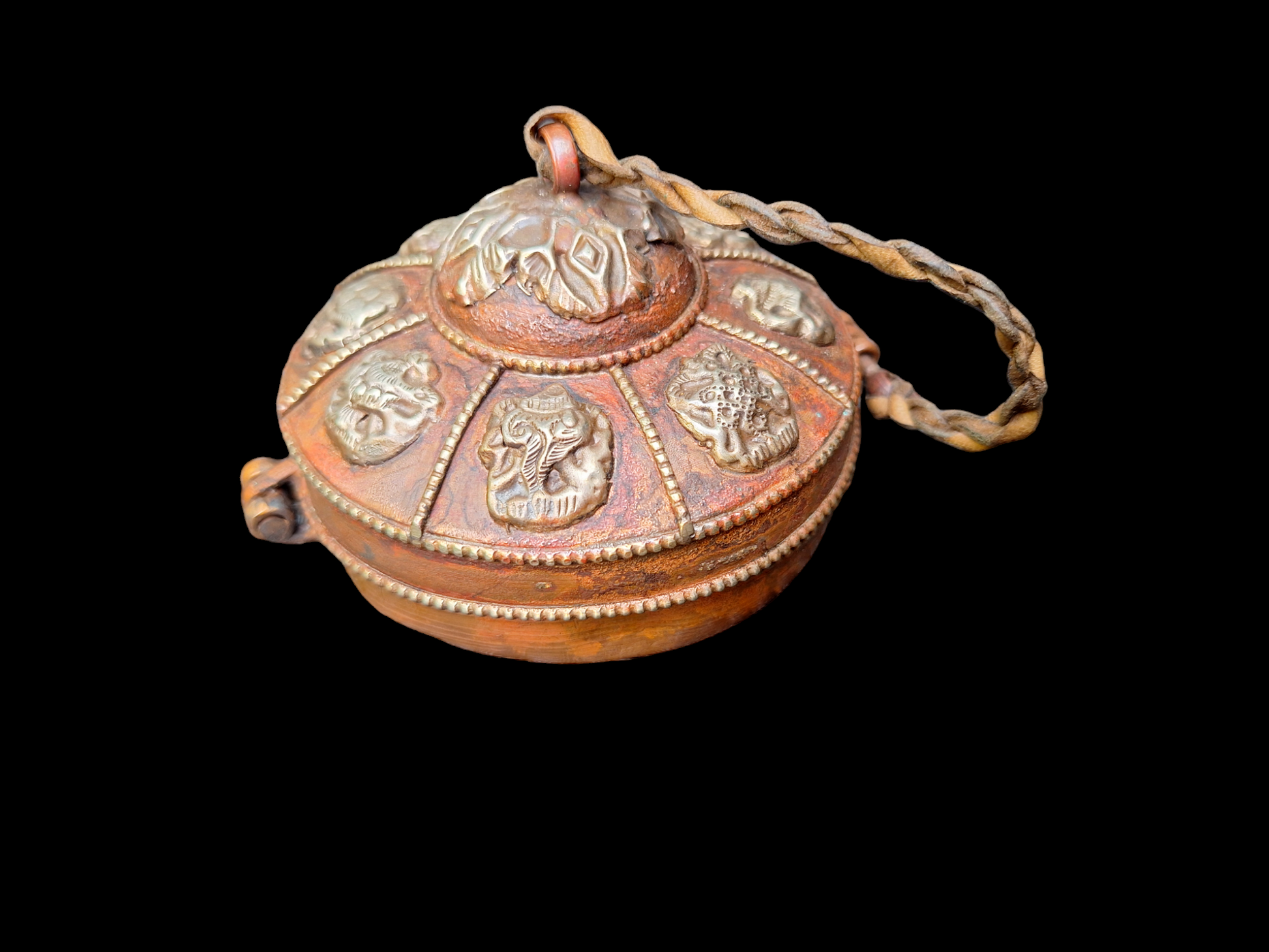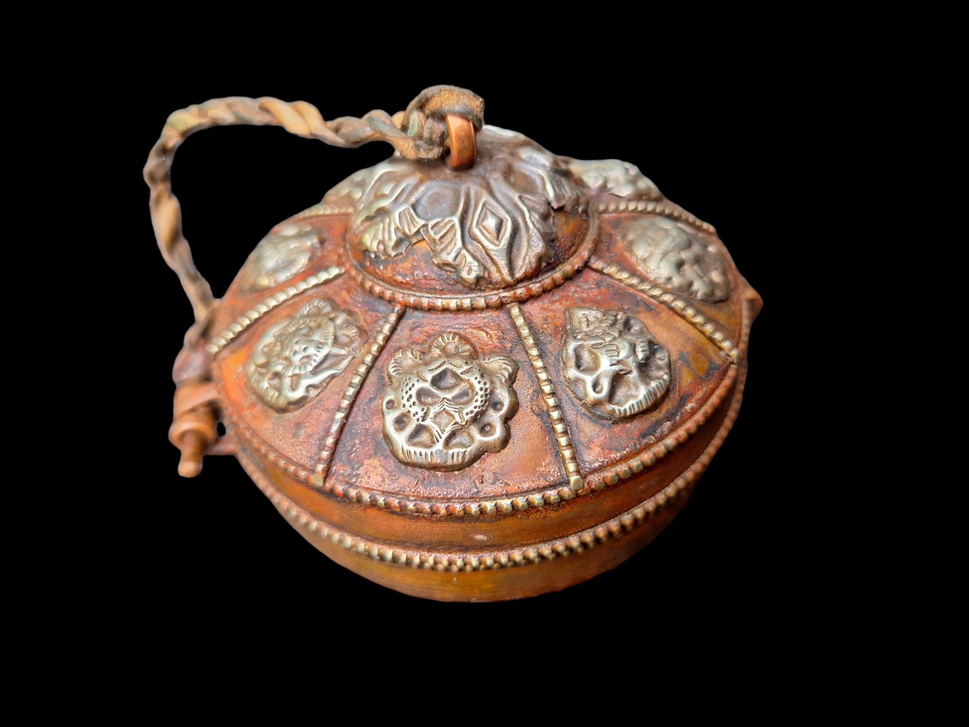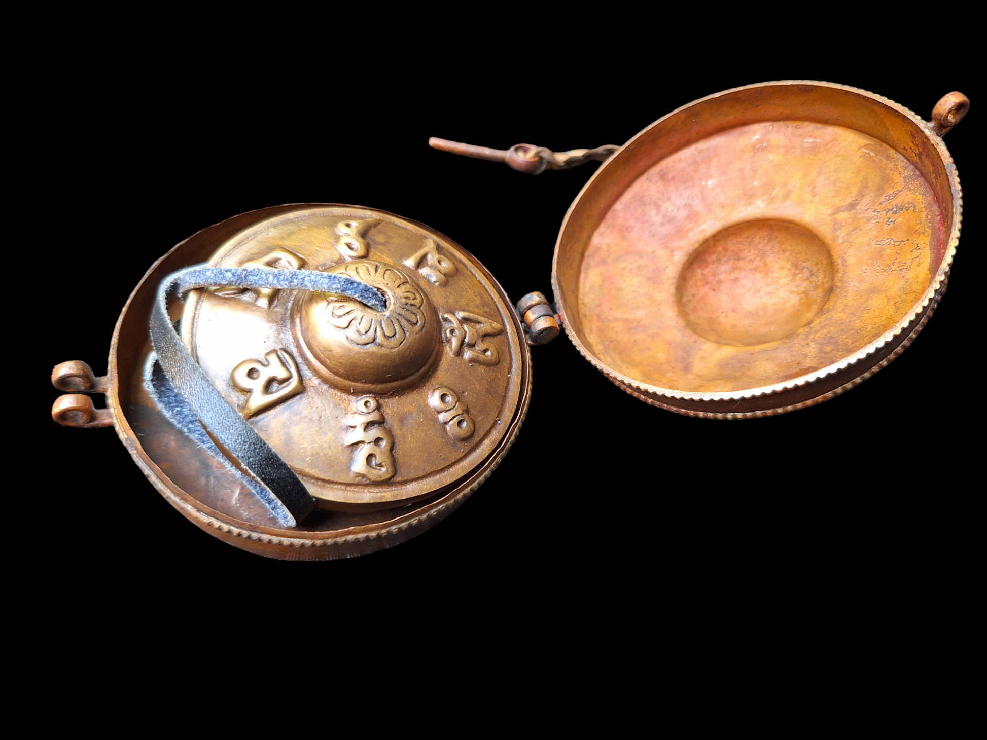 This tingsha set comes with its own storage case. This case is made from red copper and adorned with brass decorations of the Tibetan Buddhist Eight Auspicious Symbols. The storage case has an outside diameter of 85 millimeters.