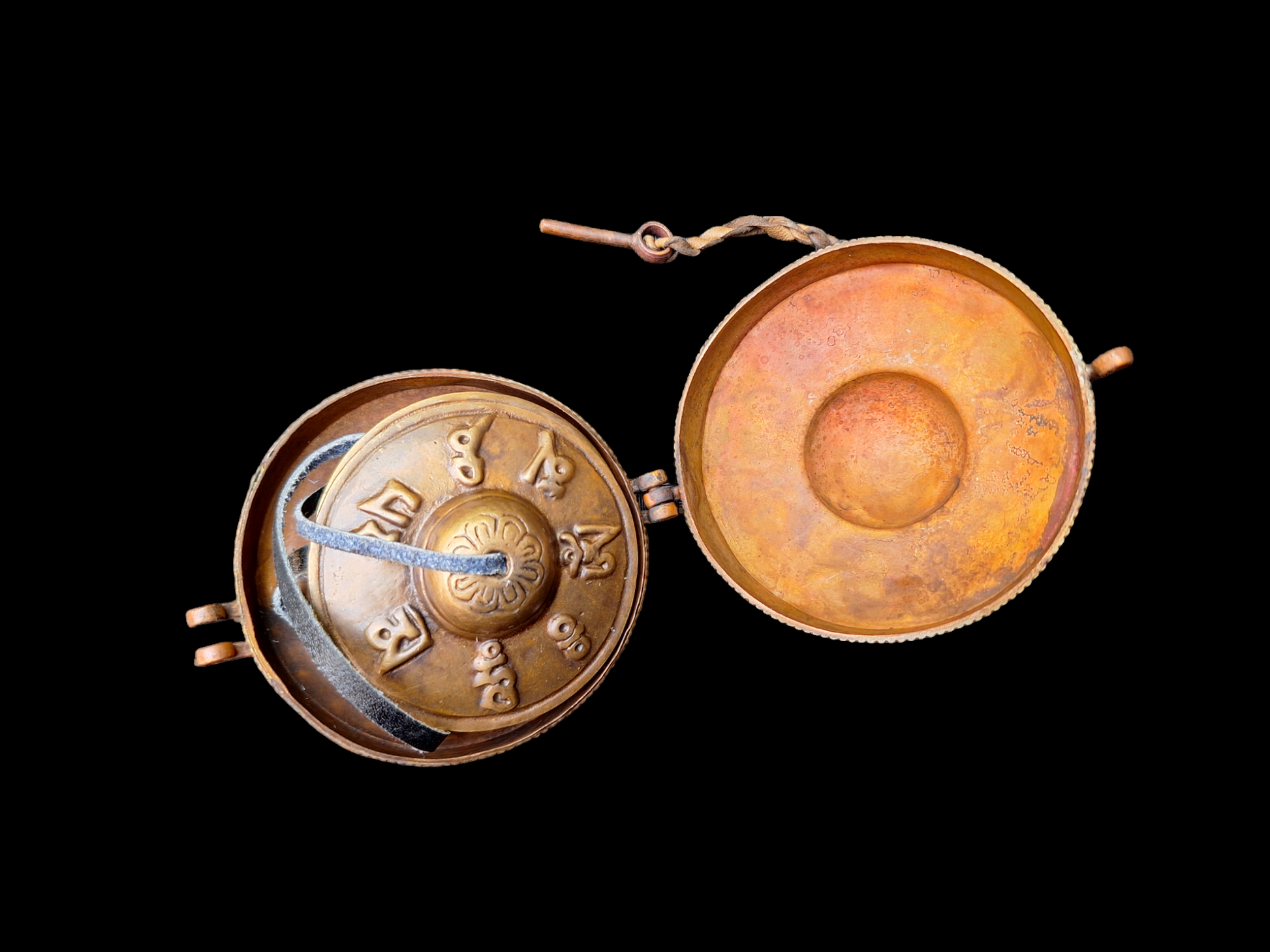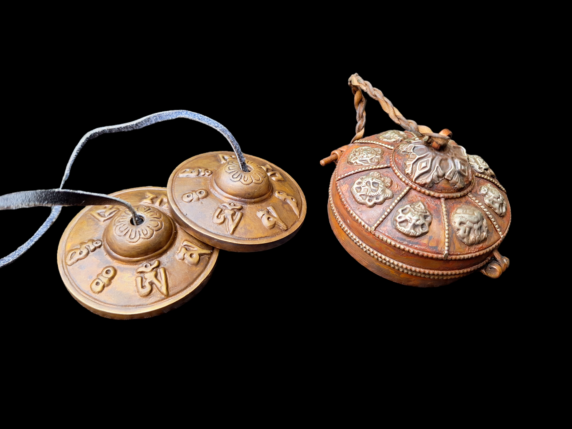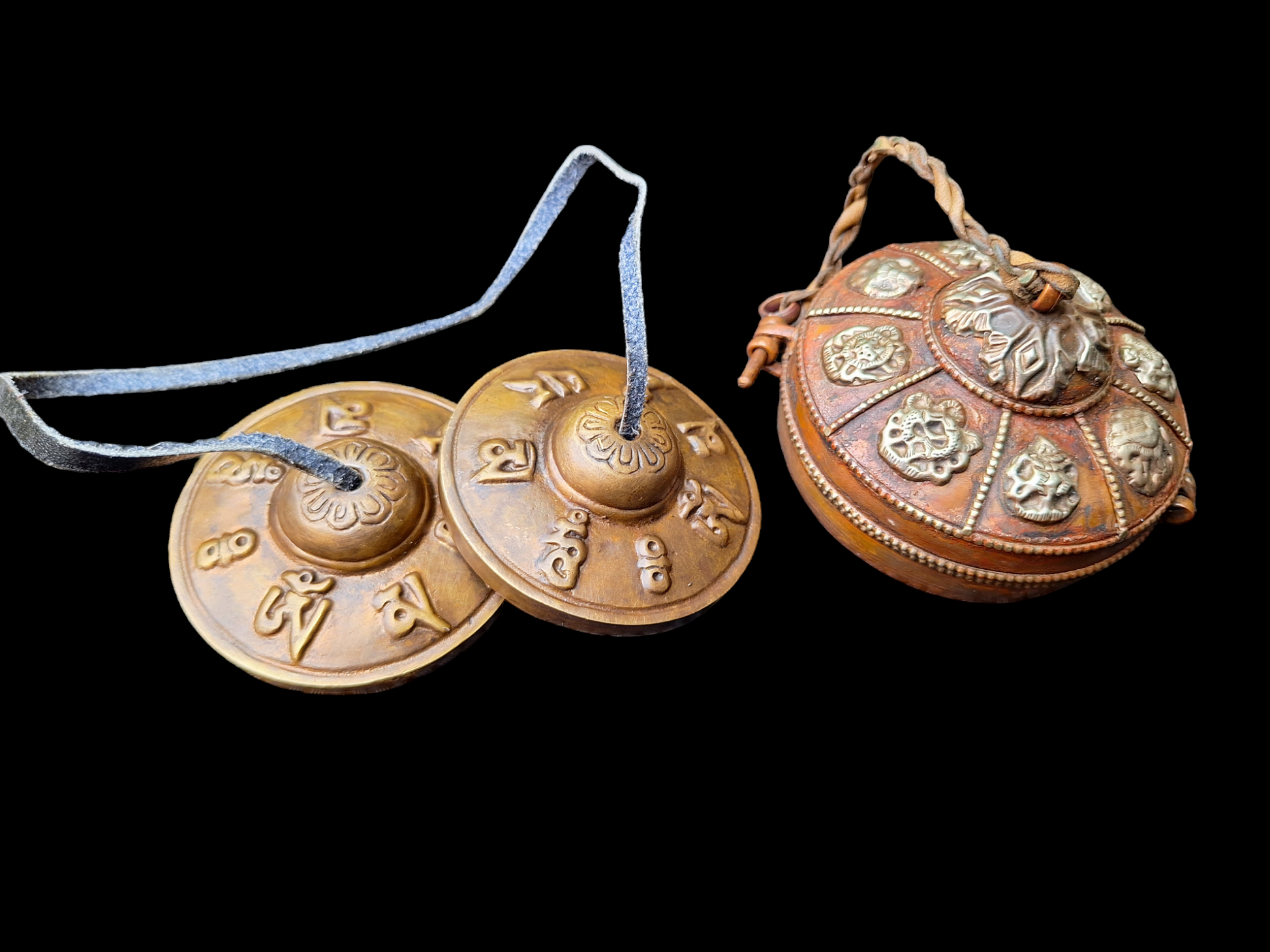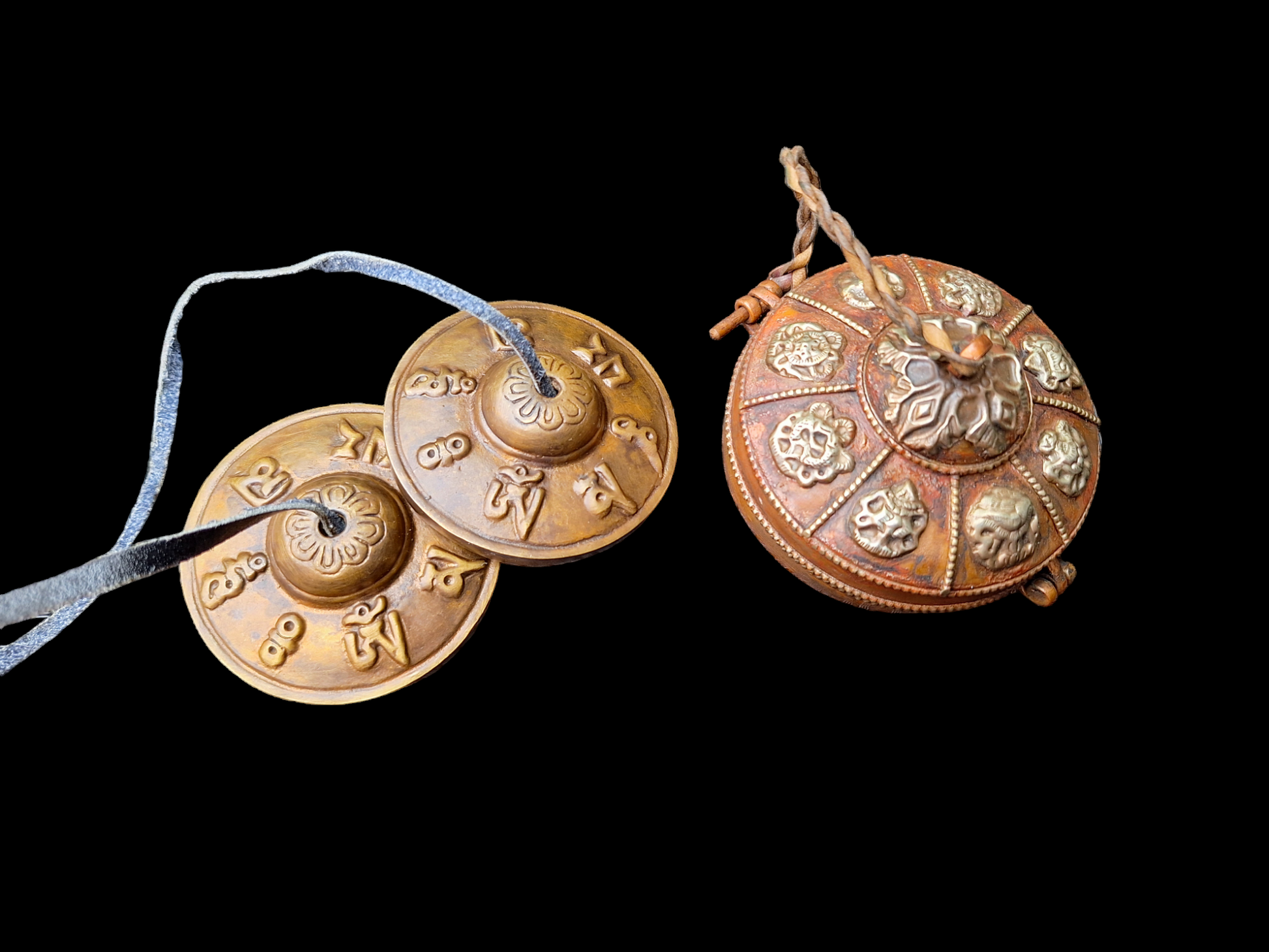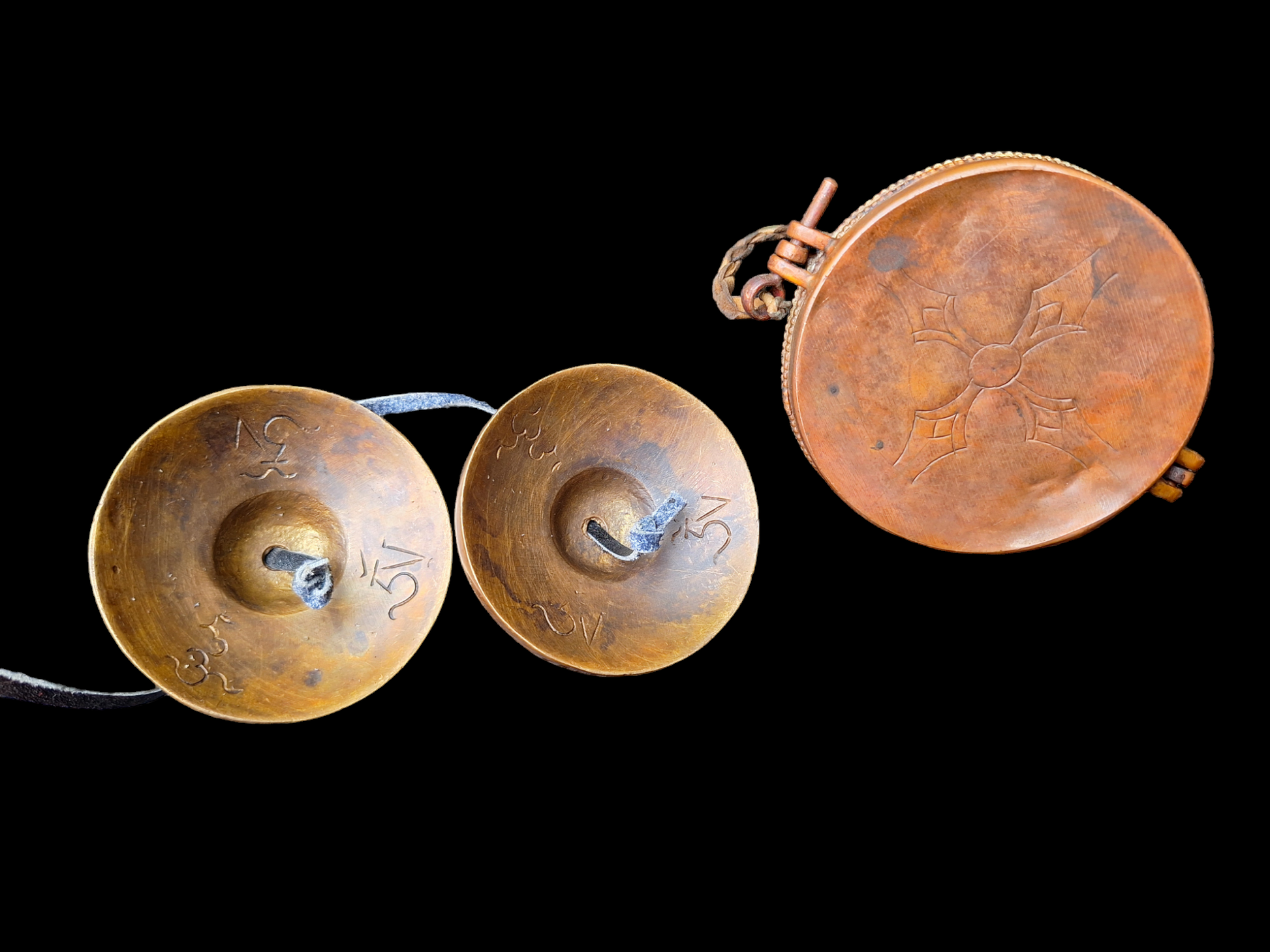 Each cymbal has a diameter of 68 millimeters. Together they weigh 233 grams. The cymbals are tied together with a yak leather cord.