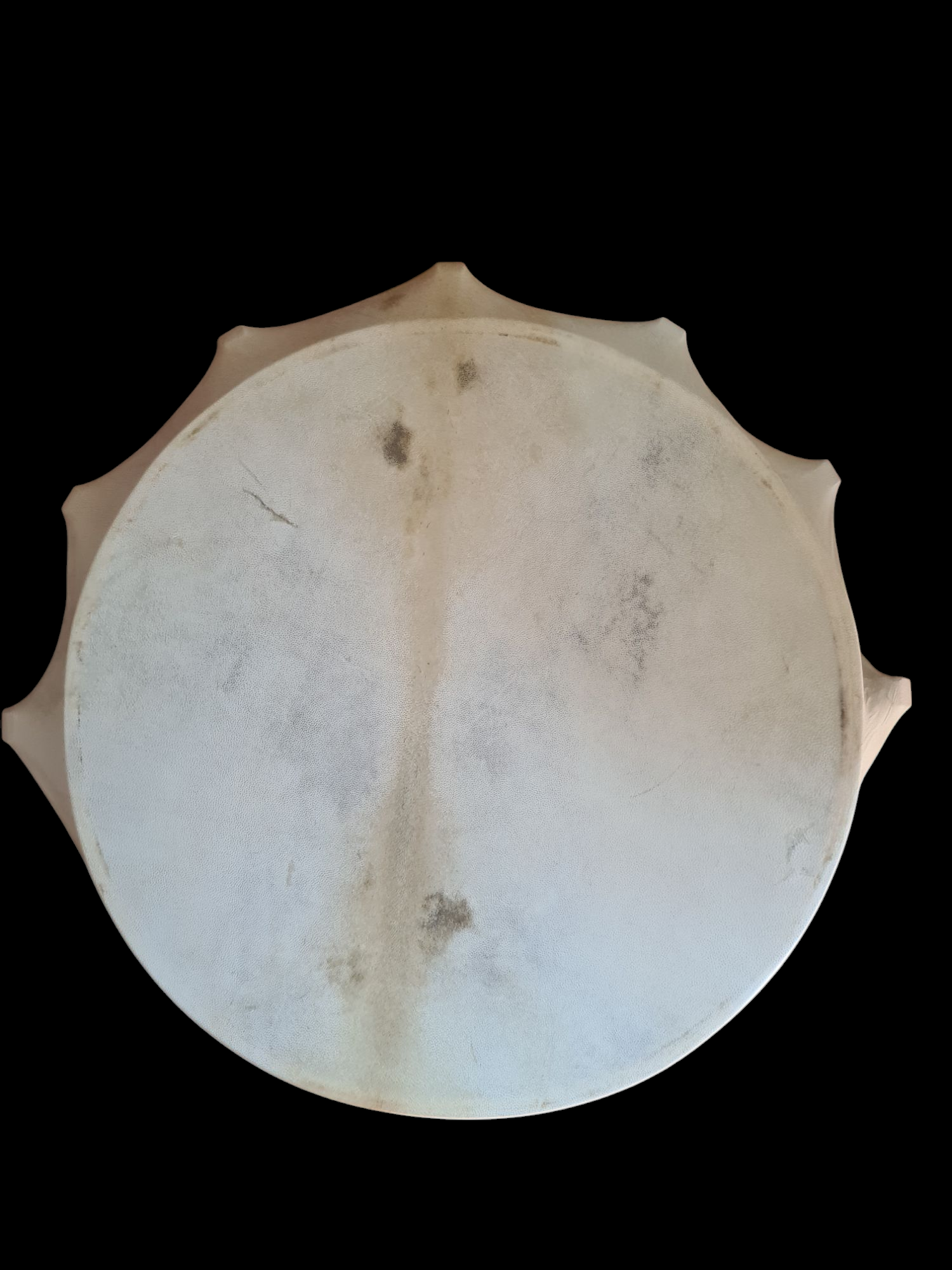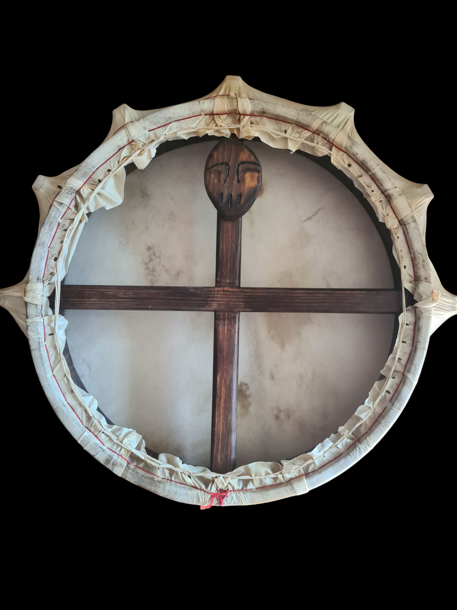 Beautiful traditional Spirit of Wolf style drum with 7 horns on top, referring to the heavenly realms. Handstitched to the frame. White goat skin, 45 cm diameter with 7 horns. A big enough drum for the bigger rituals, blessing or healing rituals with a low and deep voice. It comes together with a Khakassian style drumbeater called "orba" which represents a leaf of the World Tree.