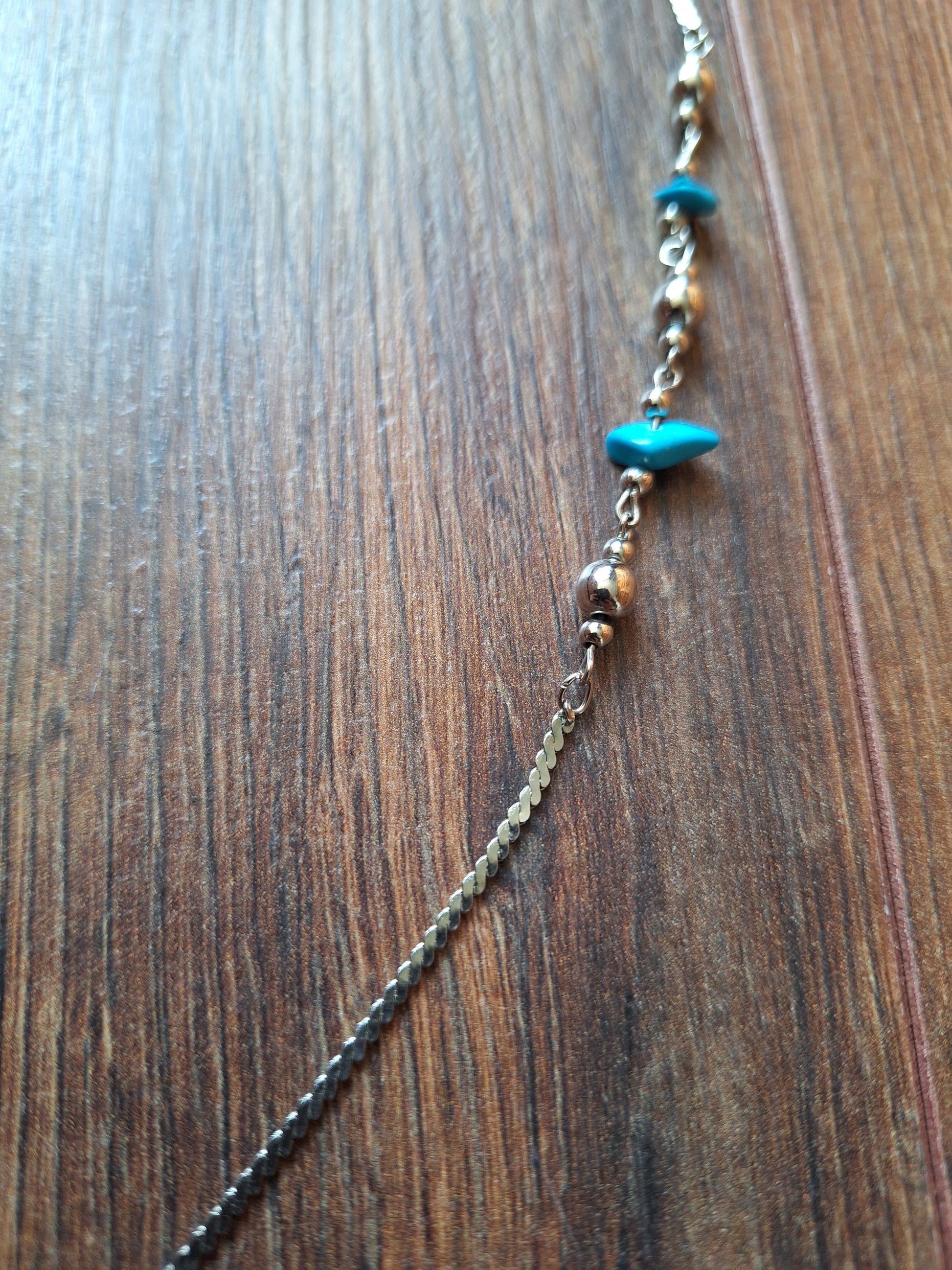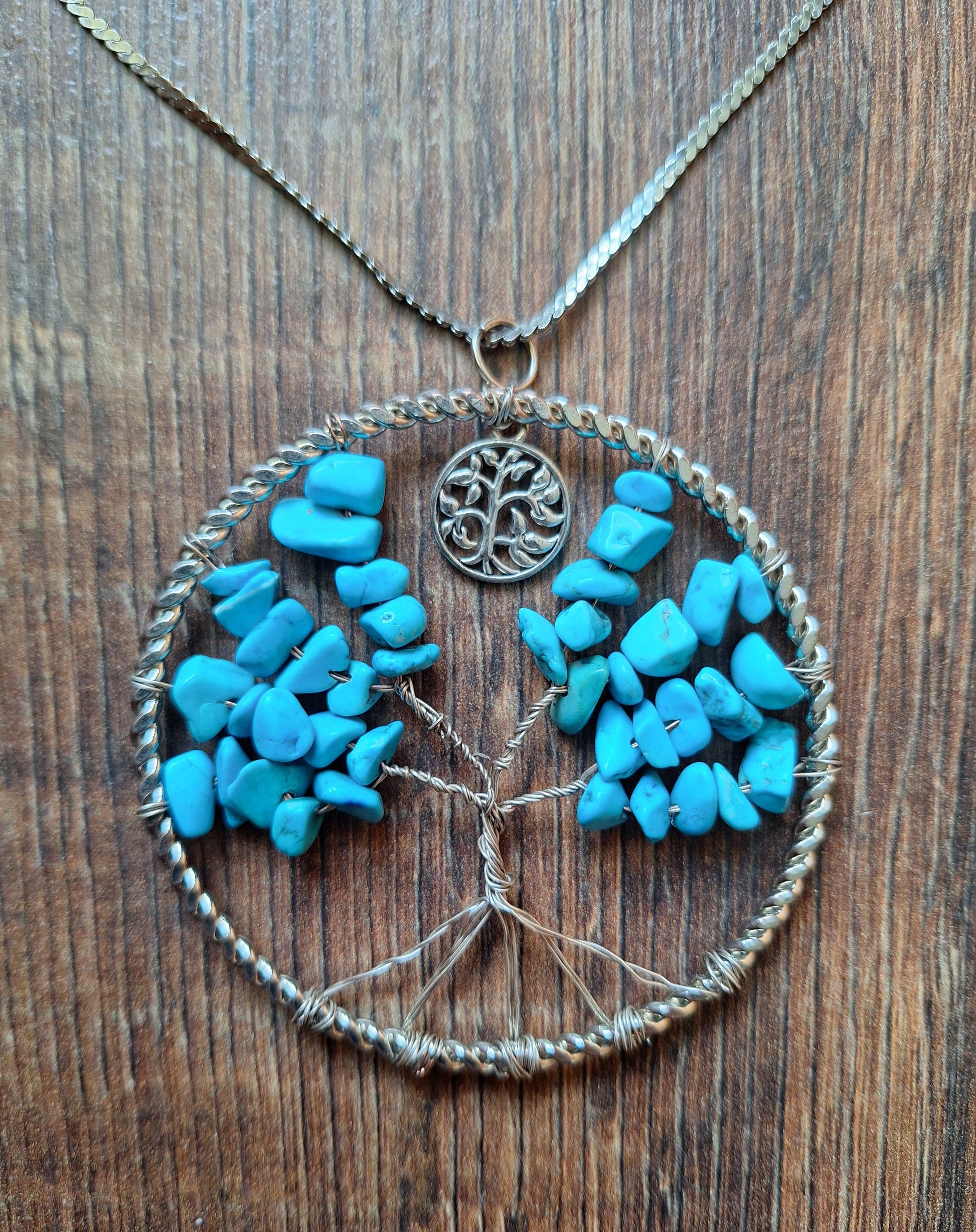 Very nicely made necklace, featuring a handmade Tree of Life pendant made with silver colored metal wire and turquoise colored howlite beads on an alpaca metal hoop.