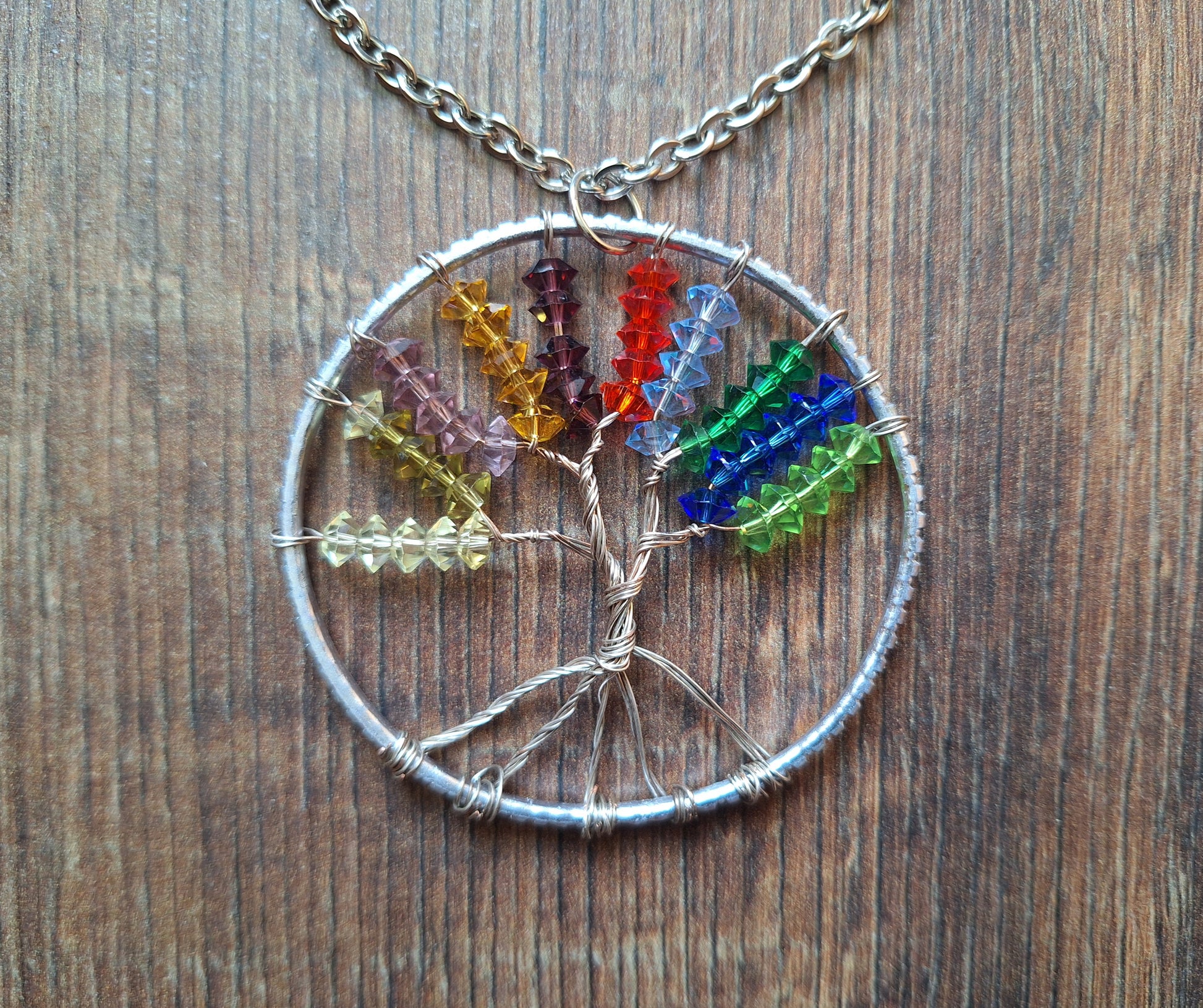 Handmade Tree of Life pendant, made with silver colored metal wire and colorful synthetic beads on an alpaca metal hoop.