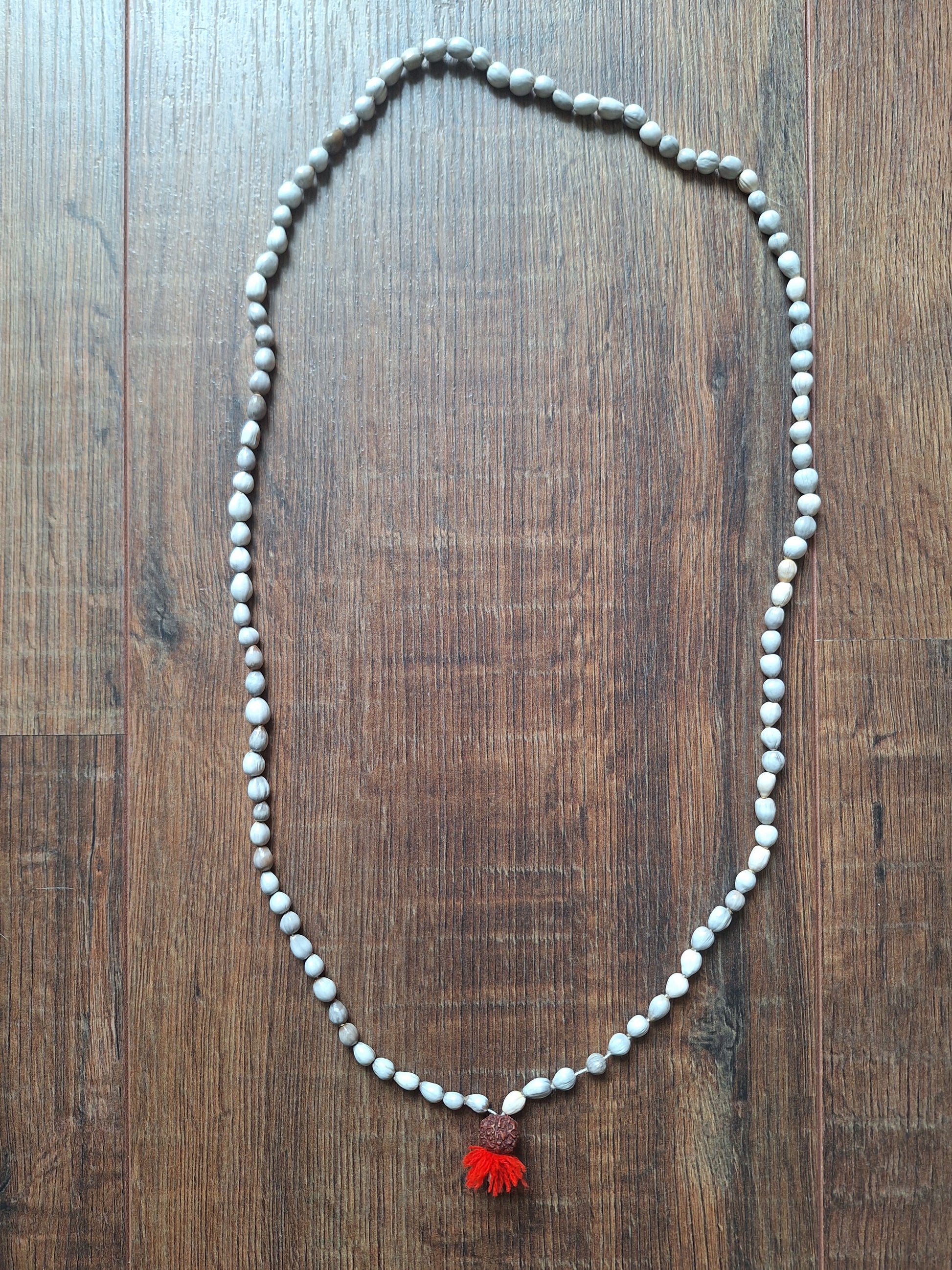 This mala is made with 108 beads from vaijanti seeds. These seeds come from the vaijanti flower a.k.a. 'coral bead plant' and have (when dried) a natural silvery grey-white color. The seeds are considered sacred especially in Hindu tradition, where they are associated with Lord Vishnu and Lord Krishna. They represent Lord Krishna's omnipotence and triumph over evil forces; 'vaijanti' can roughly be translated as 'triumphant victory'.
