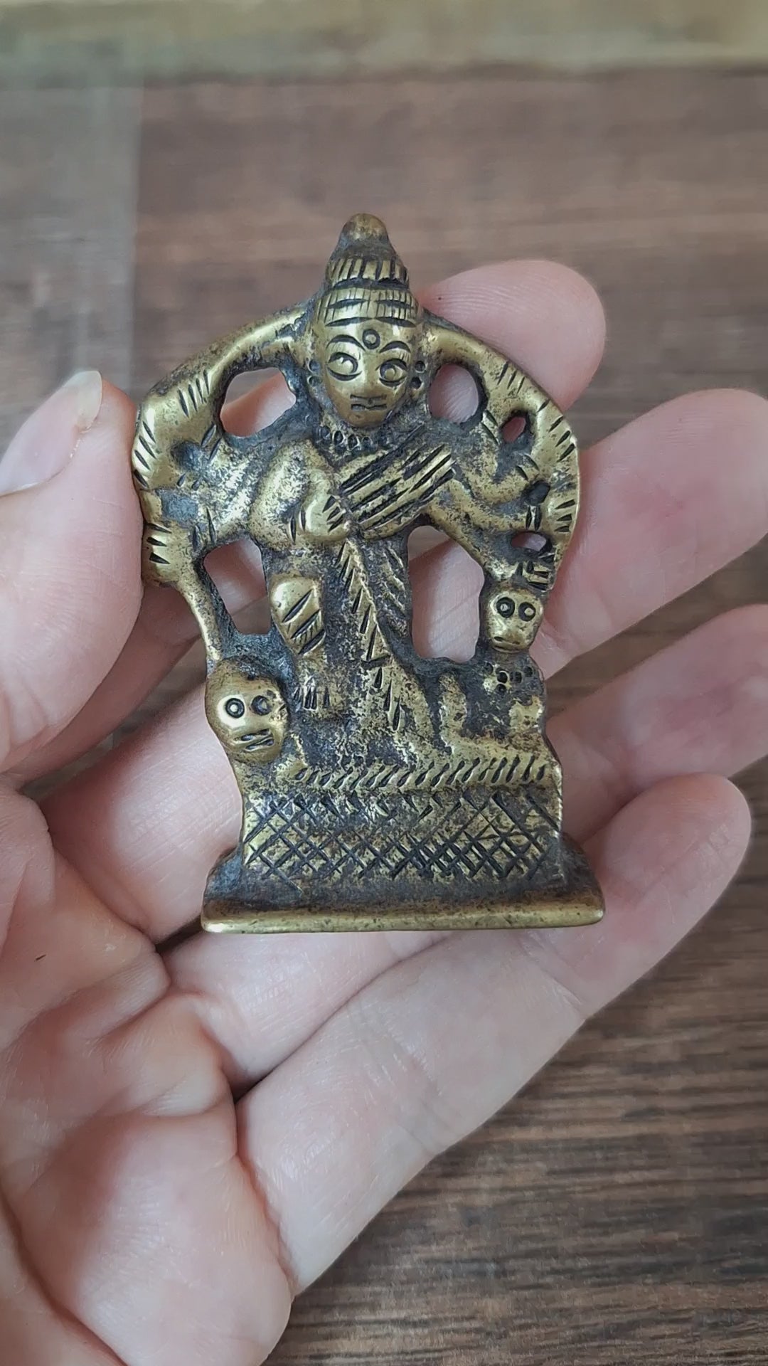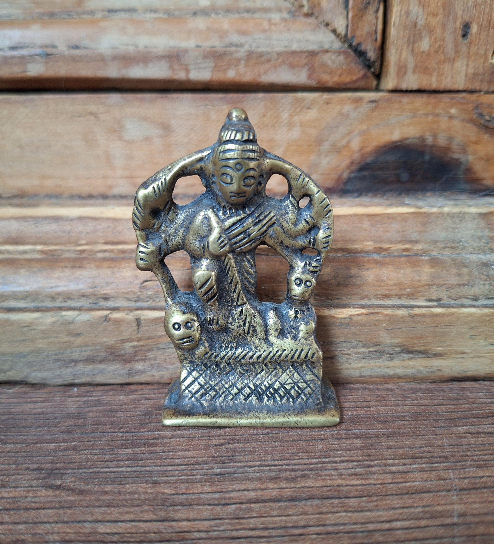 Small sized vintage brass figurine depicting the great goddess Kali, one of the major deities in the Hindu pantheon. She is worshipped all over India and Nepal in multiple schools and traditions. According to a 6th century CE Hindu mythological sacred text known as Devi Mahatmyam, Kali was born in a moment of intense crisis. The goddess Durga, in herself already a very fierce manifestation of the Great Mother Goddess Shakti/Parvati, manifested her rage in the personification of Kali to destroy the demons Madhu and Kaitabha (‘chaos’ and ‘ignorance’), who threatened the world. Without hesitating, Kali leaped into battle and easily destroyed the demons.