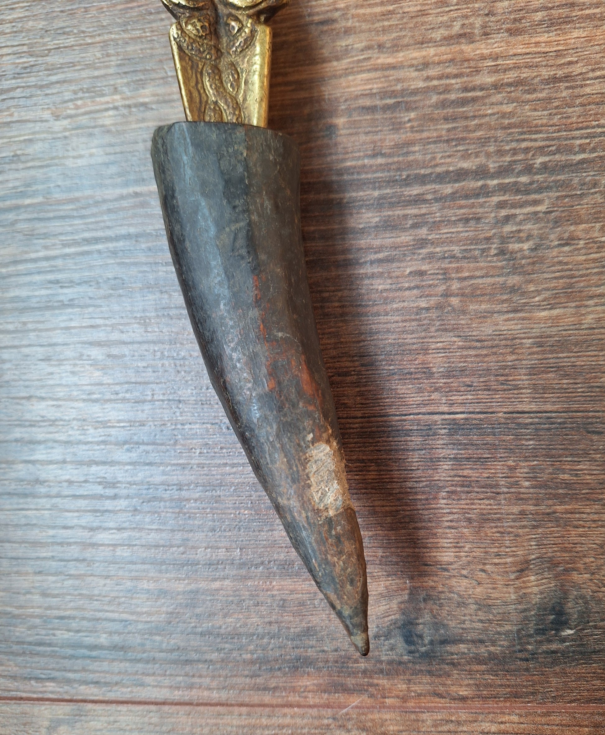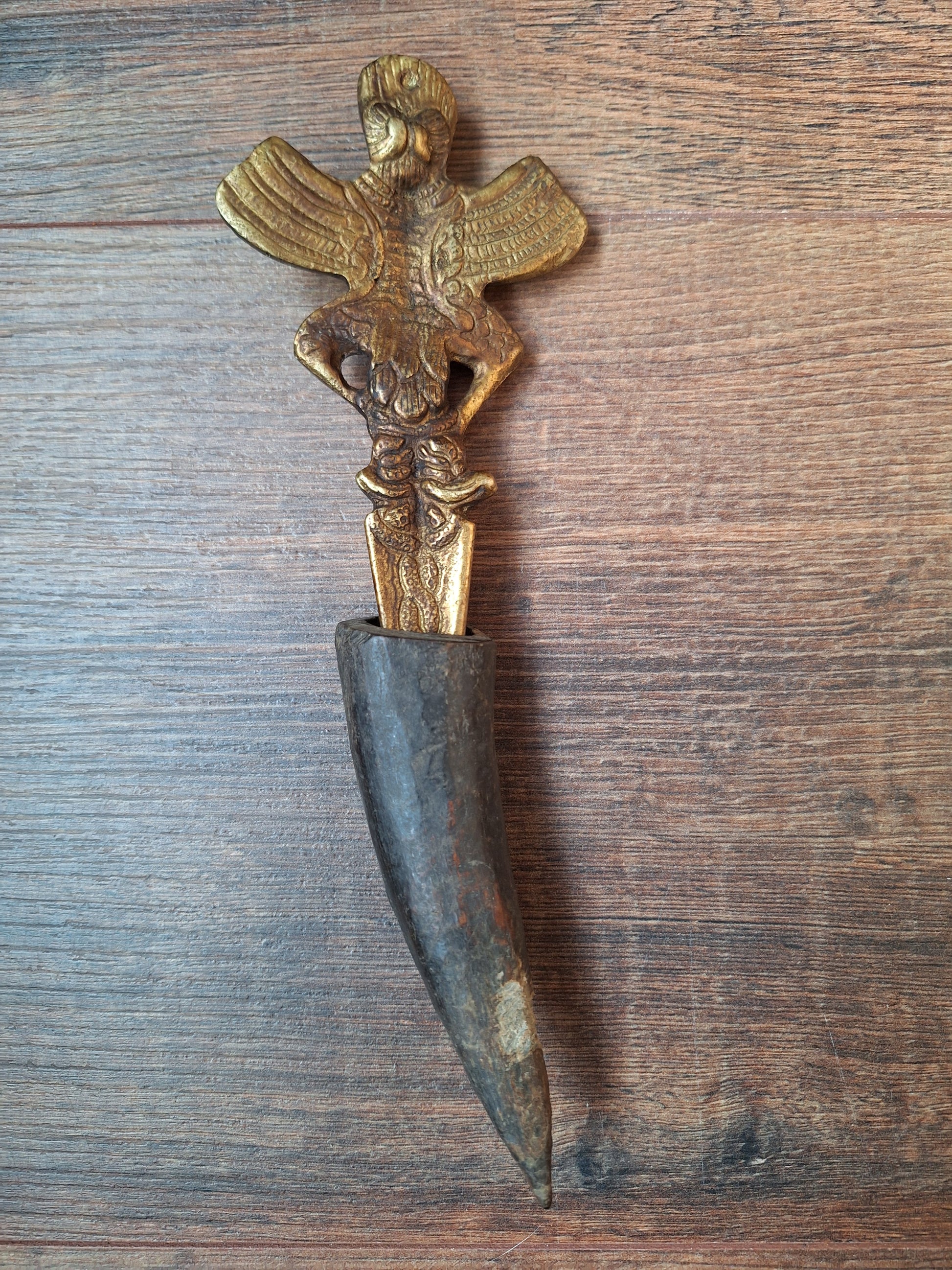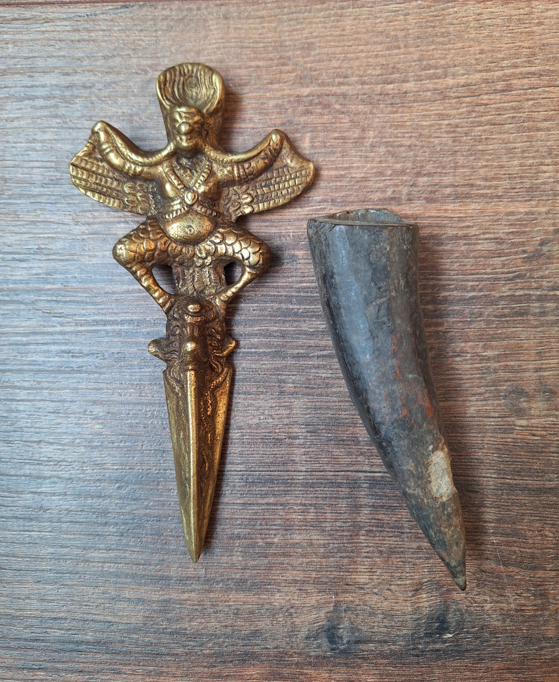 Sizes; 17 centimeters long and 8 centimeters wide (measured the wing-span). Weight; 250 grams. This phurba comes together with a simple holder/standard, that has been made for it by it previous owner; a hollowed-out piece of cattle horn.