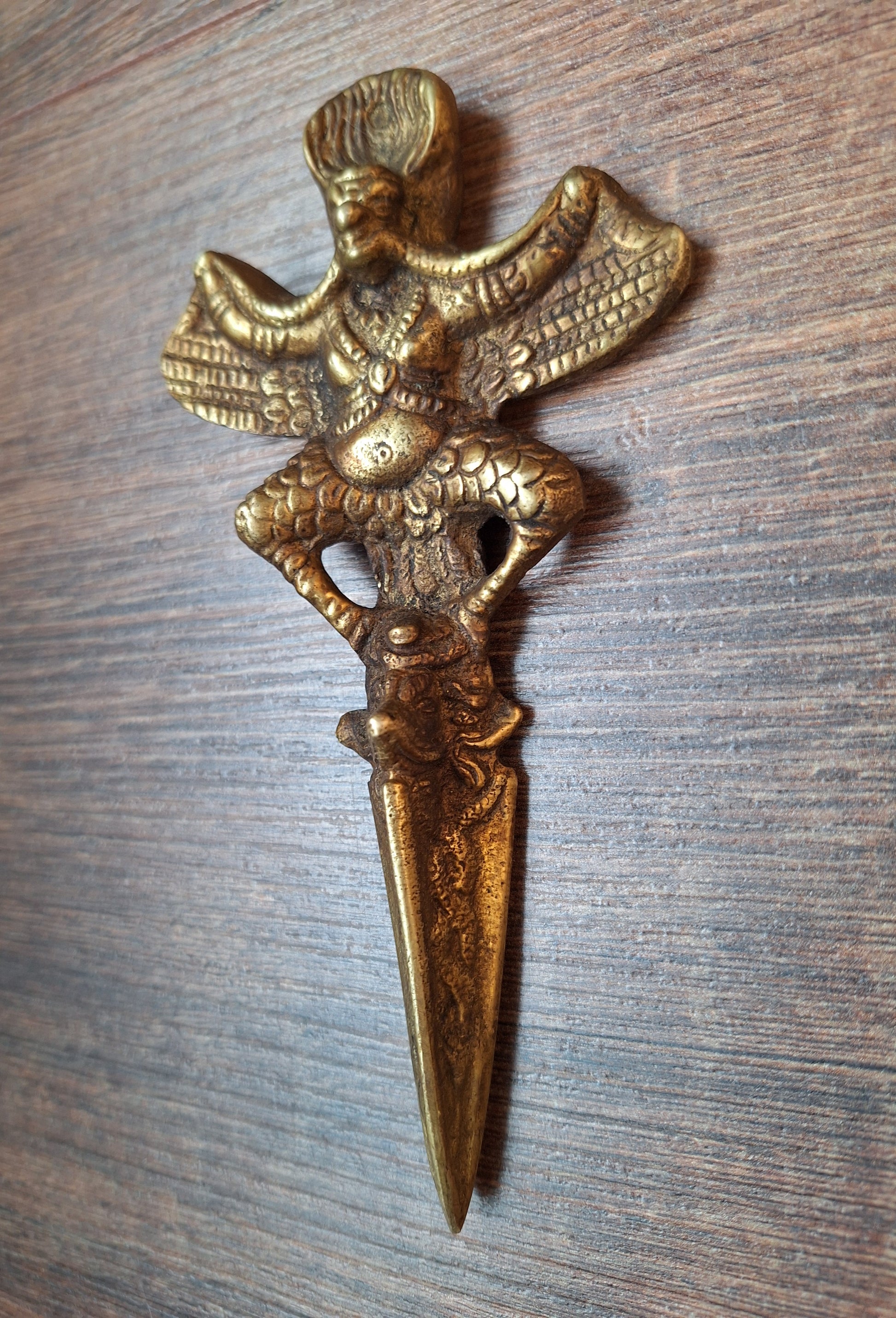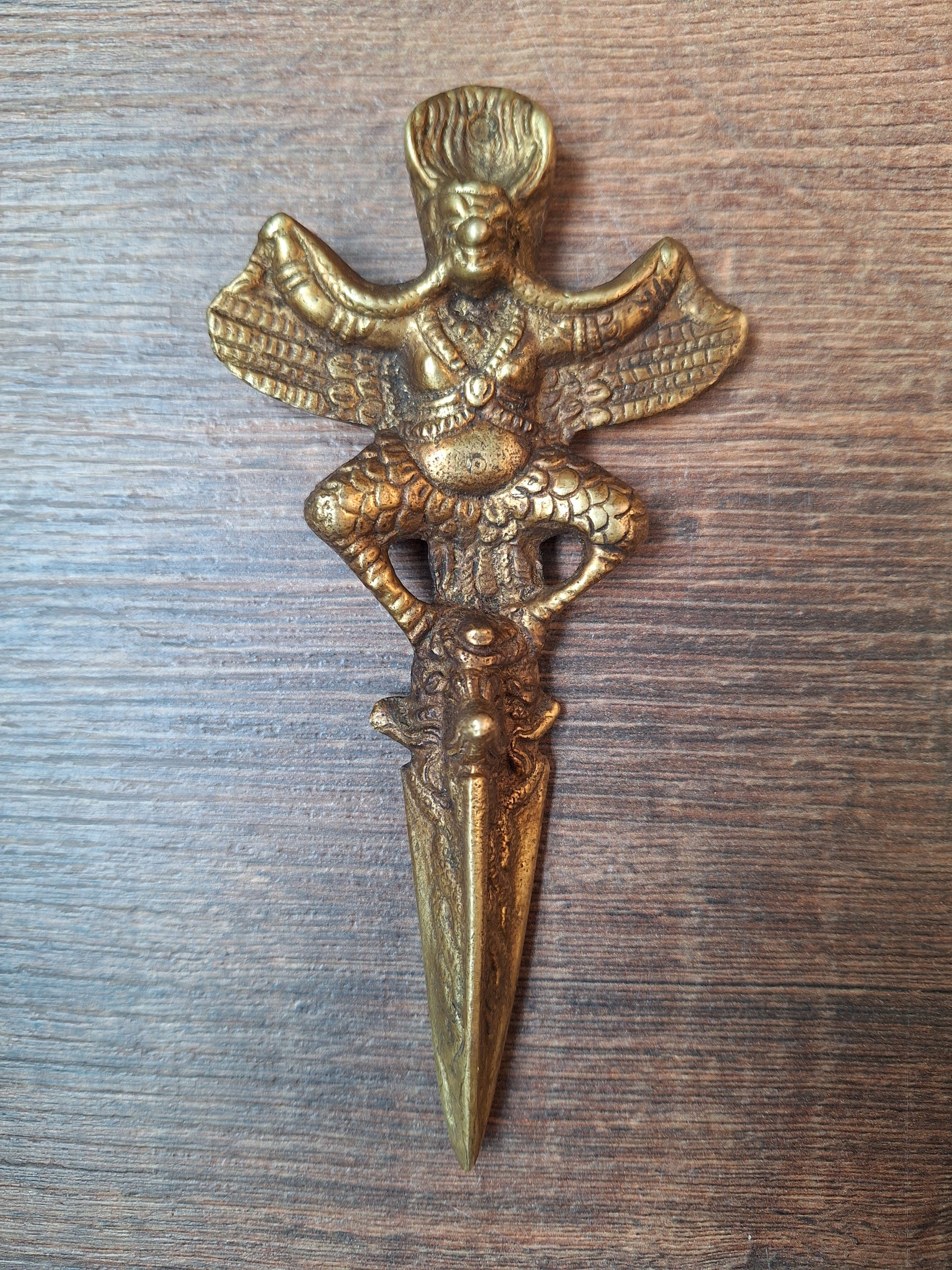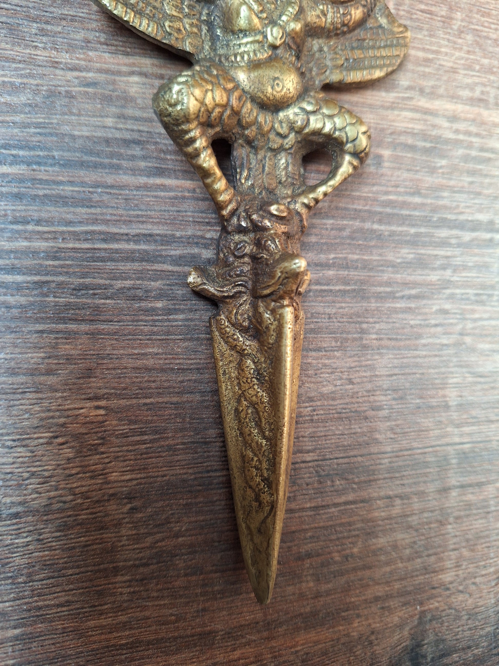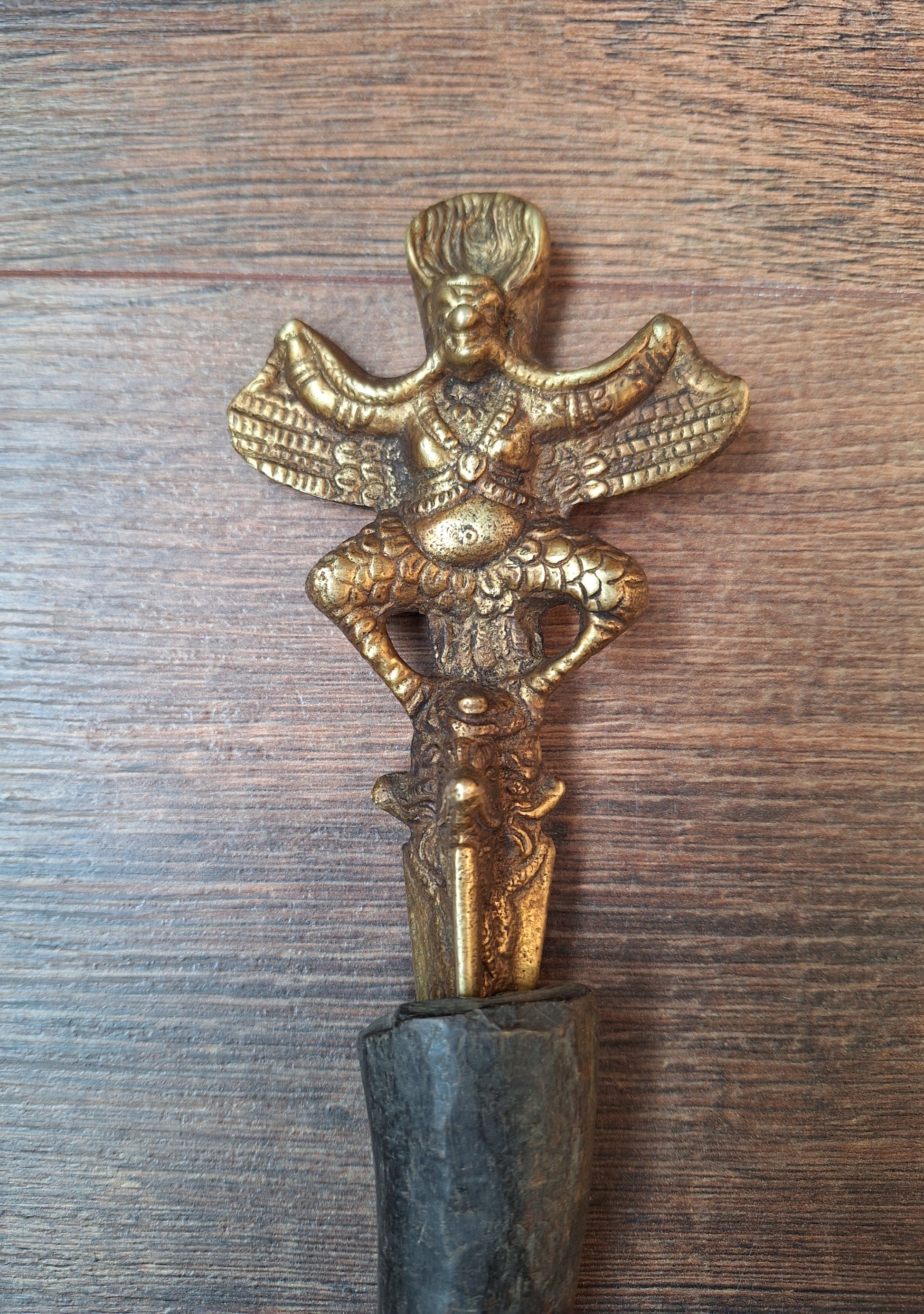 Vintage brass phurba from Tibet. The handle shows a depiction of Garuda.