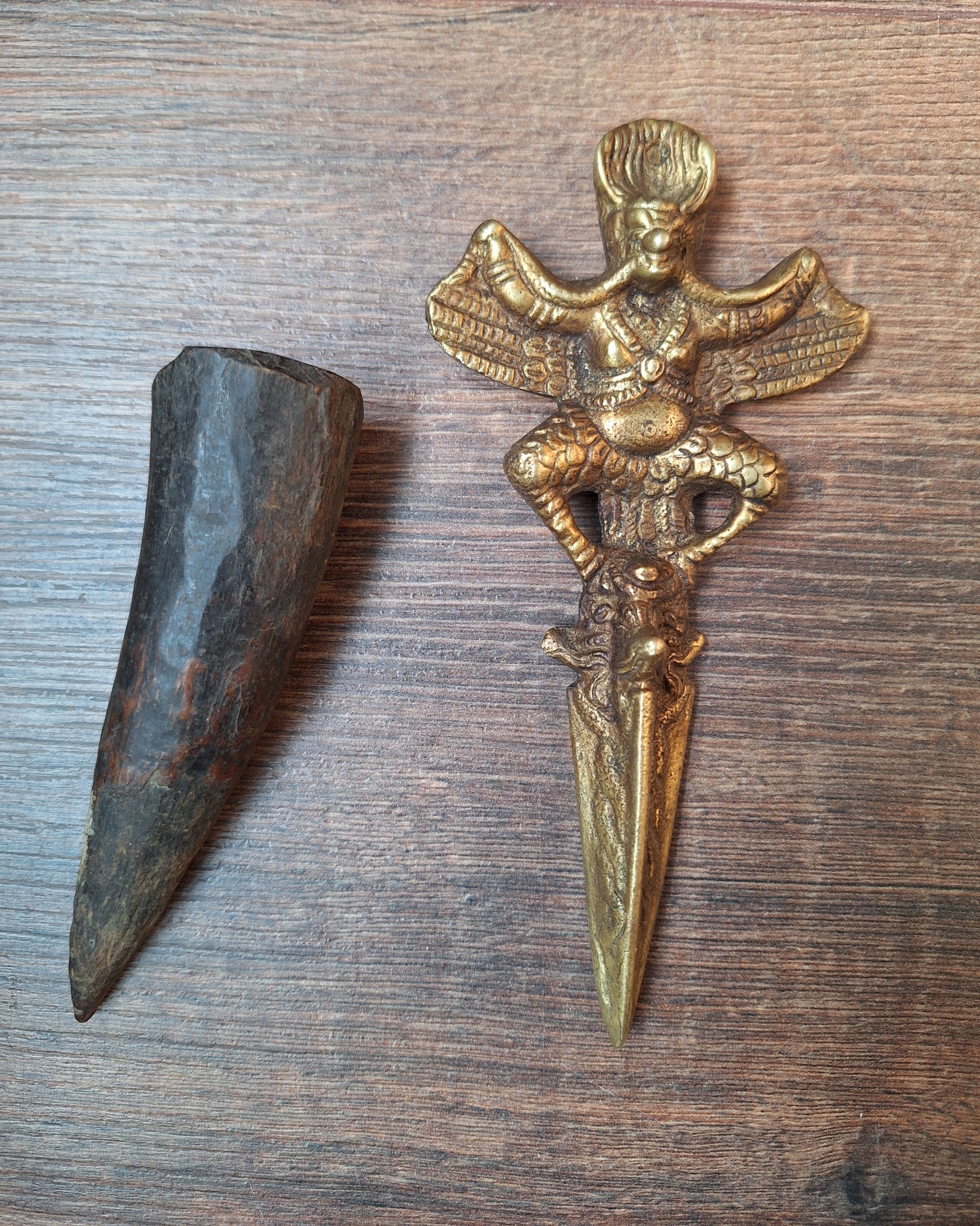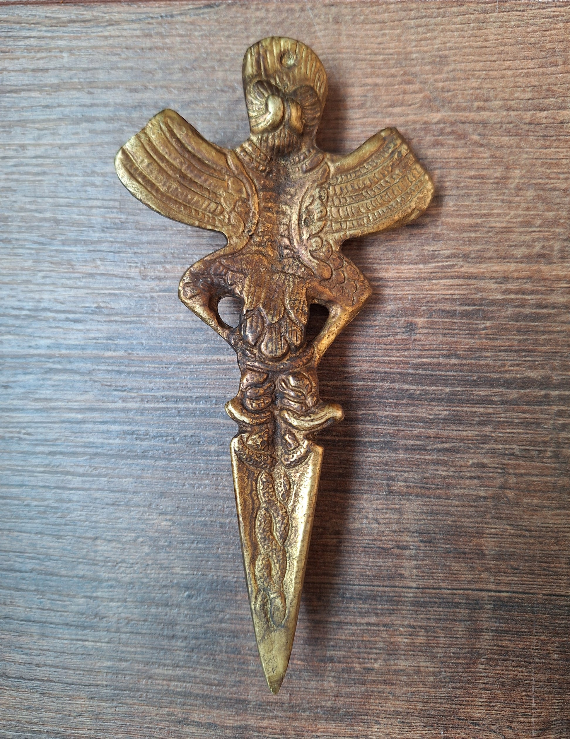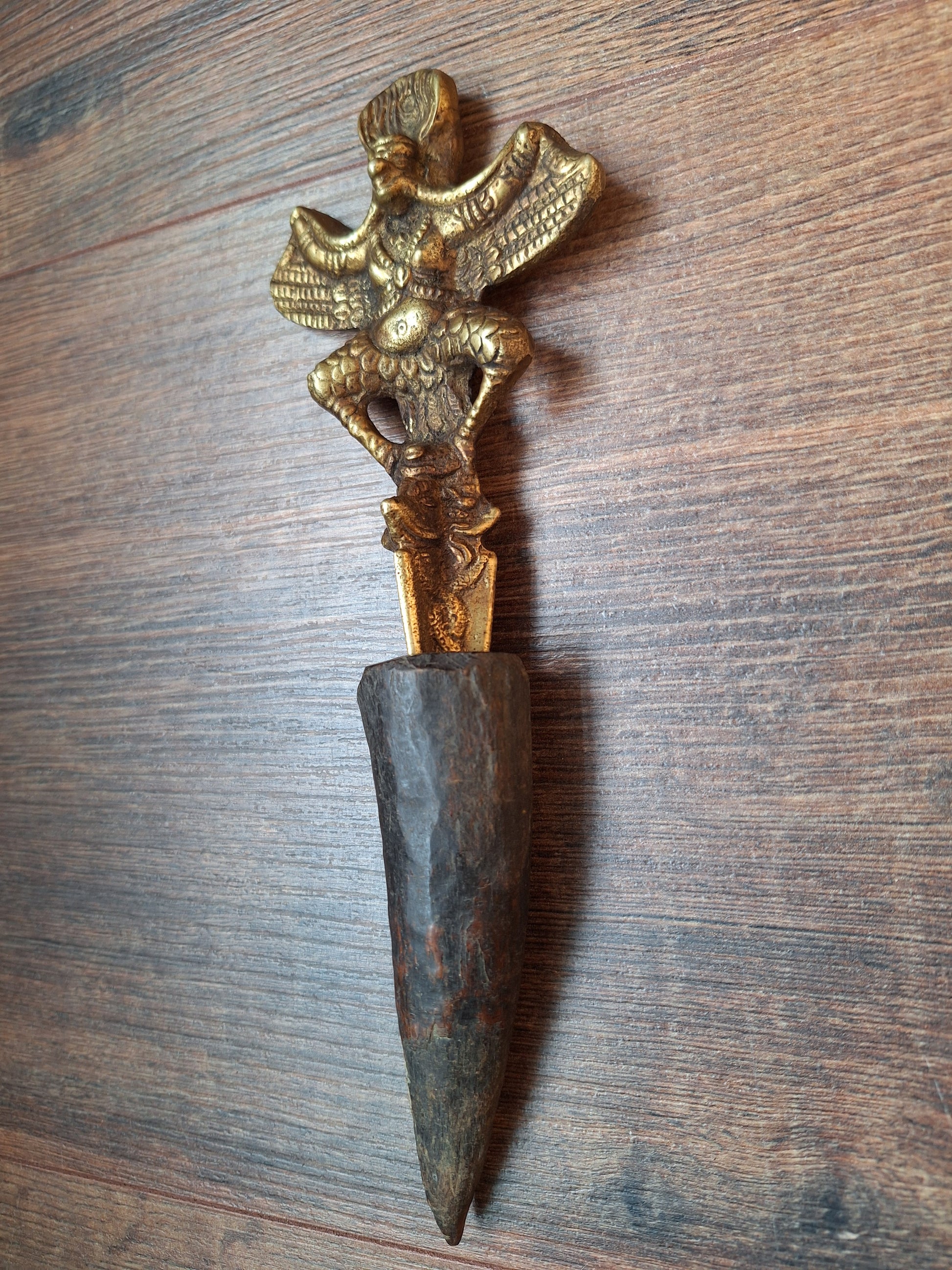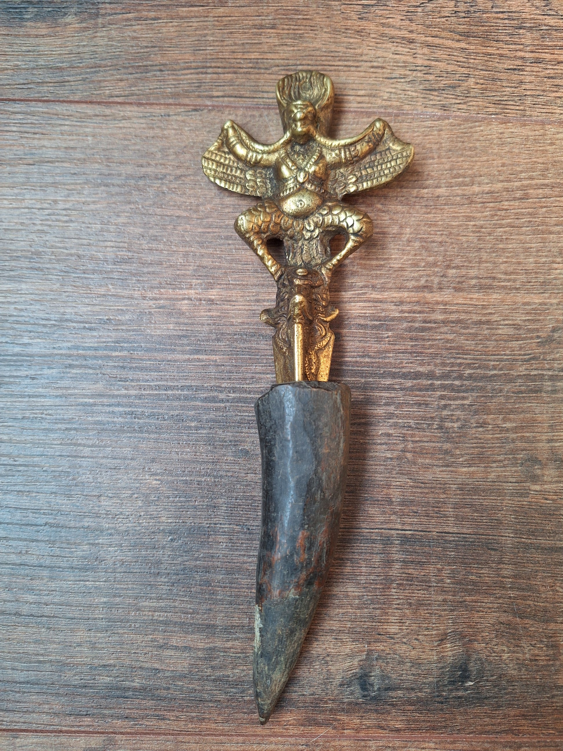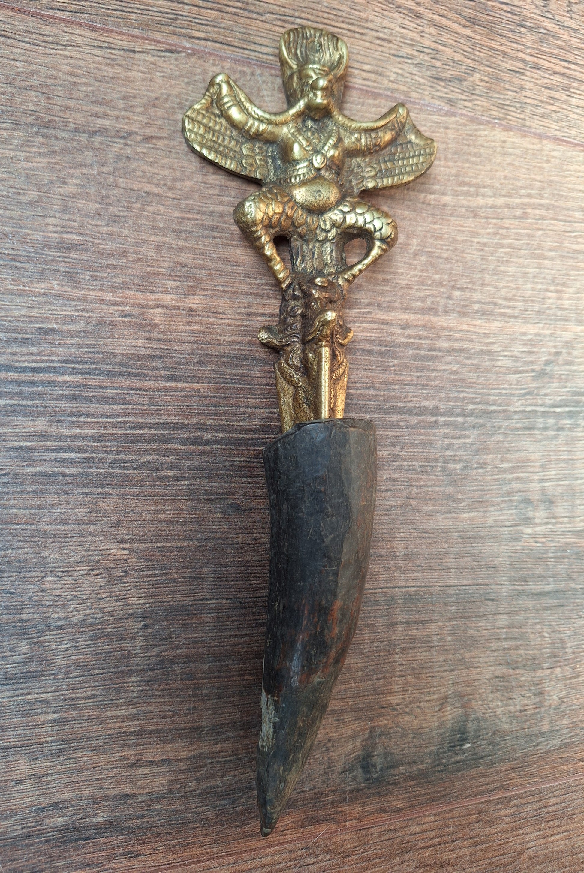 Vintage brass phurba from Tibet. The handle shows a depiction of Garuda.