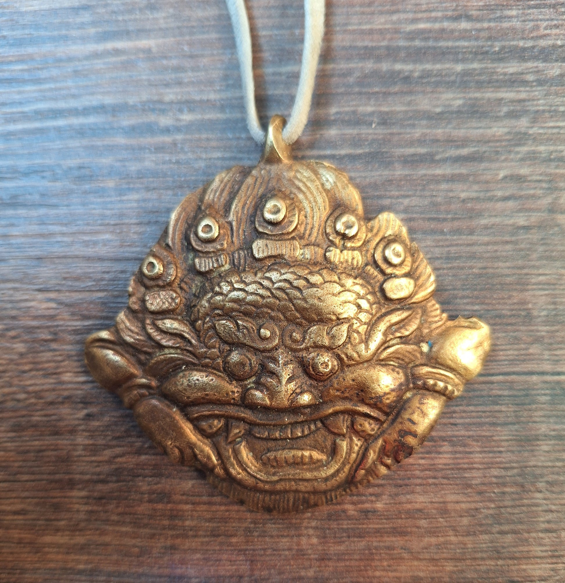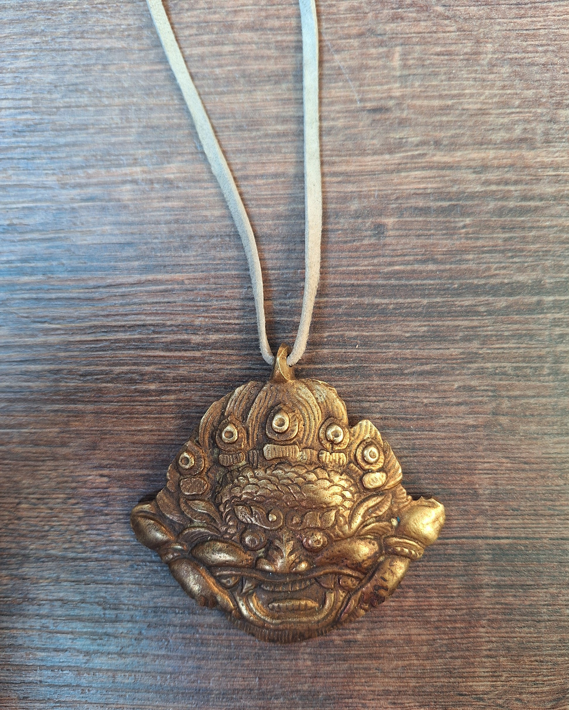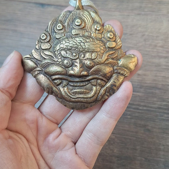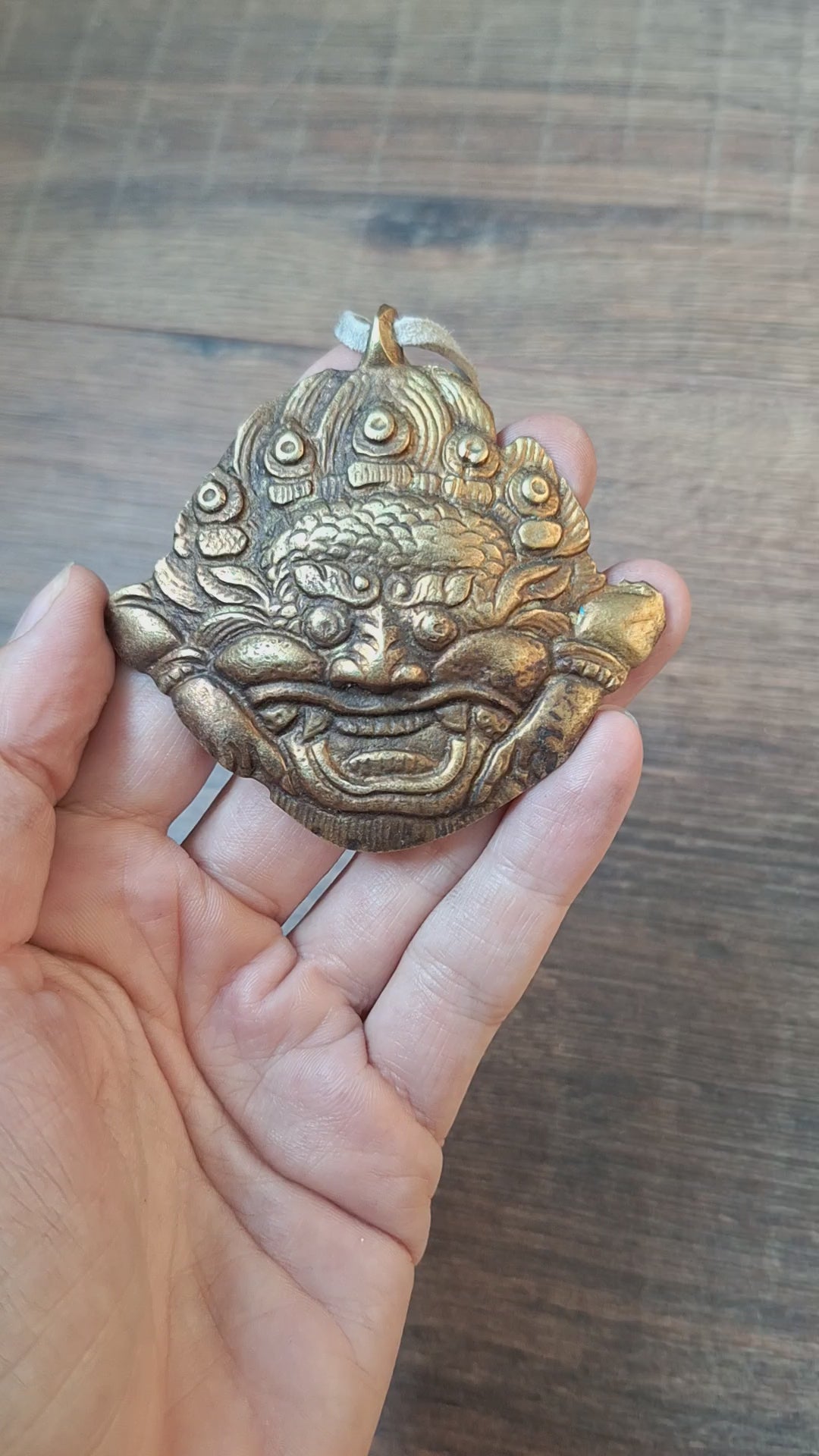 This brass pendant comes from Cheppu's place of origin; Kathmandu. It is from vintage origin, and, as can be seen on the pictures, has built up a mixed layer of debris and patina, but overall it is still in very good condition.