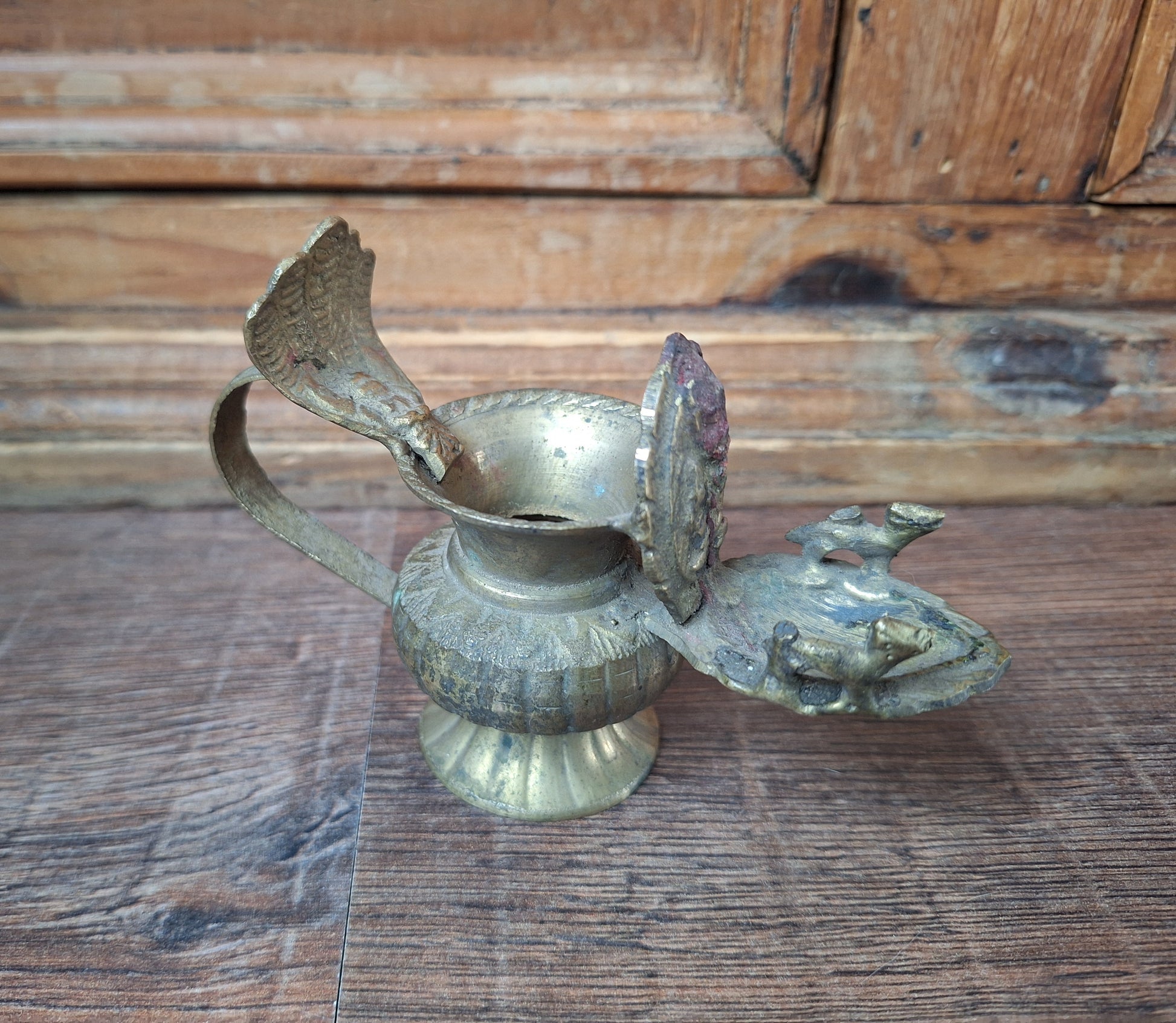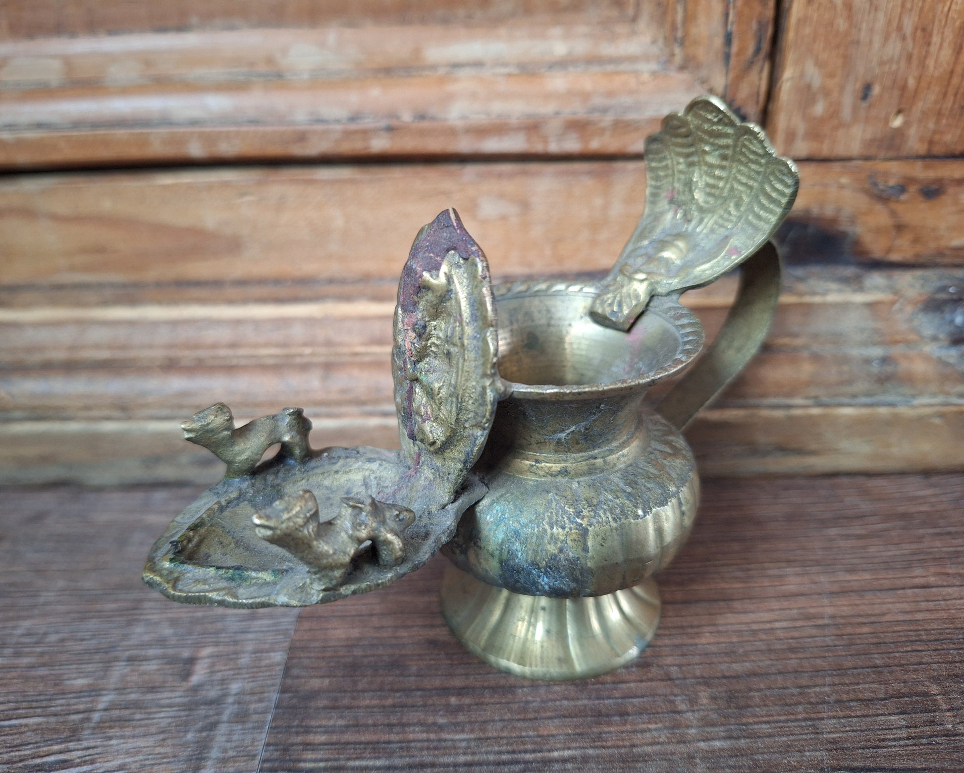 This oil lamp is from vintage origin and clearly shows the signs of its previous usage. As can be seen on the pictures, there's some red residue dripped over Ganesha's depiction; showing the traces of how in previous usages the oil has been ladled from the storage pot into the burner compartment. Also some debris and oxidation has built up over time. This oil lamp has clearly been well used before. A lot of this can probably be cleaned again if you wish to, but for now we chose to keep it like this, to show you some of its history.