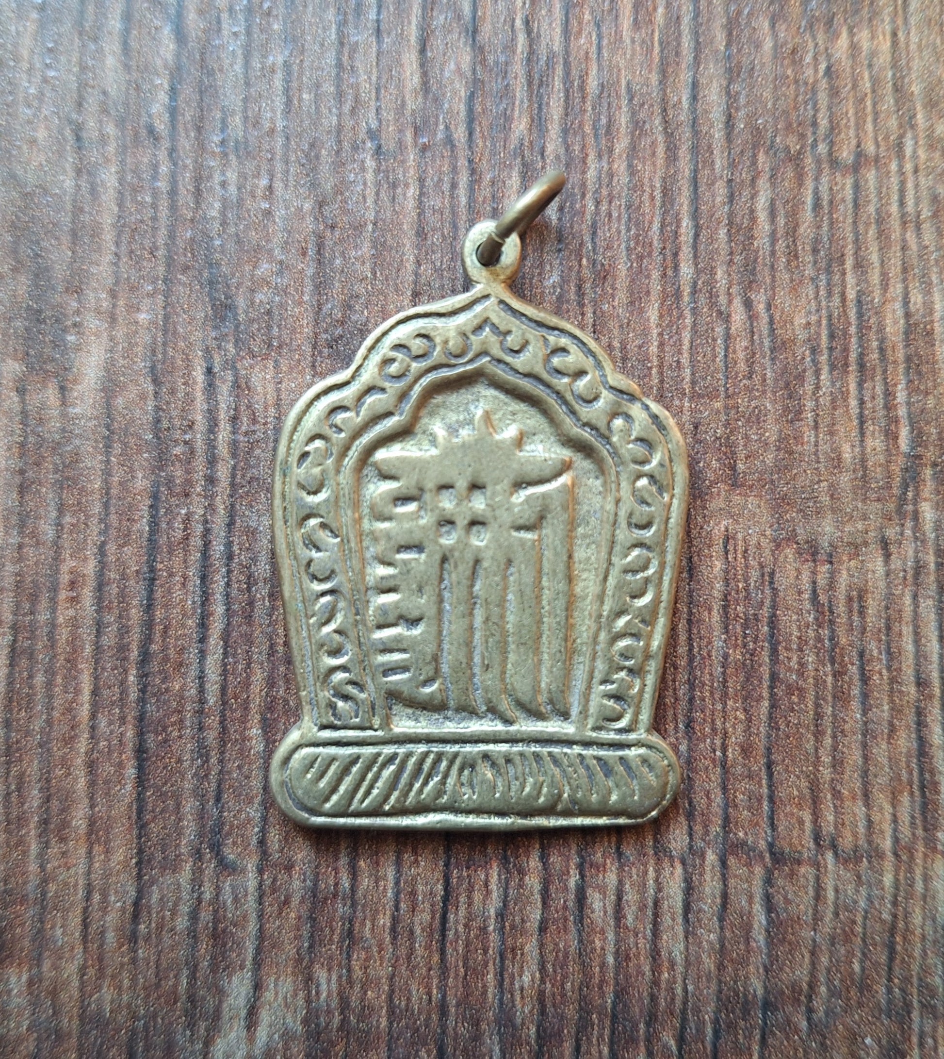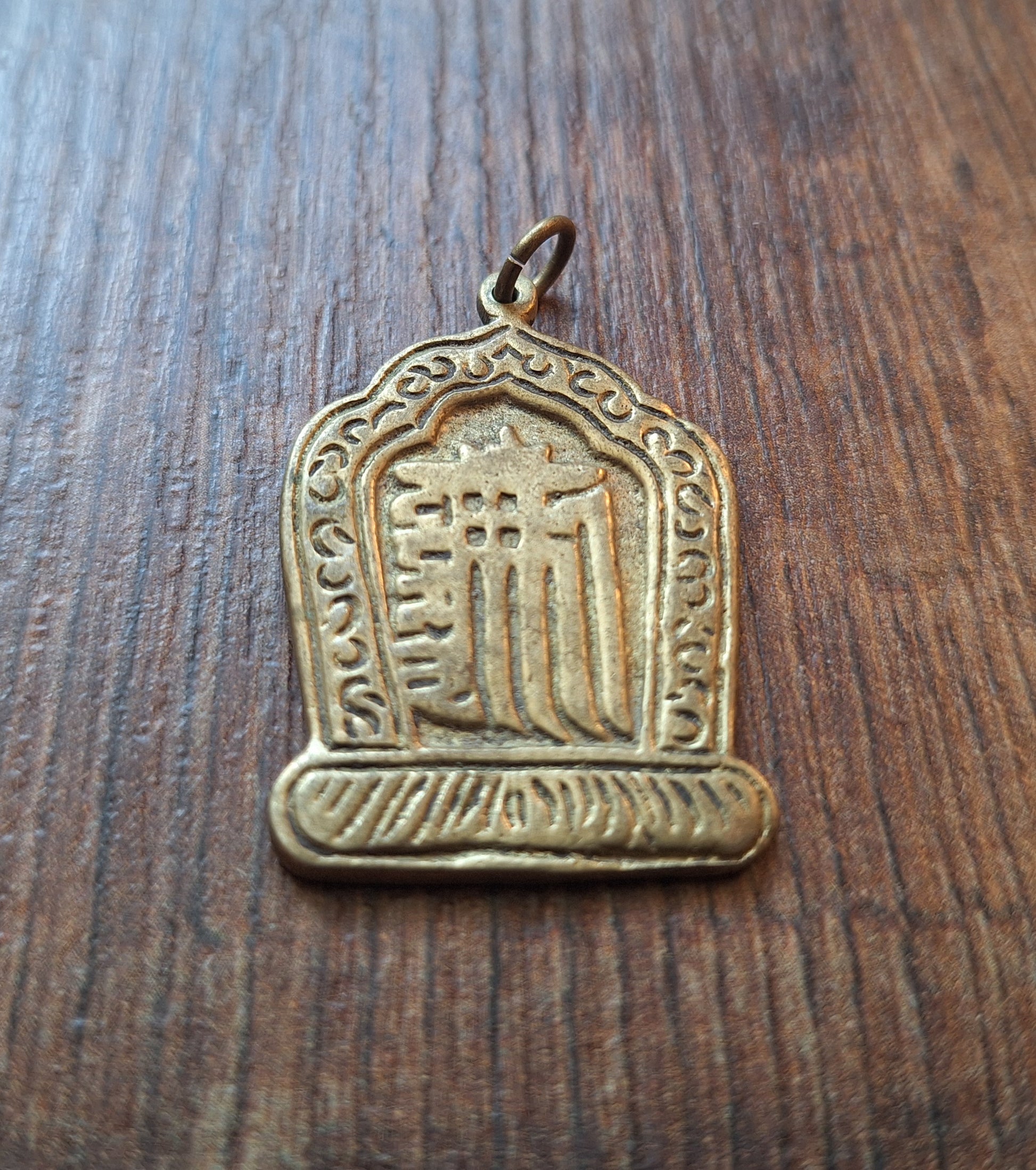 Very nice vintage brass pendant with the depiction of one of the best known symbols of Vajrayana Buddhism; the Kalachakra symbol. The symbol consist of 7 vertical syllables, intertwined with horizontal consonant syllables. And on top of that 3 more symbols; a crescent, a disc and a curved shape (thus making a total of 10 symbols; the Kalachakra symbol is therefore also known as the'Tenfold Powerful One').
